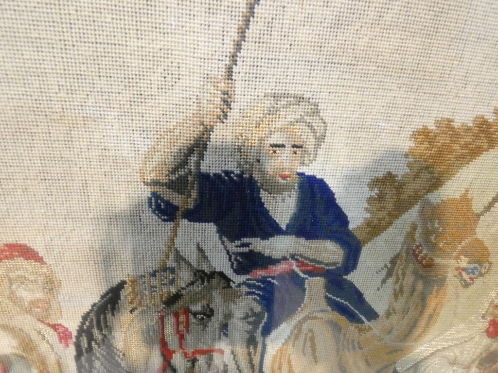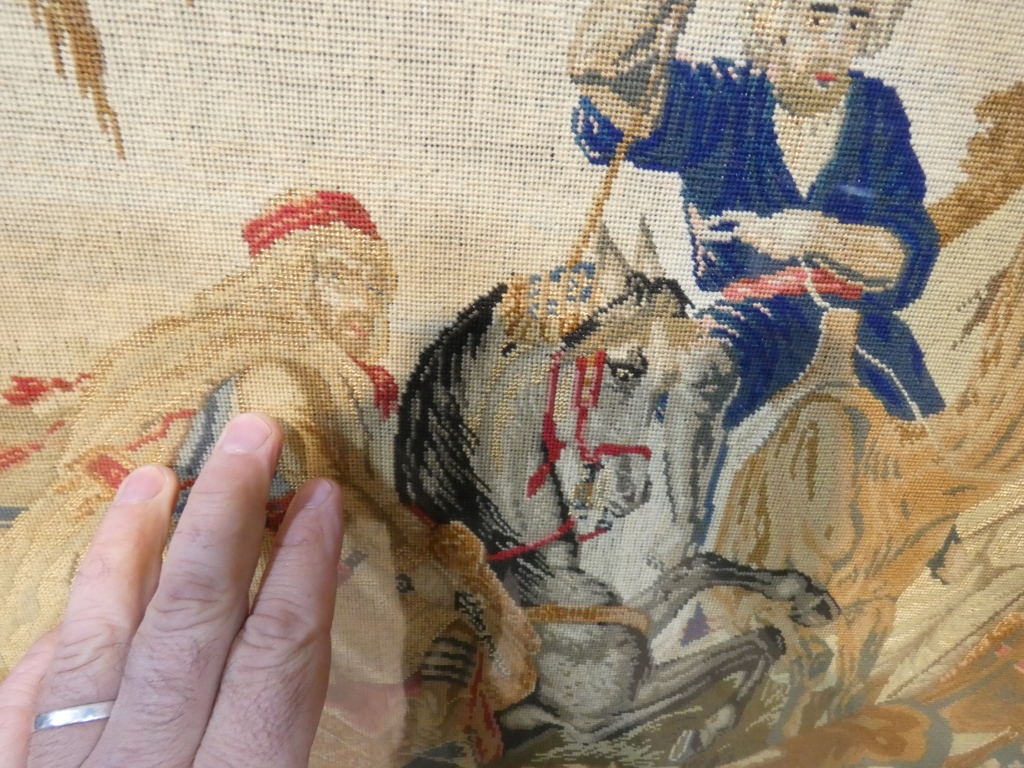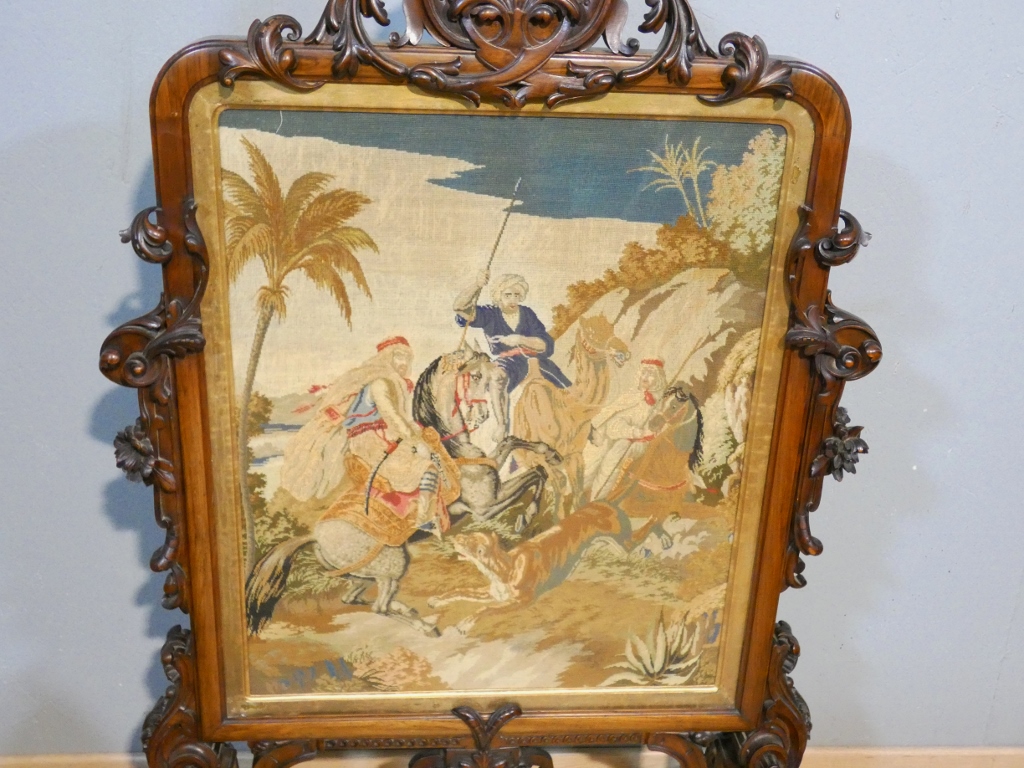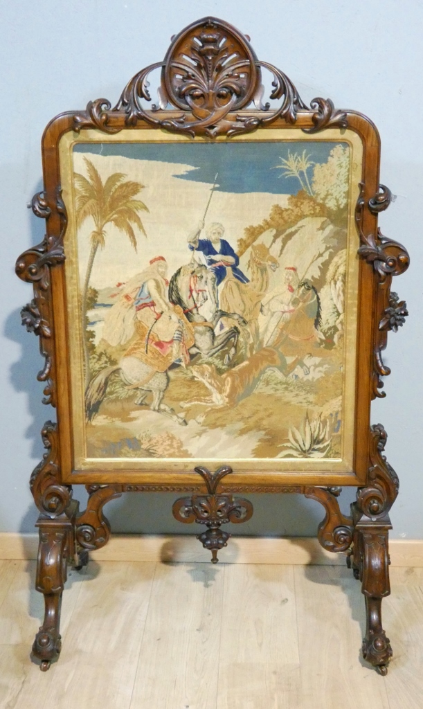 La partie centrale est une tapisserie au petit point à la scène orientaliste, un cavalier arabe et un homme sur un dromadaire.