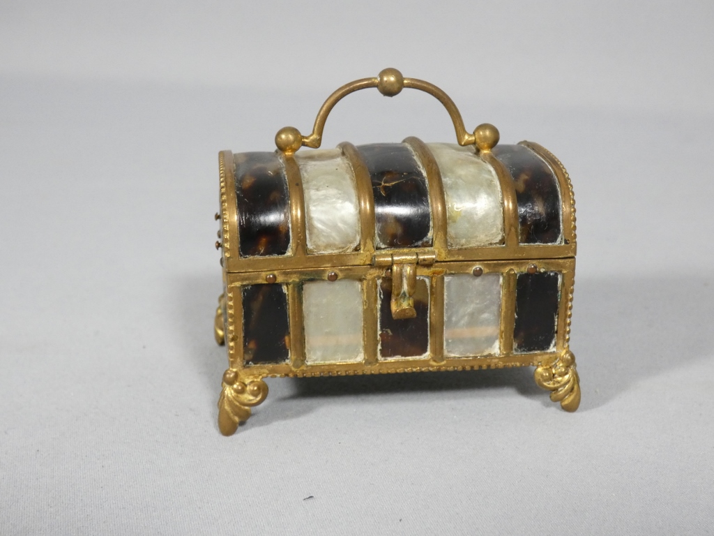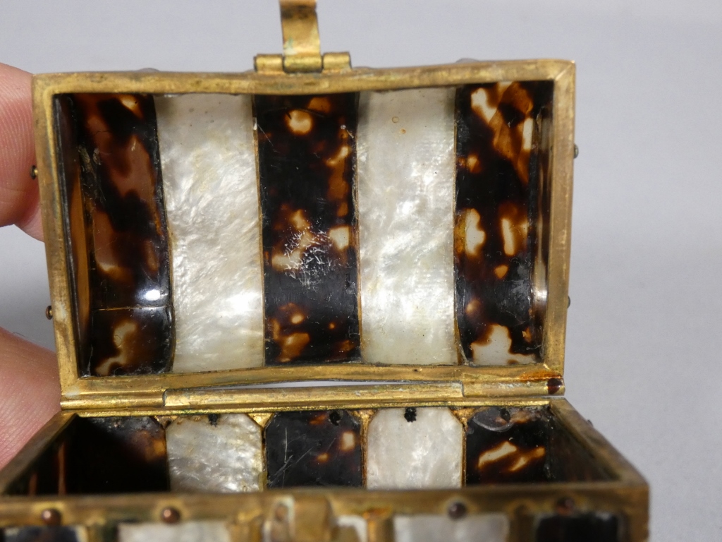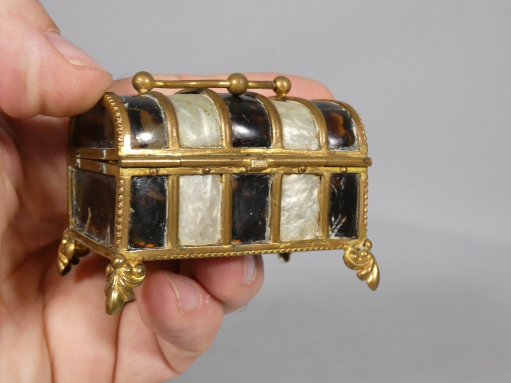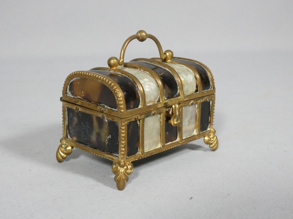 Coffret miniature en forme de coffre de style Renaissance en écaille de tortue et nacre monté laiton.