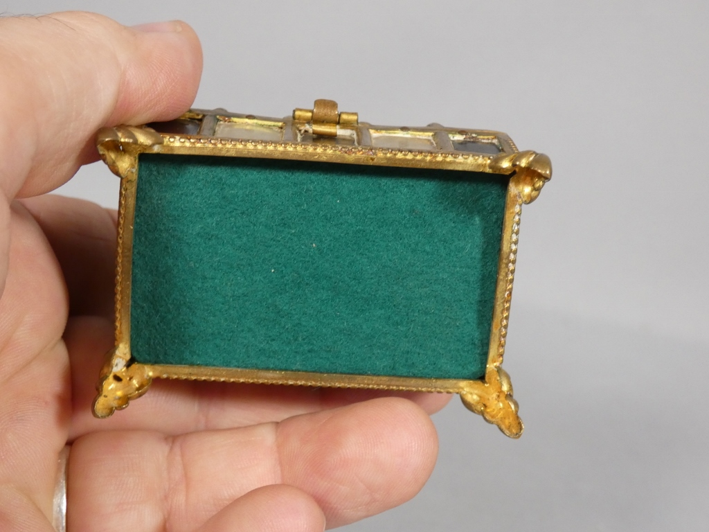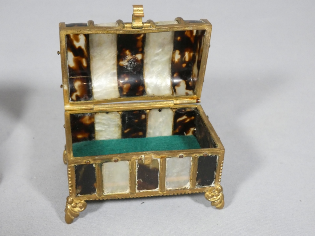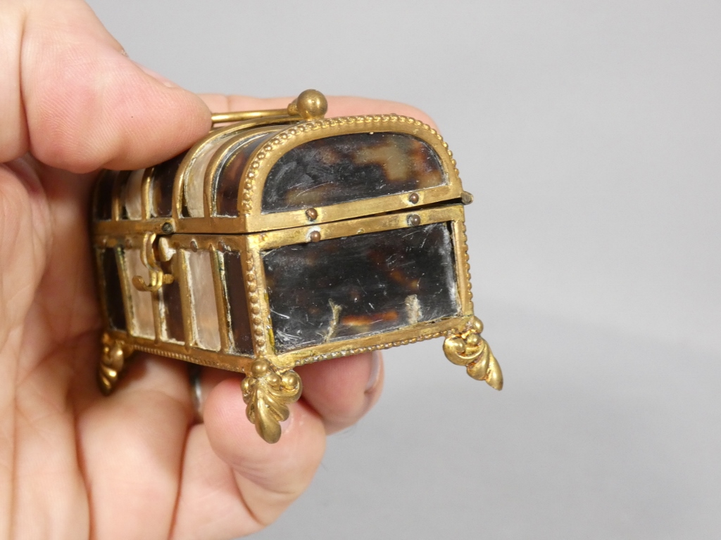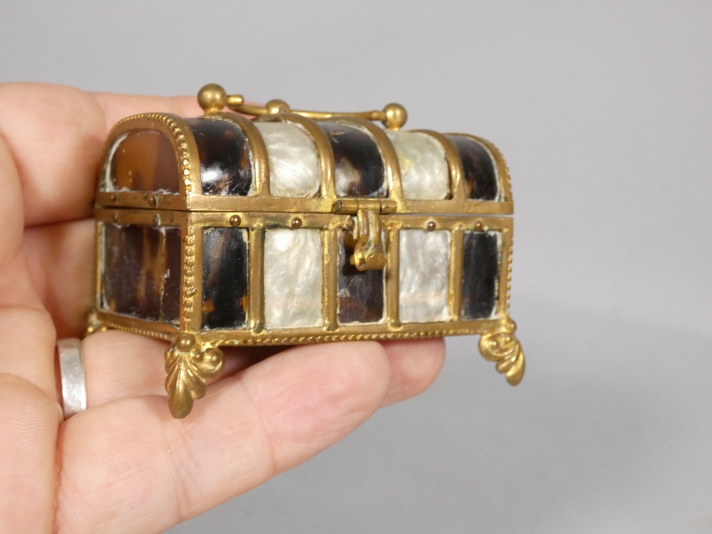 Coffret miniature en forme de coffre de style Renaissance en écaille de tortue et nacre monté laiton.