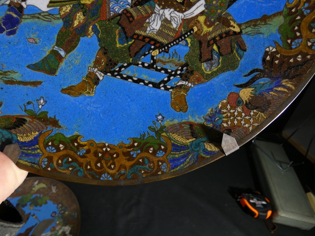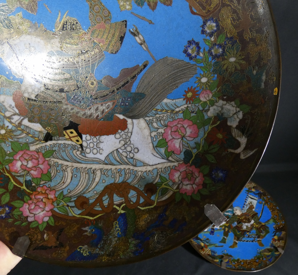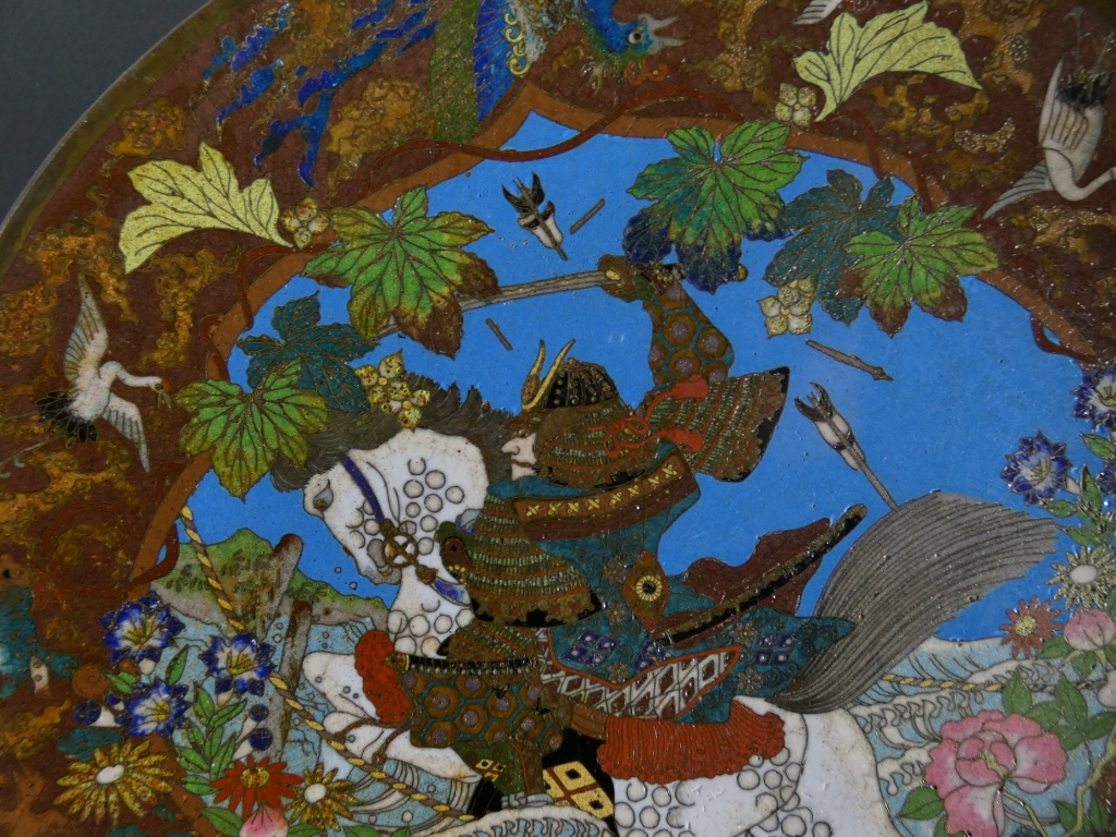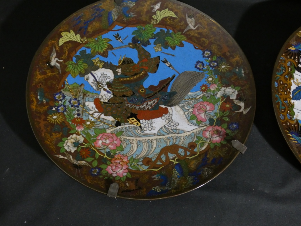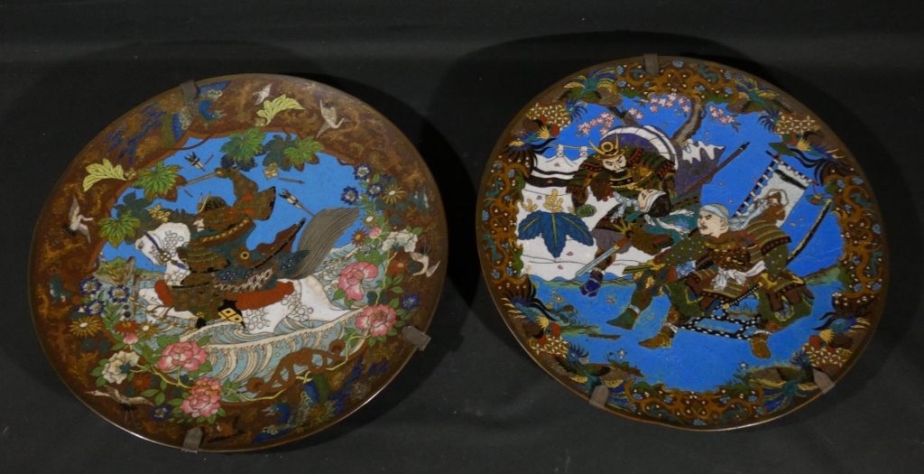 Les samouraïs, paire de plats japonais en émaux cloisonnés sur cuivre, époque Meiji, XIX ème