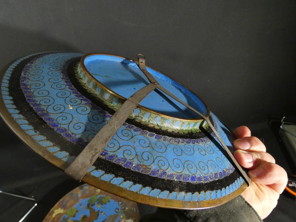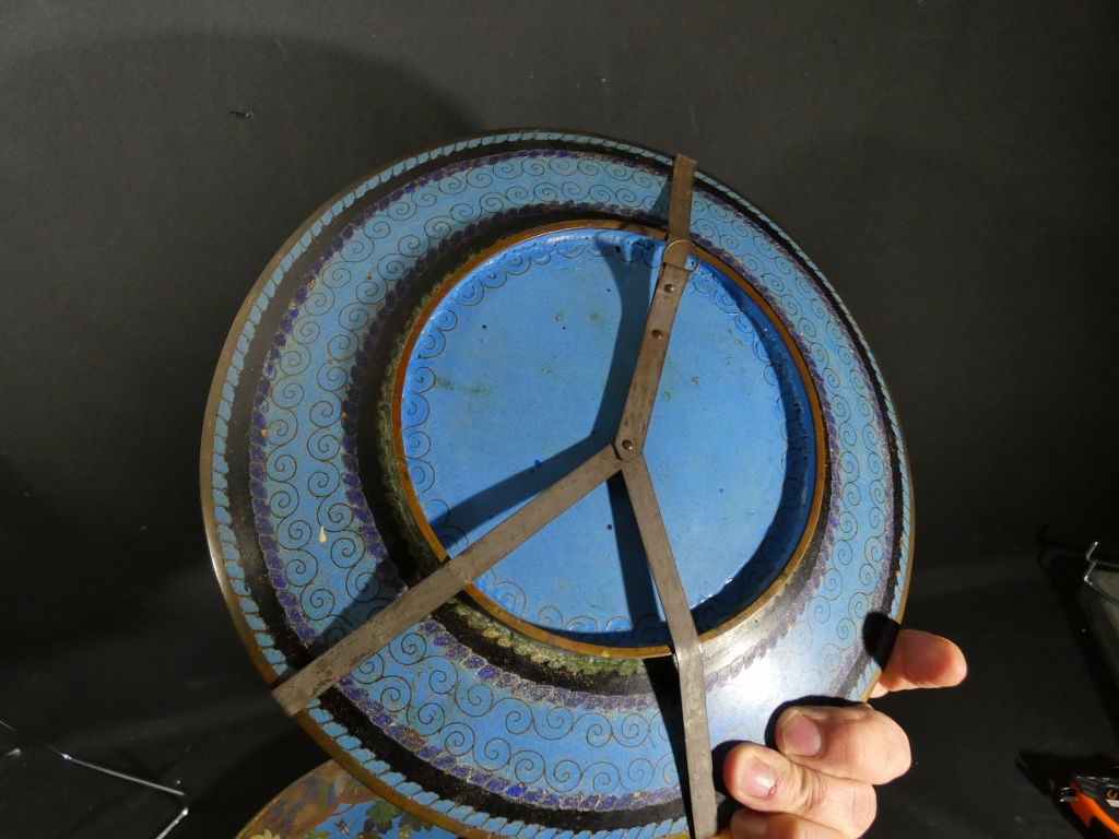 Paire de plats décoratifs en émail cloisonné sur cuivre avec des scènes aux samouraïs.