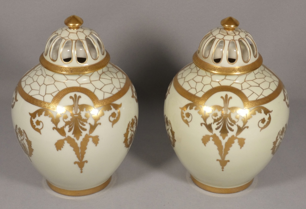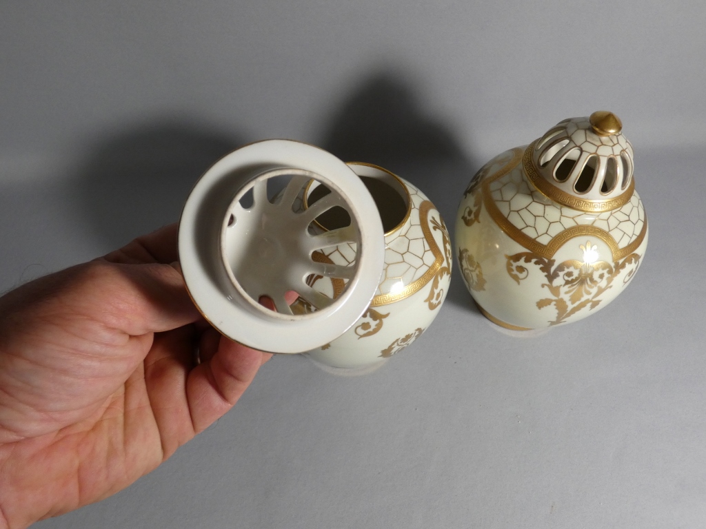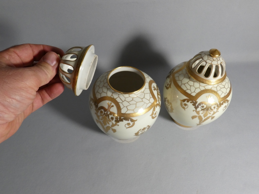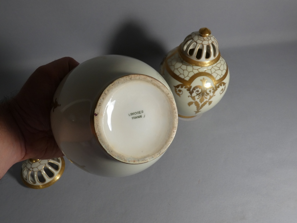 Paire de pots pourris ou brûle parfum en porcelaine de Limoges blanche et or, époque début XX è
