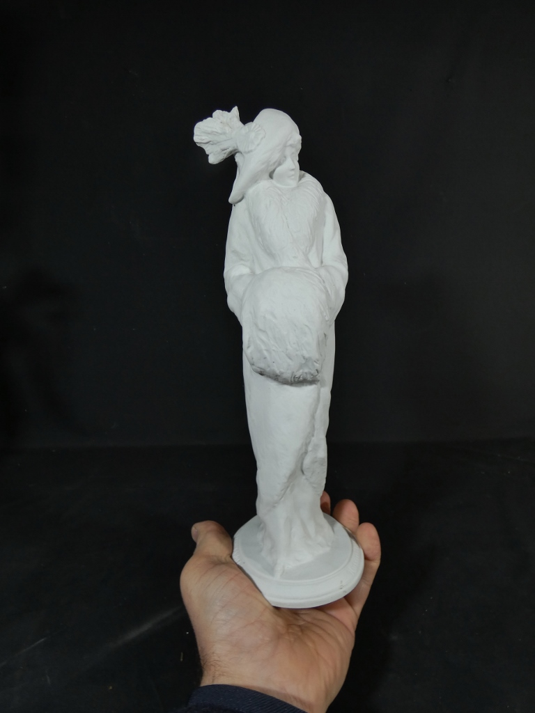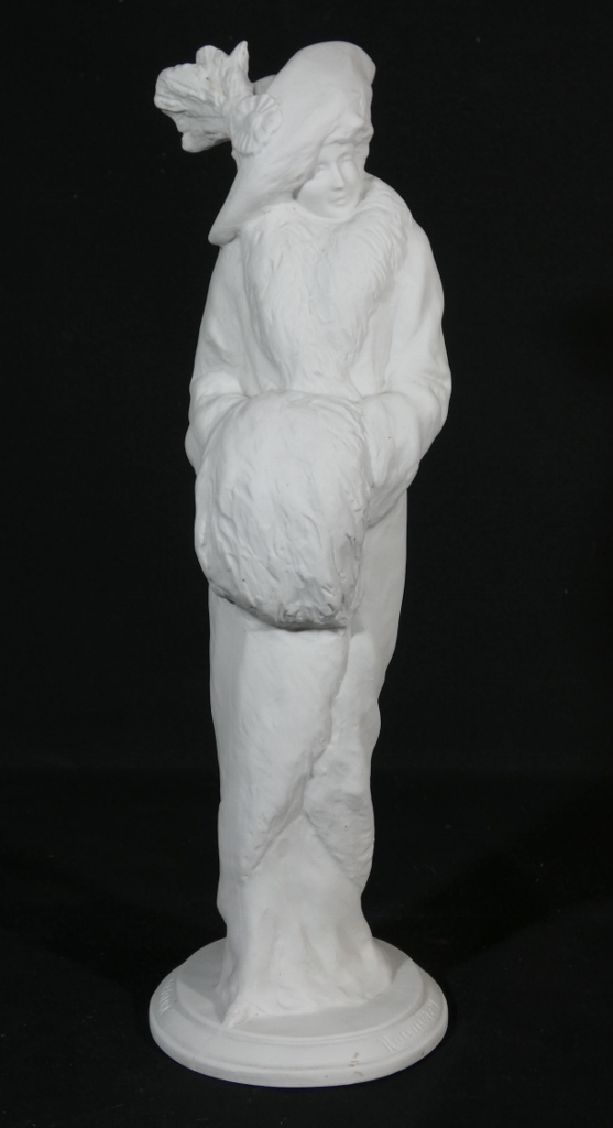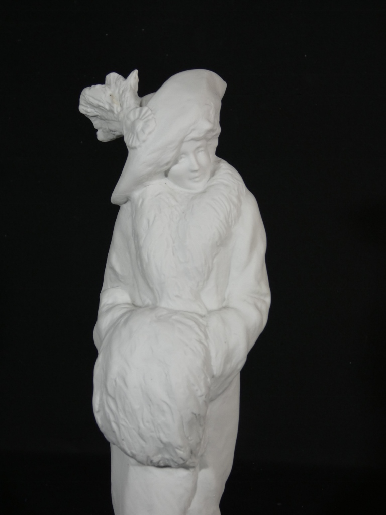 Rare sujet d’époque Art Nouveau représentant une femme élégante en fourrure et manchon.