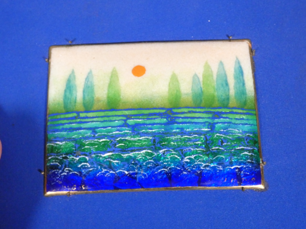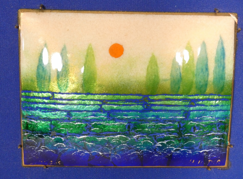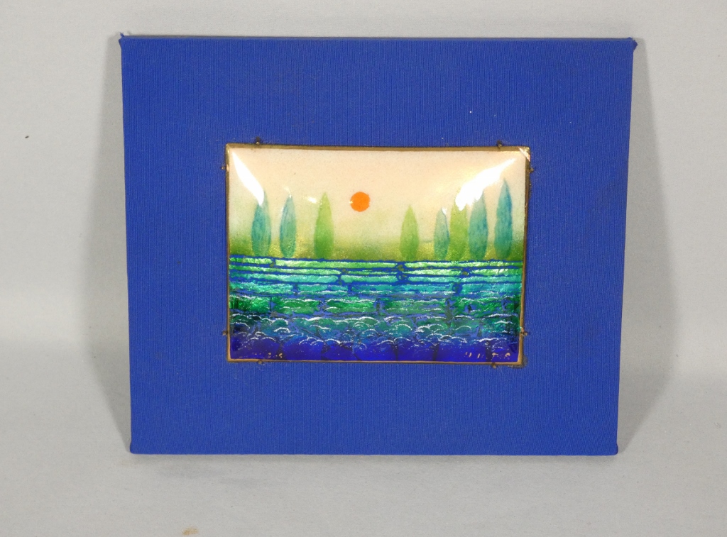 Charmant tableau en émail de Limoges sur cuivre représentant un paysage naïf avec des arbres en fond, le soleil rouge au milieu et peut être un champ de lavande au premier plan.