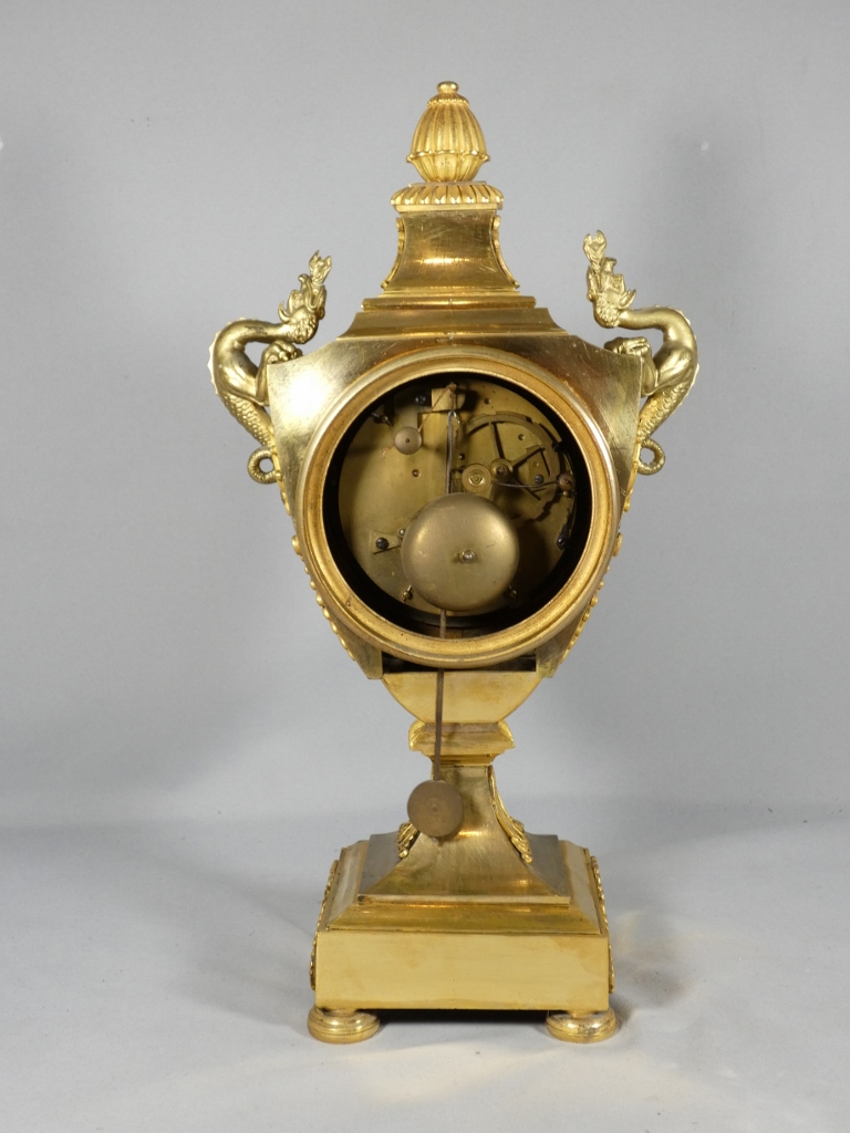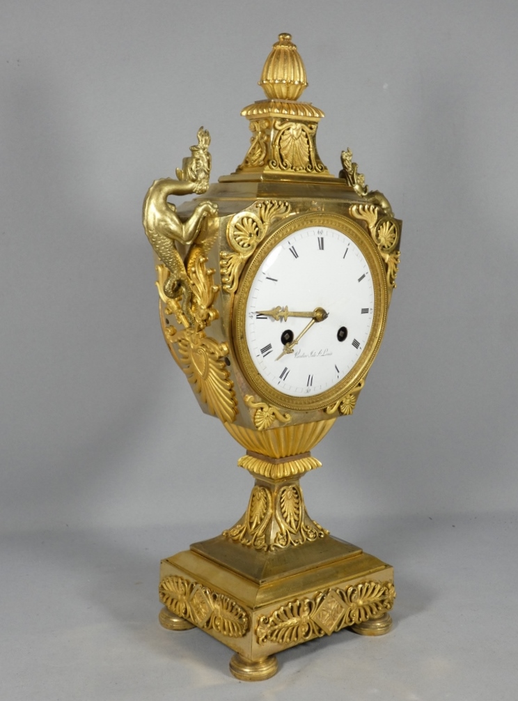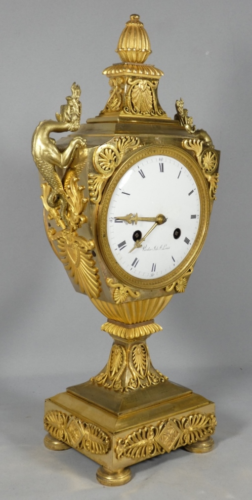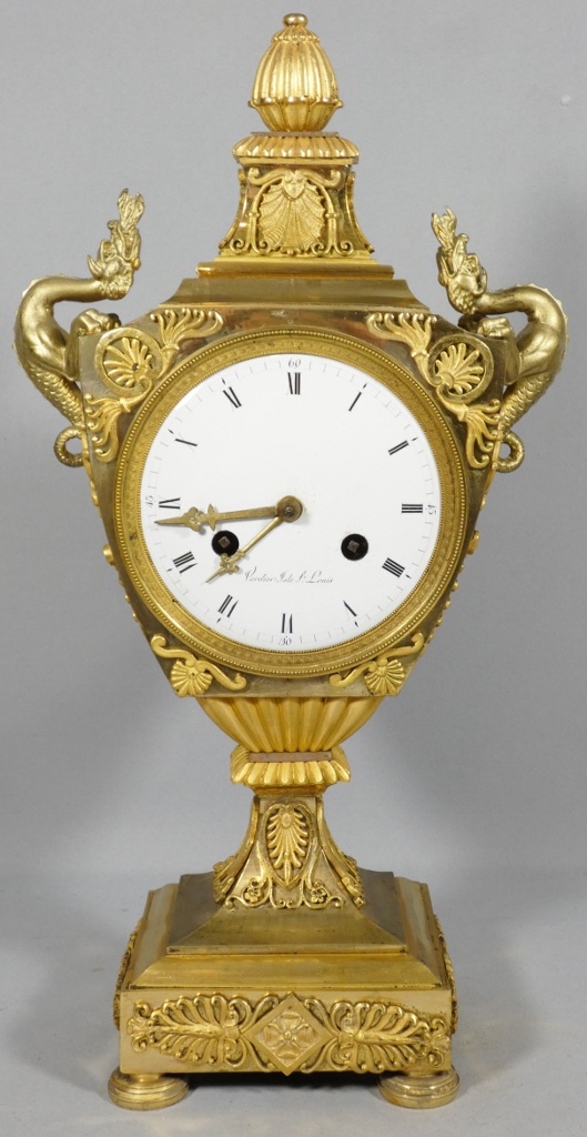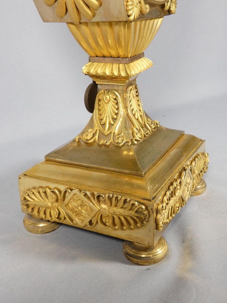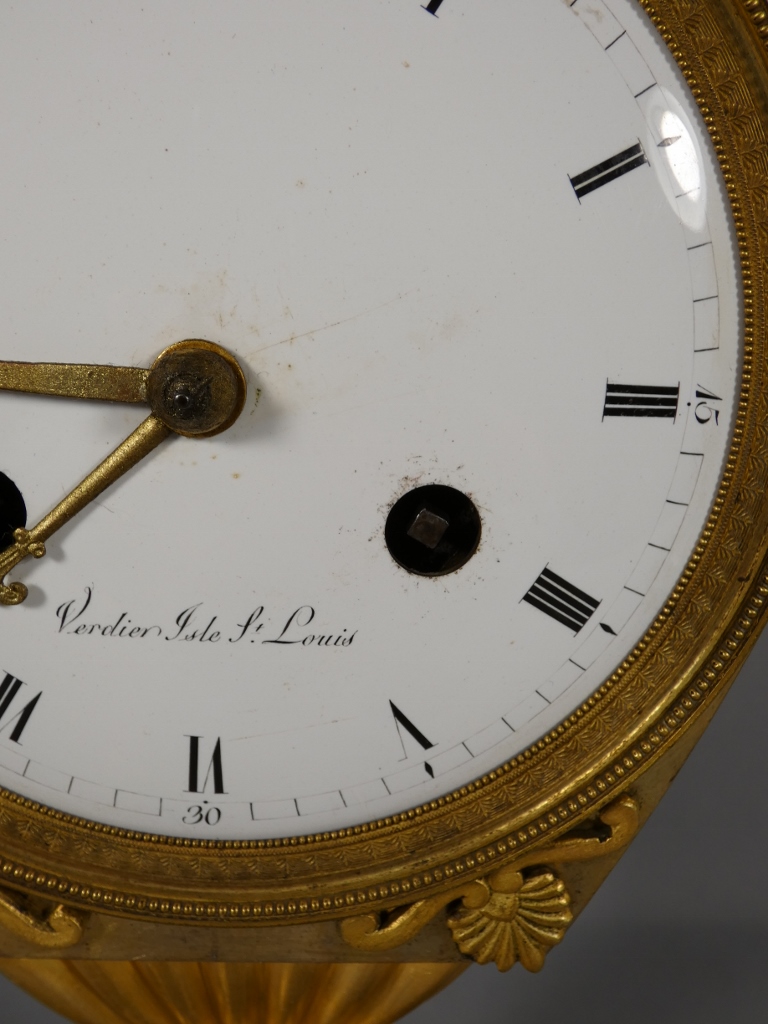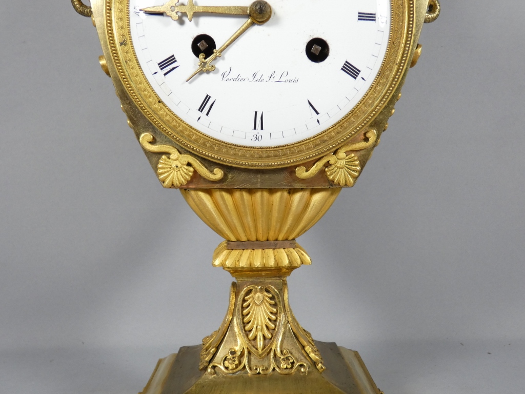 Pendule Empire en bronze doré forme vase ou écusson, Verdier Isle St Louis, époque 1810-1815