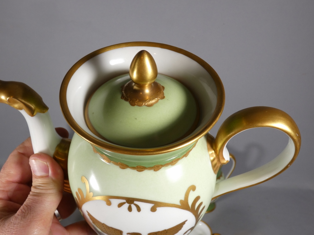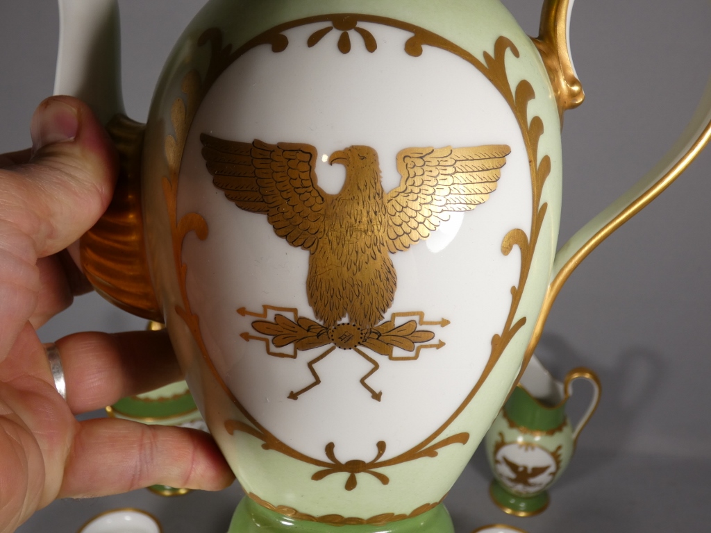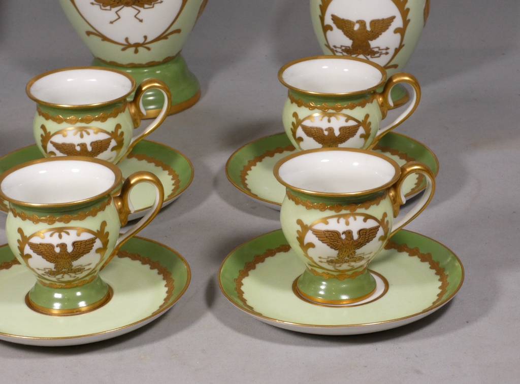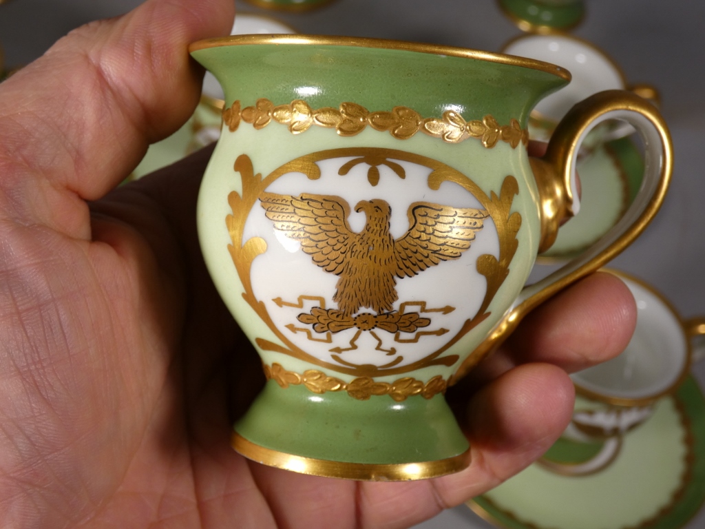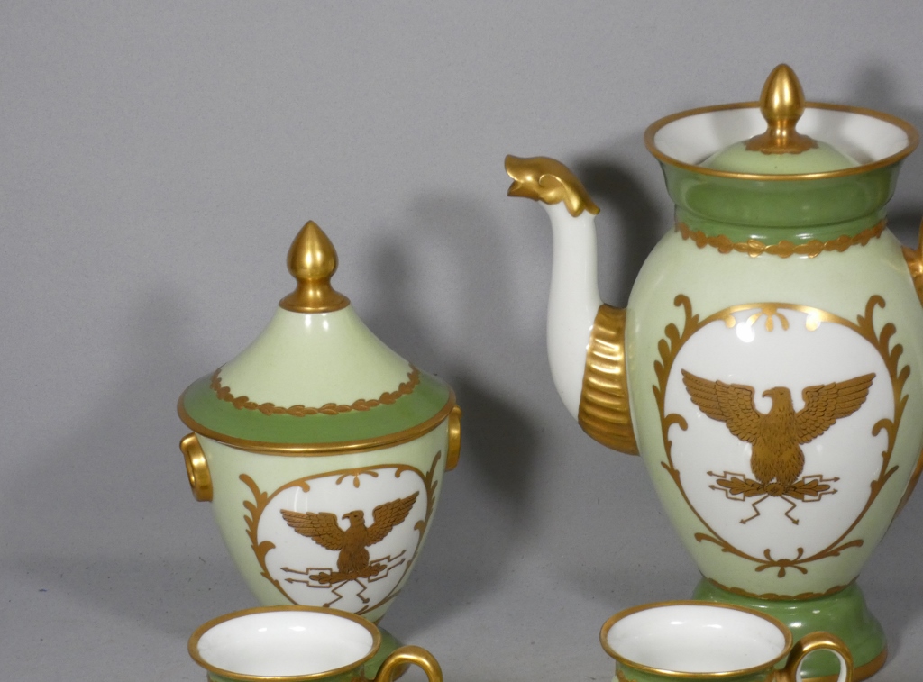 De style Empire, ce service est orné de l’aigle impérial doré en réserve blanc sur fond vert clair.