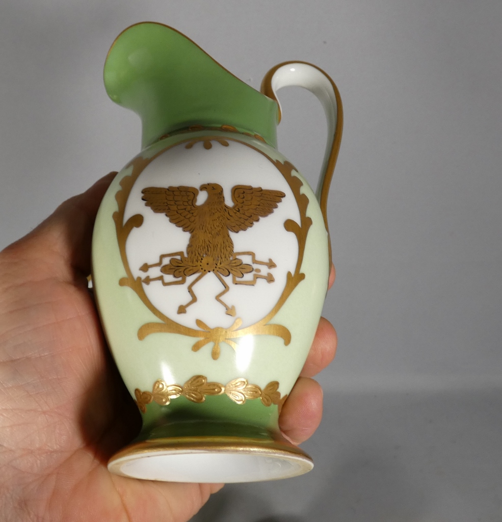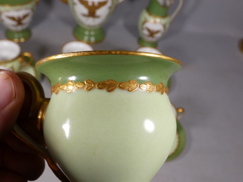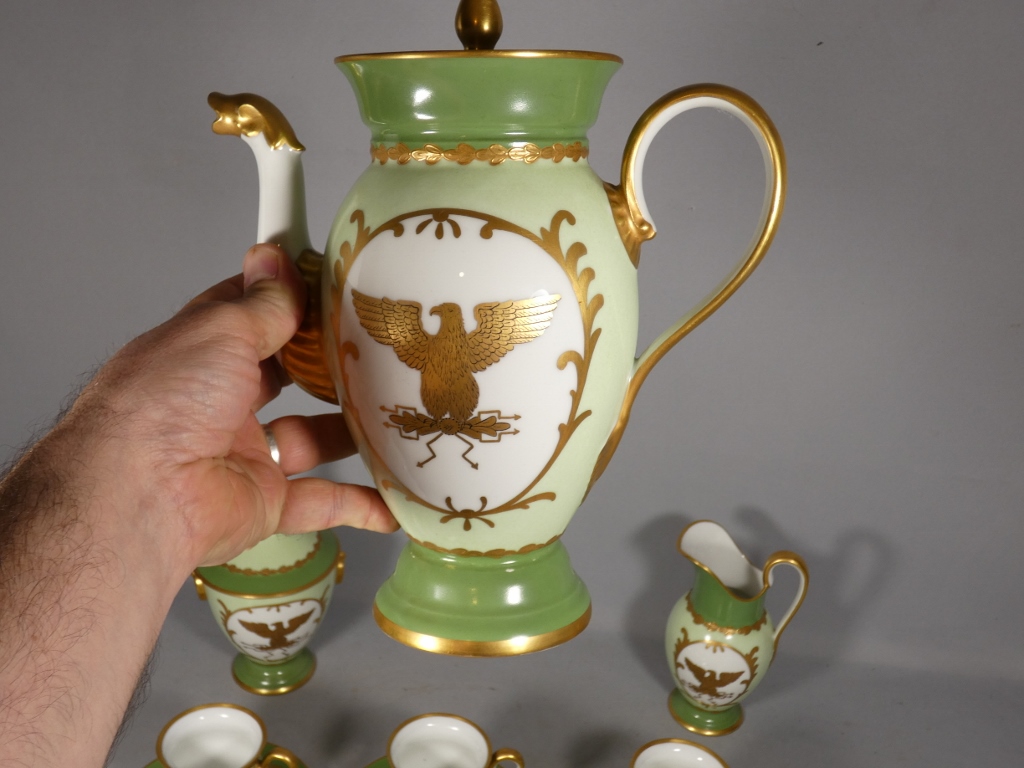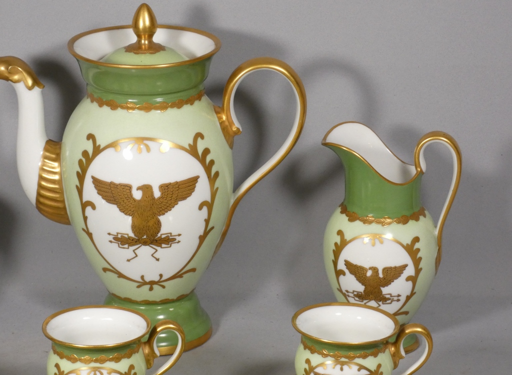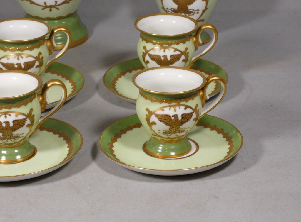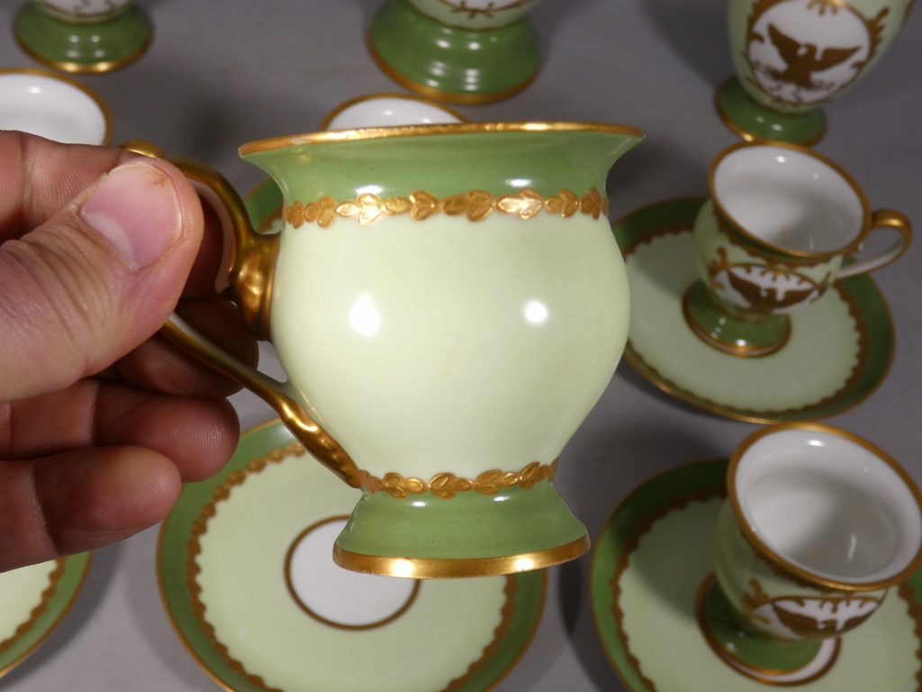 De style Empire, ce service est orné de l’aigle impérial doré en réserve blanc sur fond vert clair.