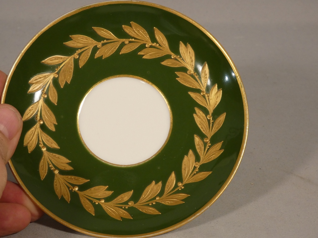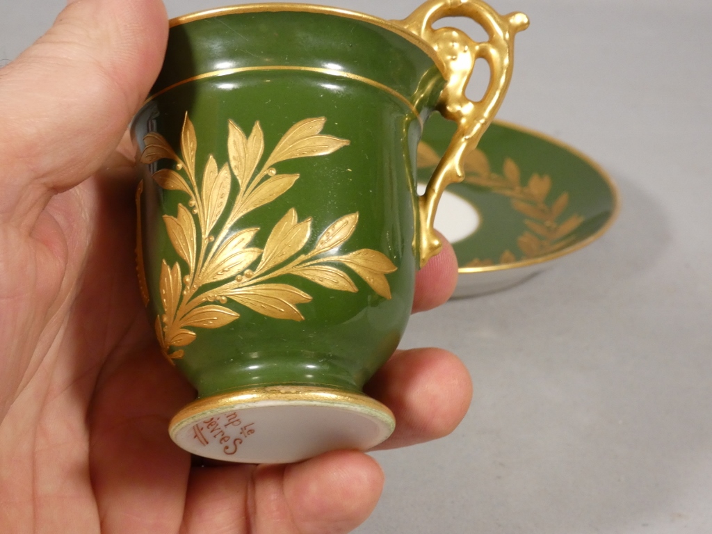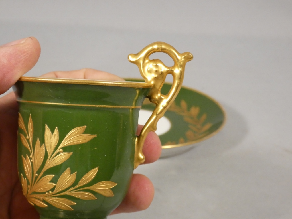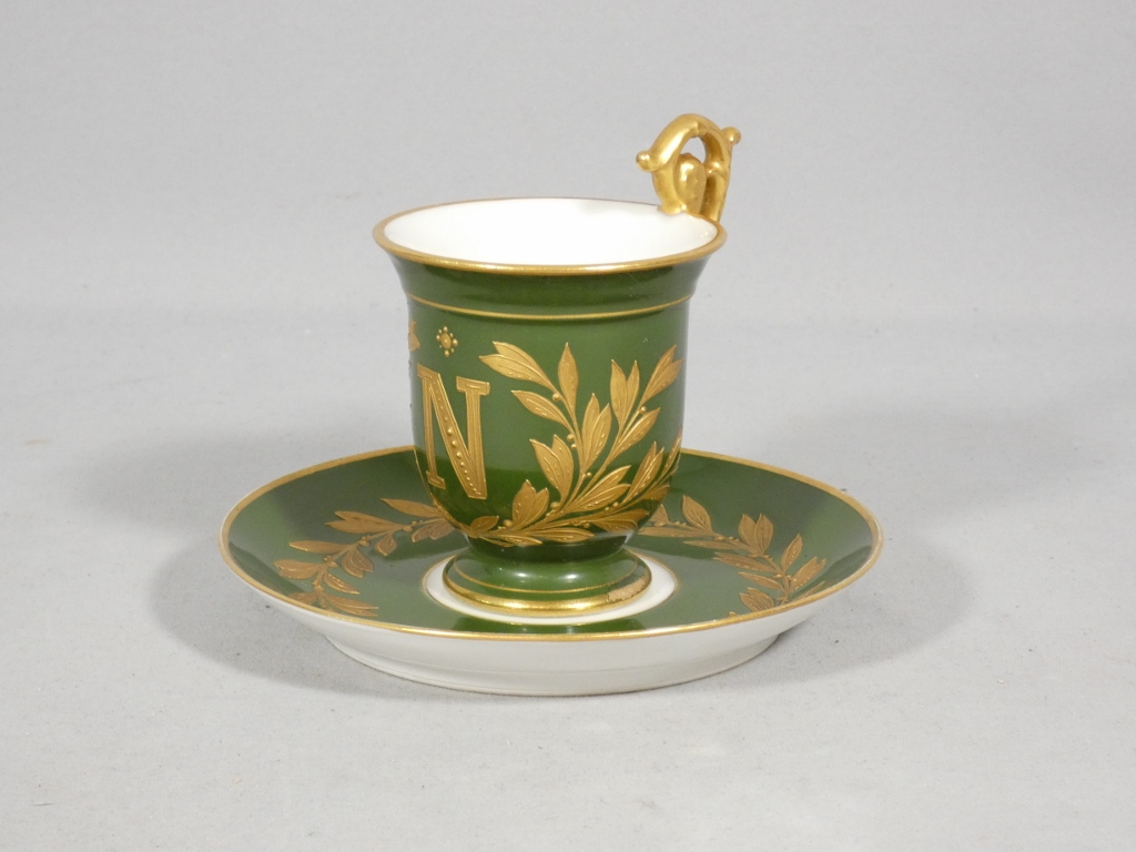 Tasse de style Empire au N impérial en porcelaine verte et doré, époque XIX ème