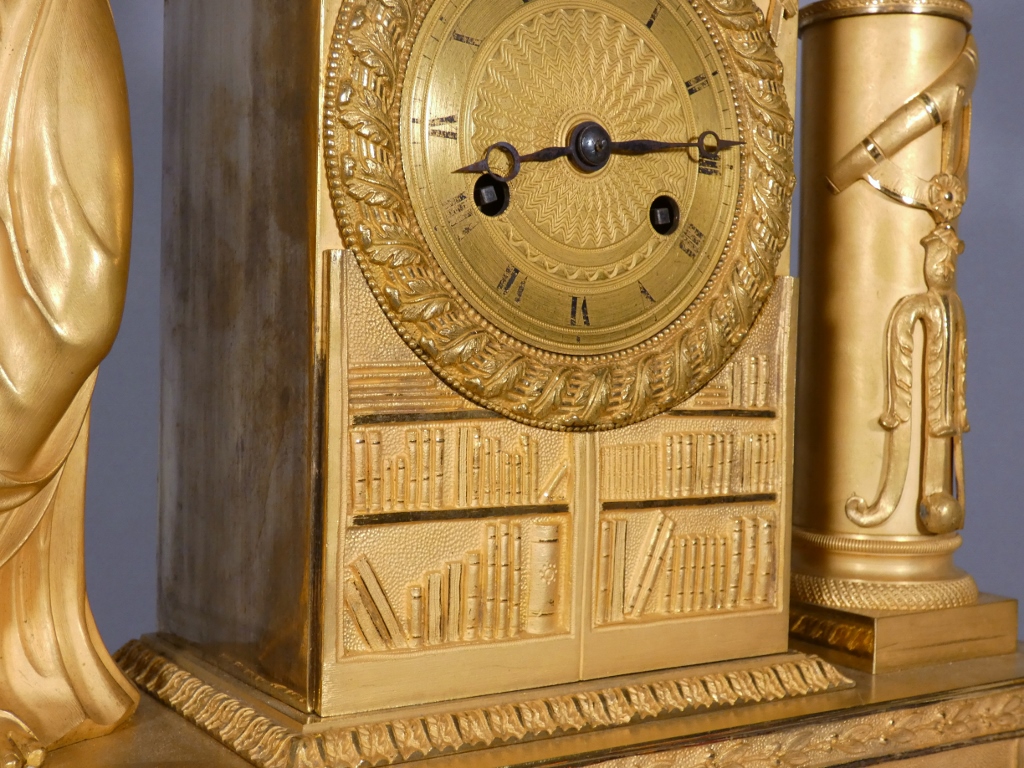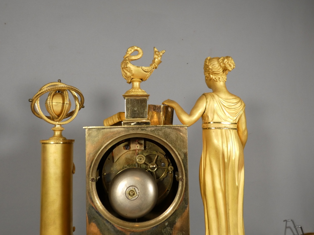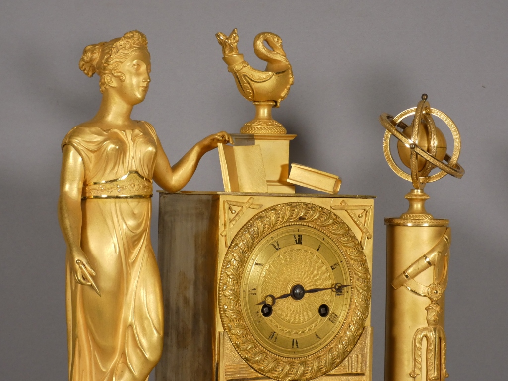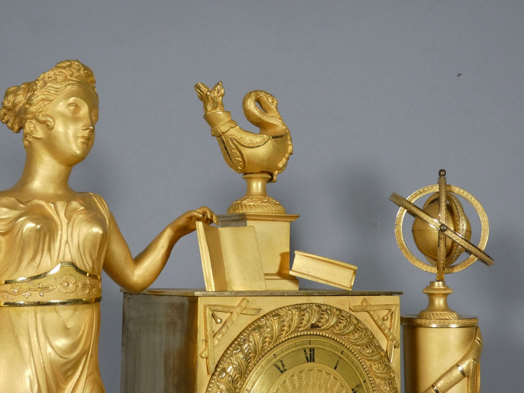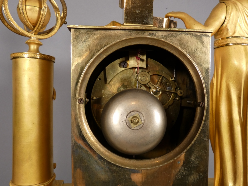 Superbe ciselure et dorure au mercure pour cette grande pendule d’époque Empire représentant Uranie, Muse de l’astronomie.