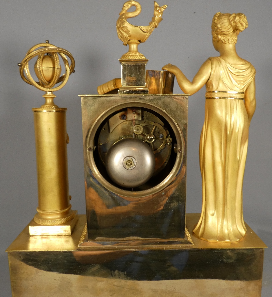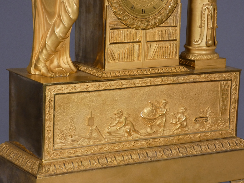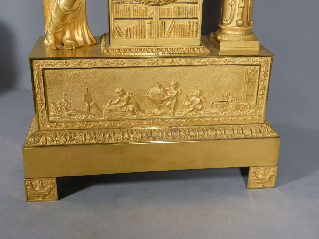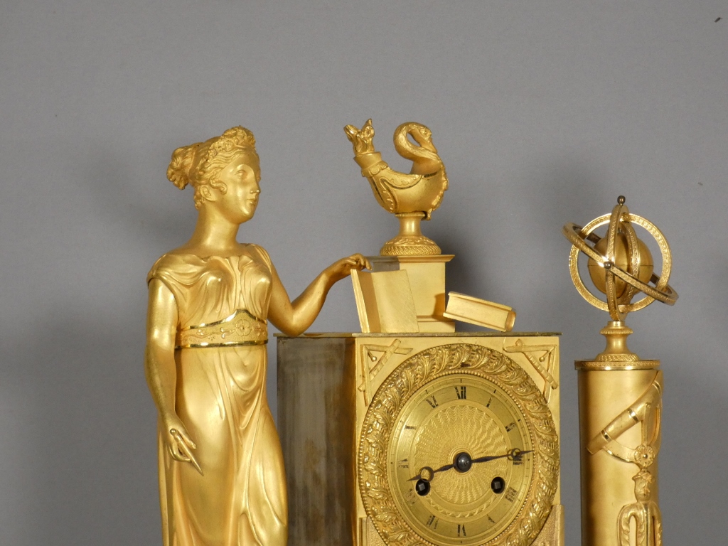 Superbe ciselure et dorure au mercure pour cette grande pendule d’époque Empire représentant Uranie, Muse de l’astronomie.