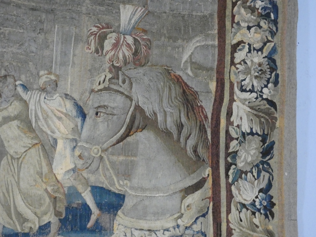 Aubusson XVII ème siècle, grande tapisserie avec personnages et cheval en laine