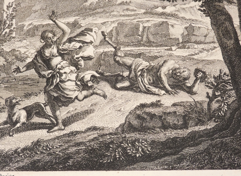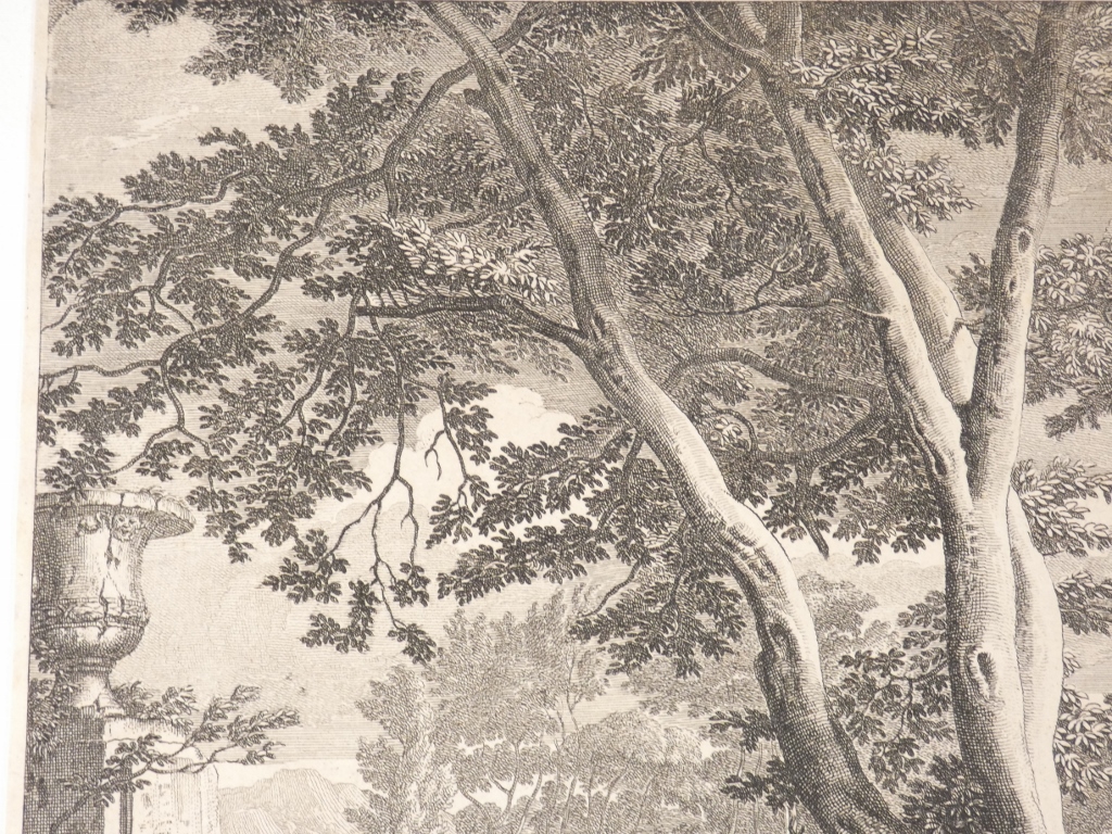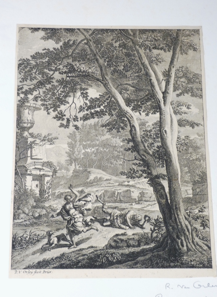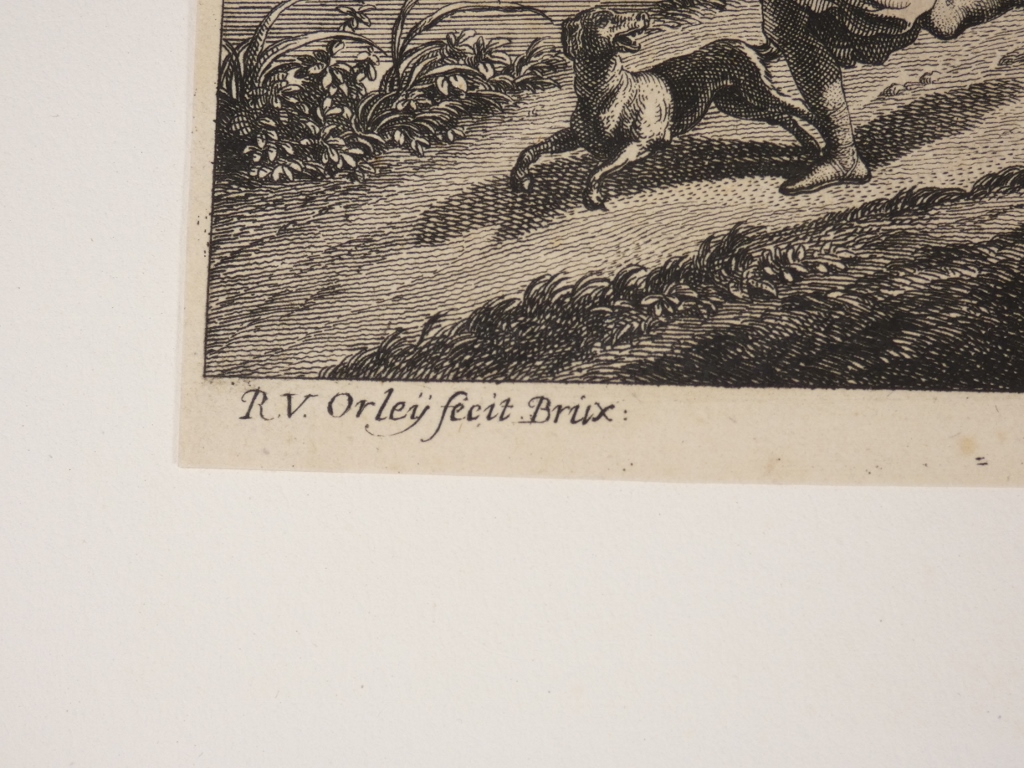La Fuite de Corisca, ca. 1695 – 1705 par Richard Van Orley, gravure à l’eau forte époque XVII è