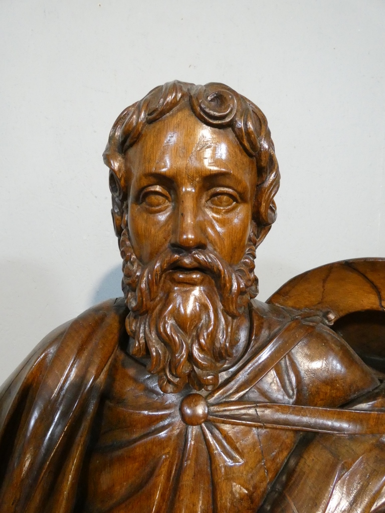 La tête de l’homme est très finement sculptée avec un très beau travail de barbe et de cheveux.