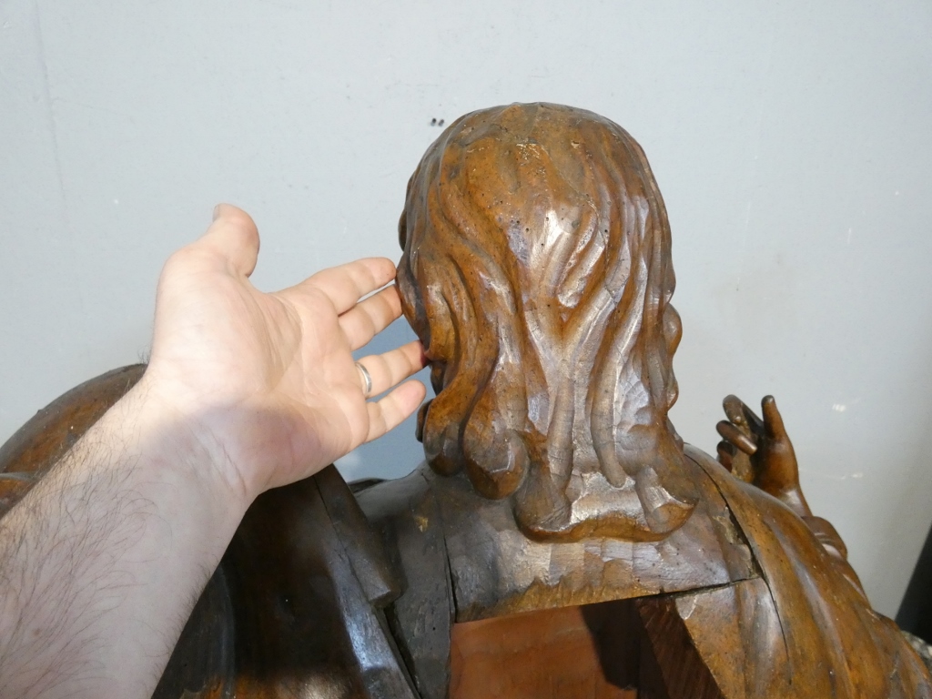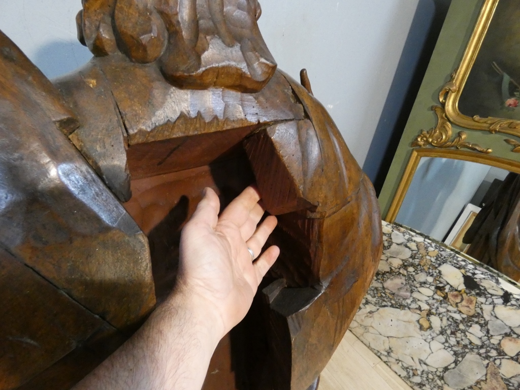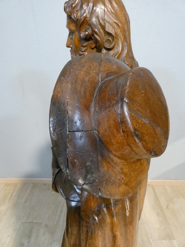 La sculpture principale est dans un seul morceau de bois, les bras et chapeau rapportés.