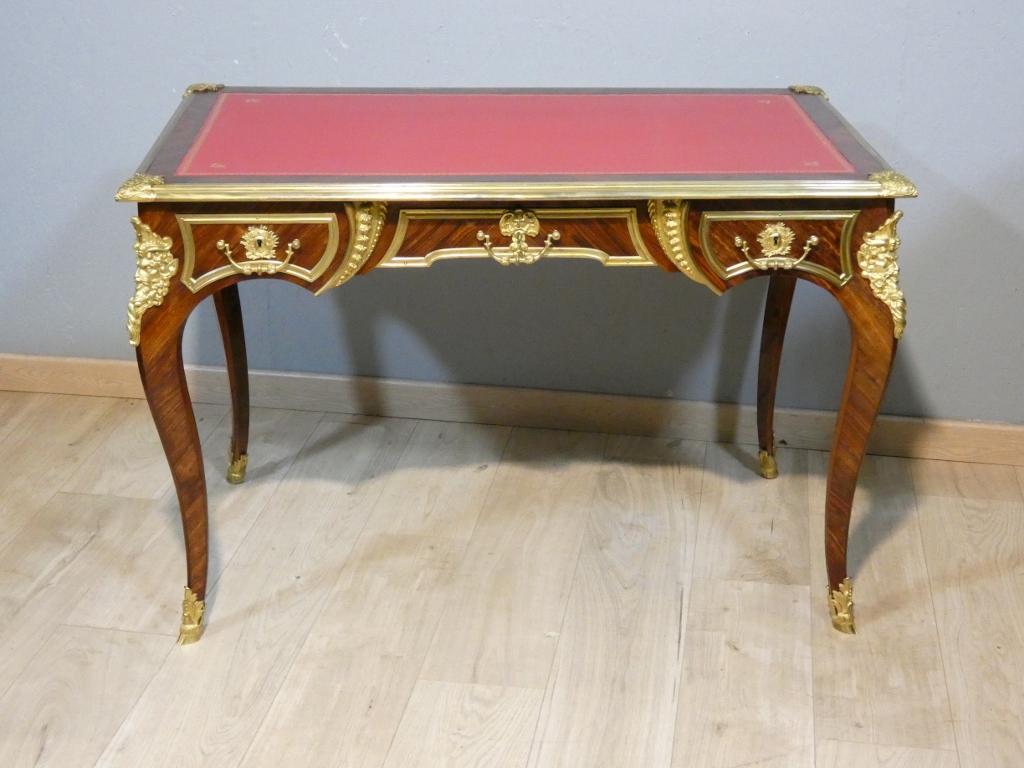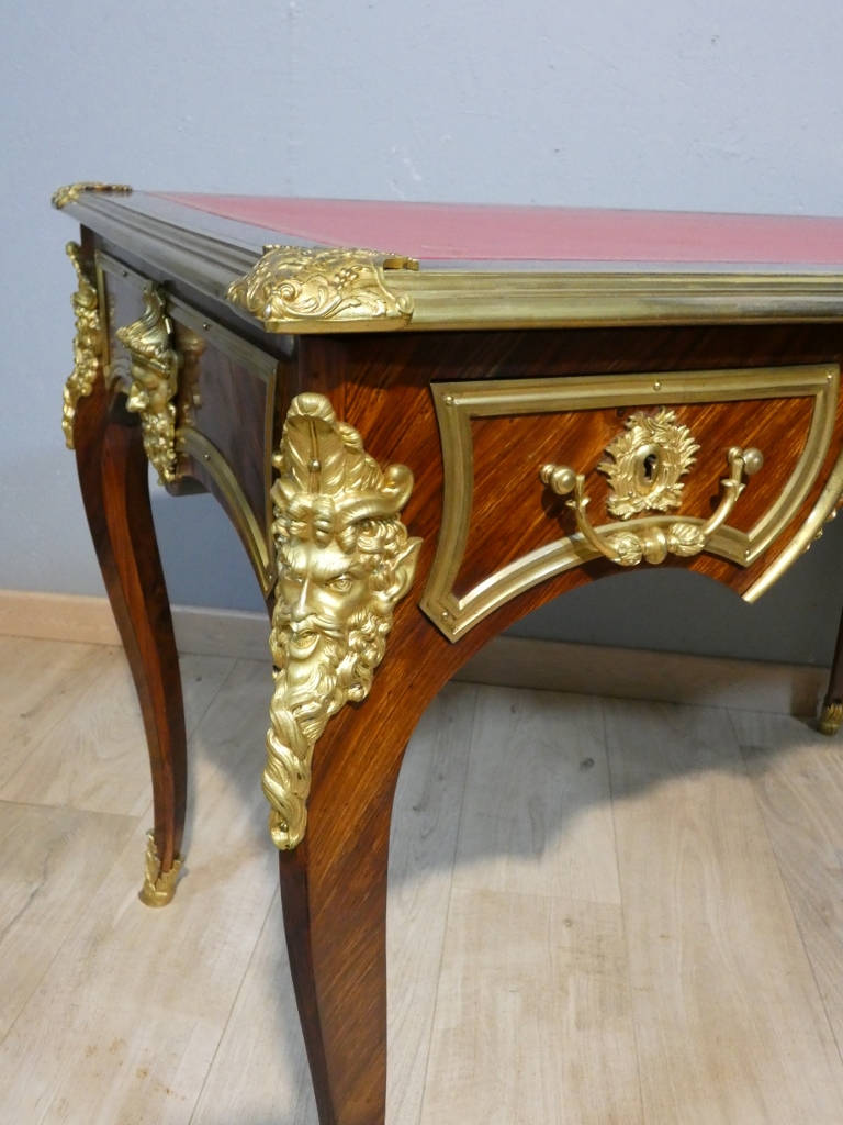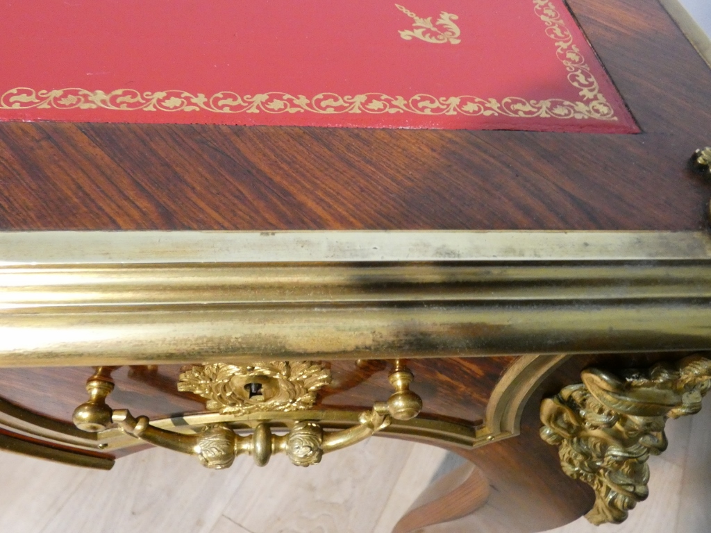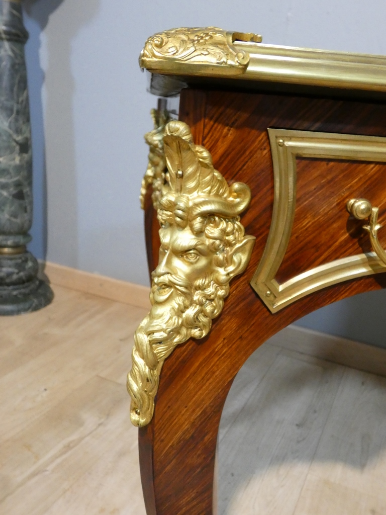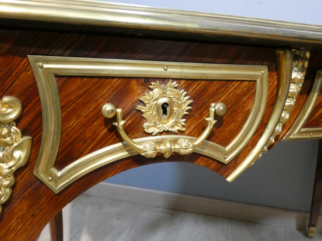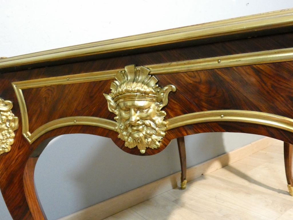 Il s’agit d’un bureau en placage de palissandre magnifié par une superbe garniture de bronzes doré.