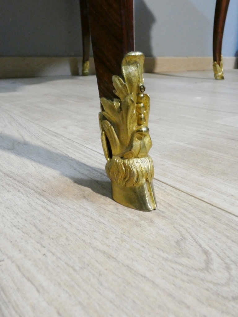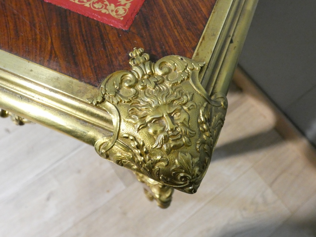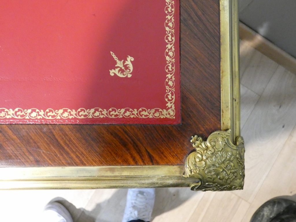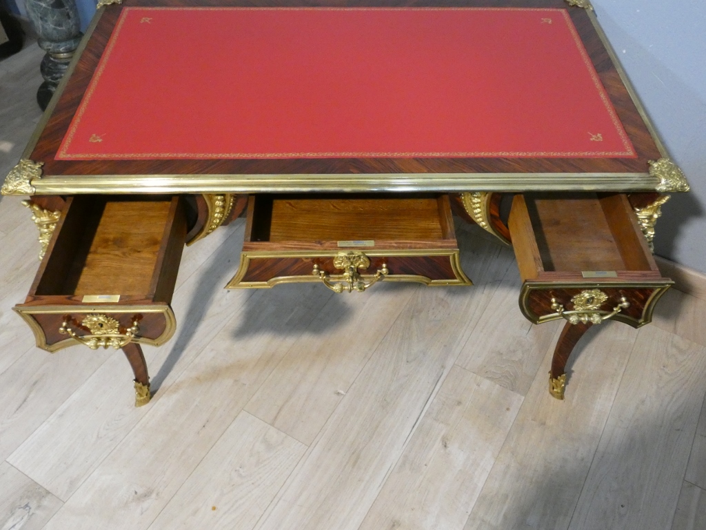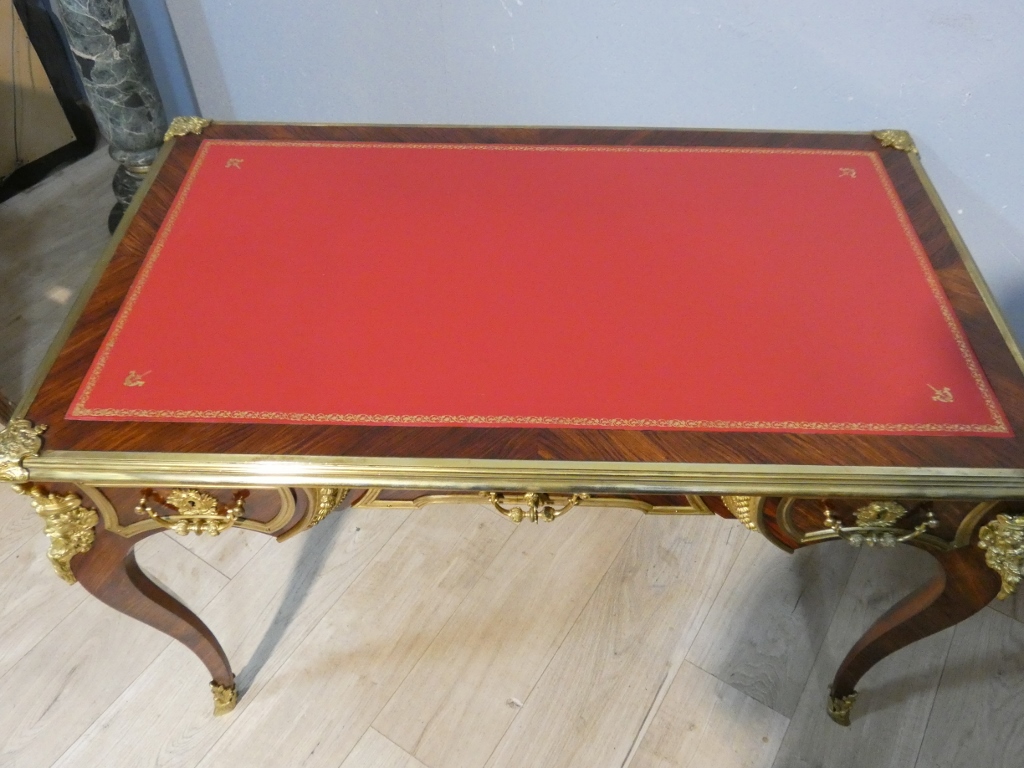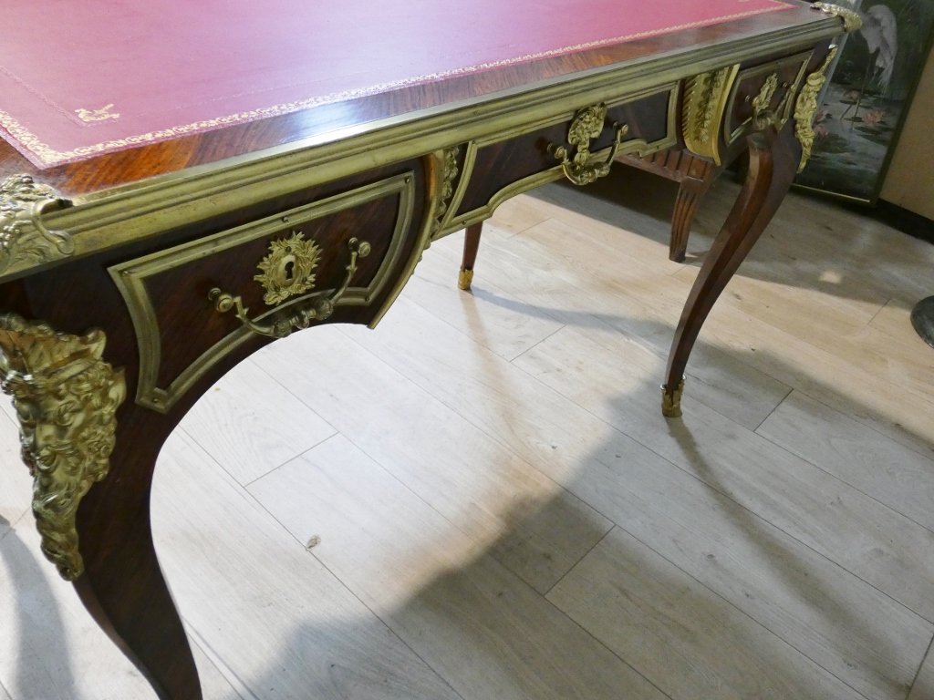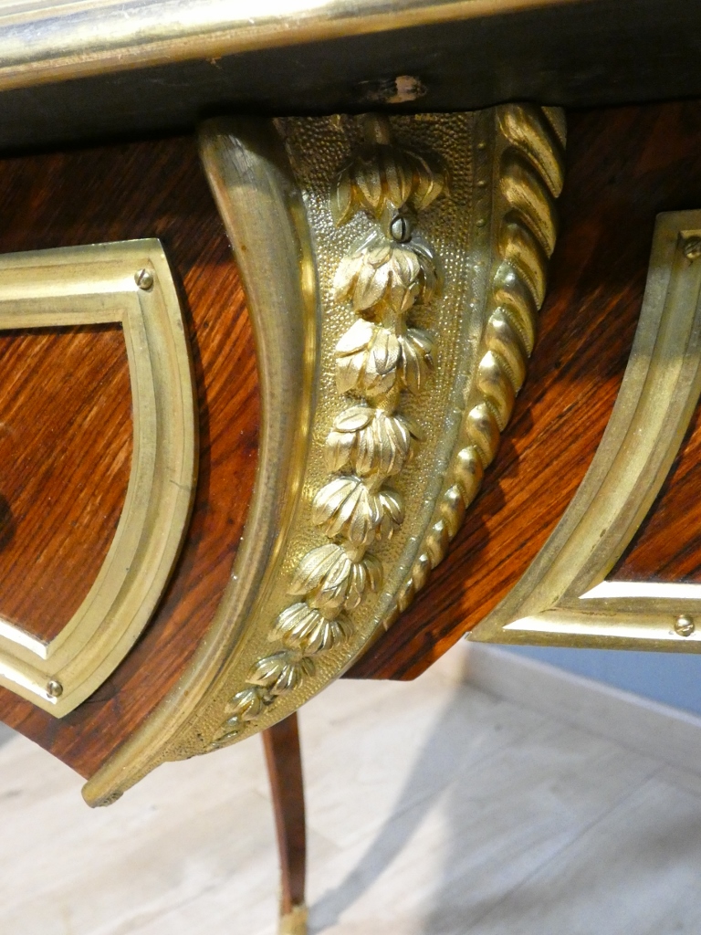 Il s’agit d’un bureau en placage de palissandre magnifié par une superbe garniture de bronzes doré.