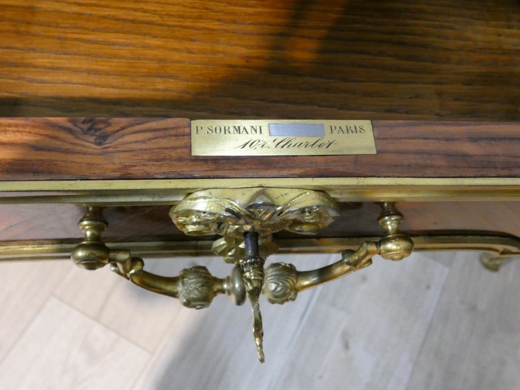 Ebéniste et ciseleur de renom Paul Sormani a orné ses meubles de riche décoration de bronzes ciselés et dorés; prendre le meilleur des styles antérieurs et travailler avec les techniques perfectionnées du XIXe siècle, tel était l’objectif, parfaitement atteint, de cet ébéniste.