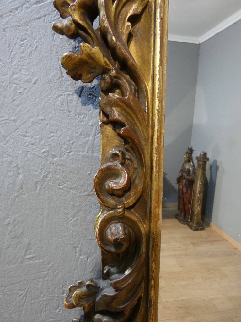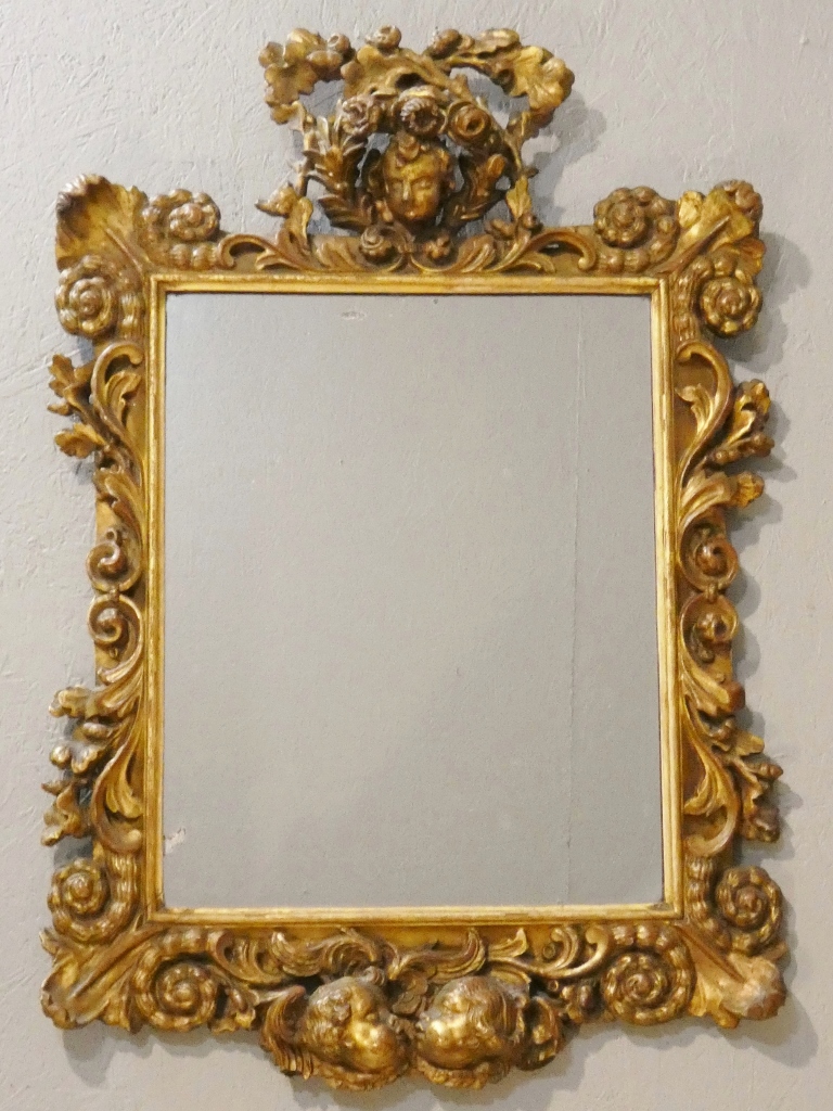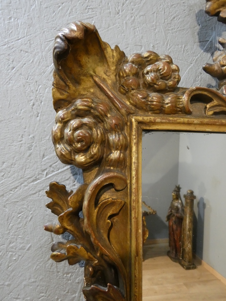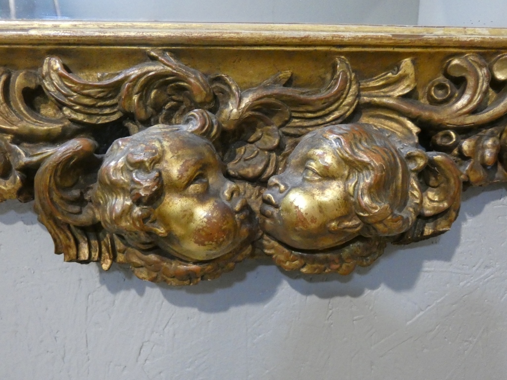 Miroir italien baroque aux anges en bois doré, époque début XVIII ème siècle