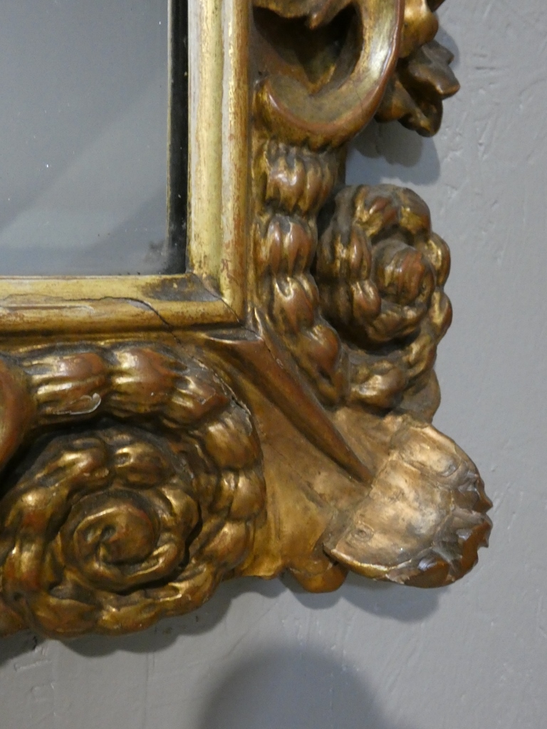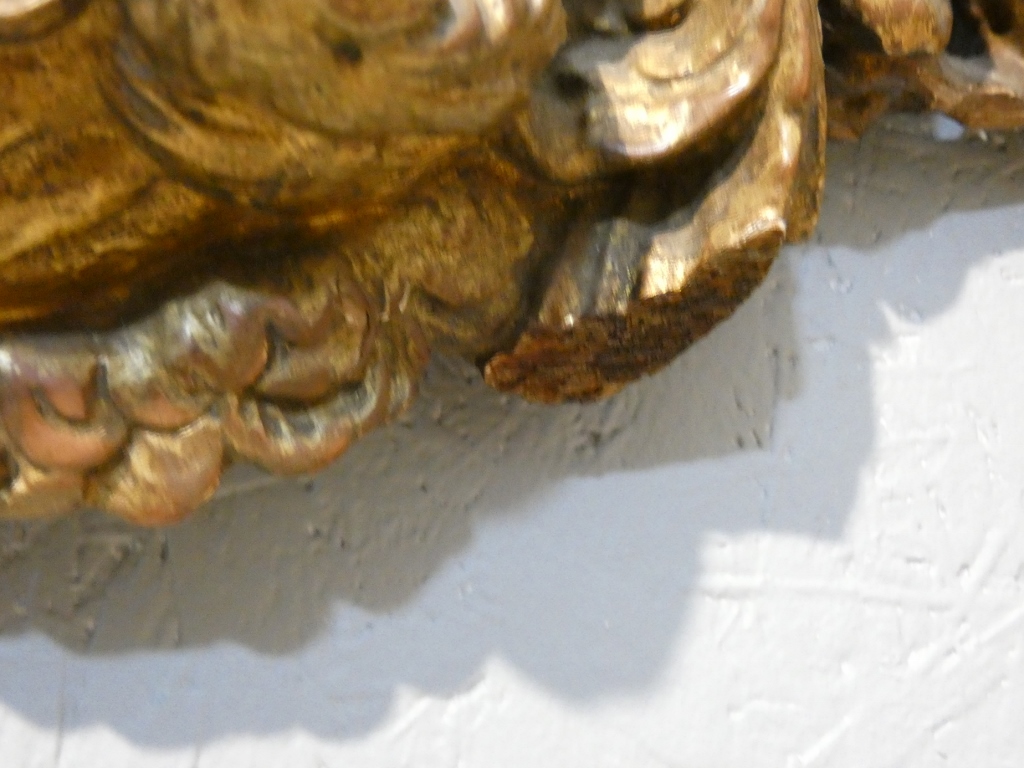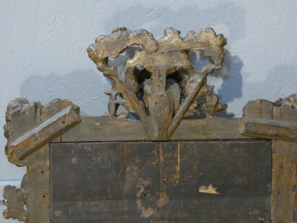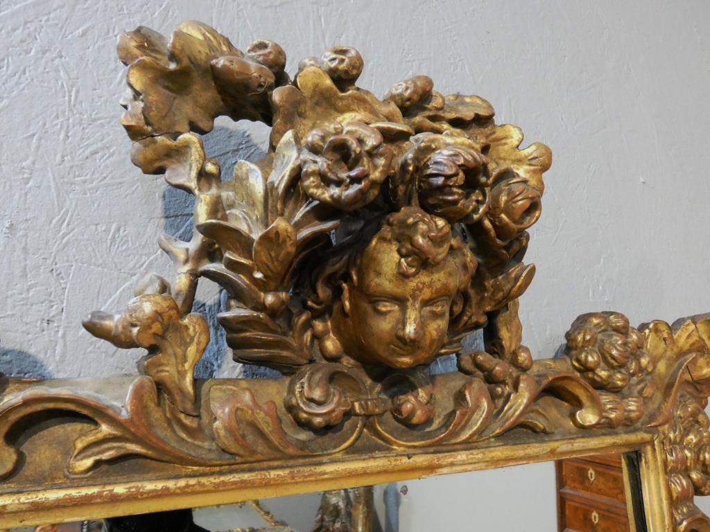 Miroir italien baroque aux anges en bois doré, époque début XVIII ème siècle