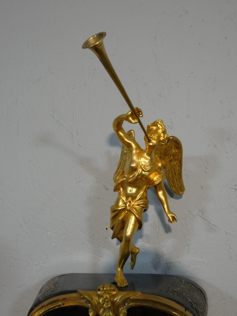Sous le cadran deux femmes et un amour en bronze découpé à jour symbolisant l’abondance et les arts.