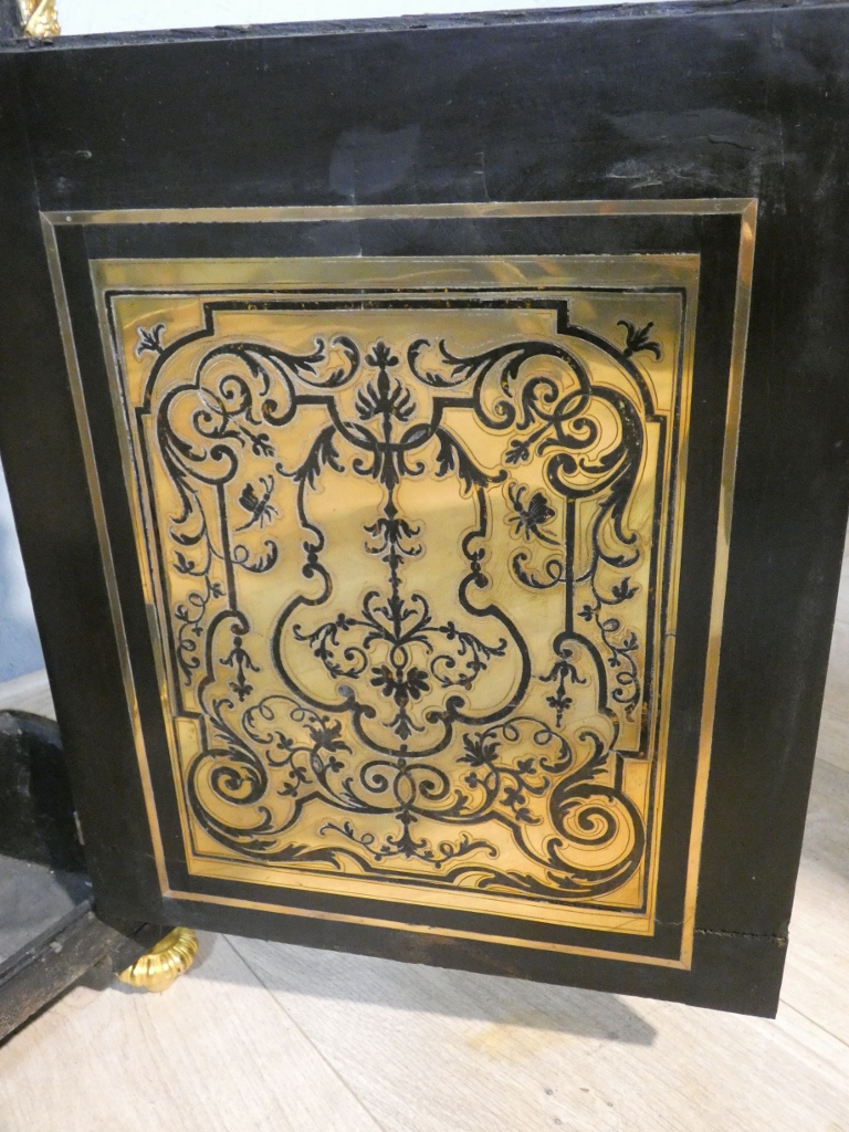 Marqueterie d’écaille brune et de laiton formant un réseau d’entrelacs et feuillages.