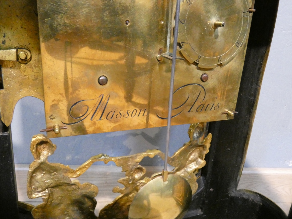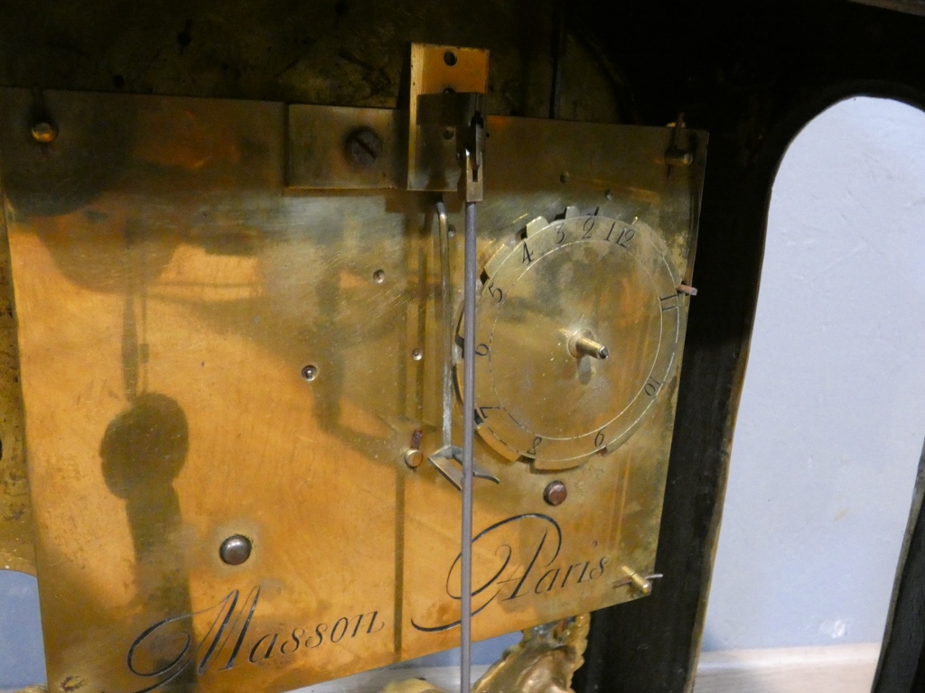 Le mouvement horloger d’époque fonctionne parfaitement, il sonne les heures et les demi heures. Il est signé Masson à Paris, dynastie d’horloger du XVIII ème siècle.
