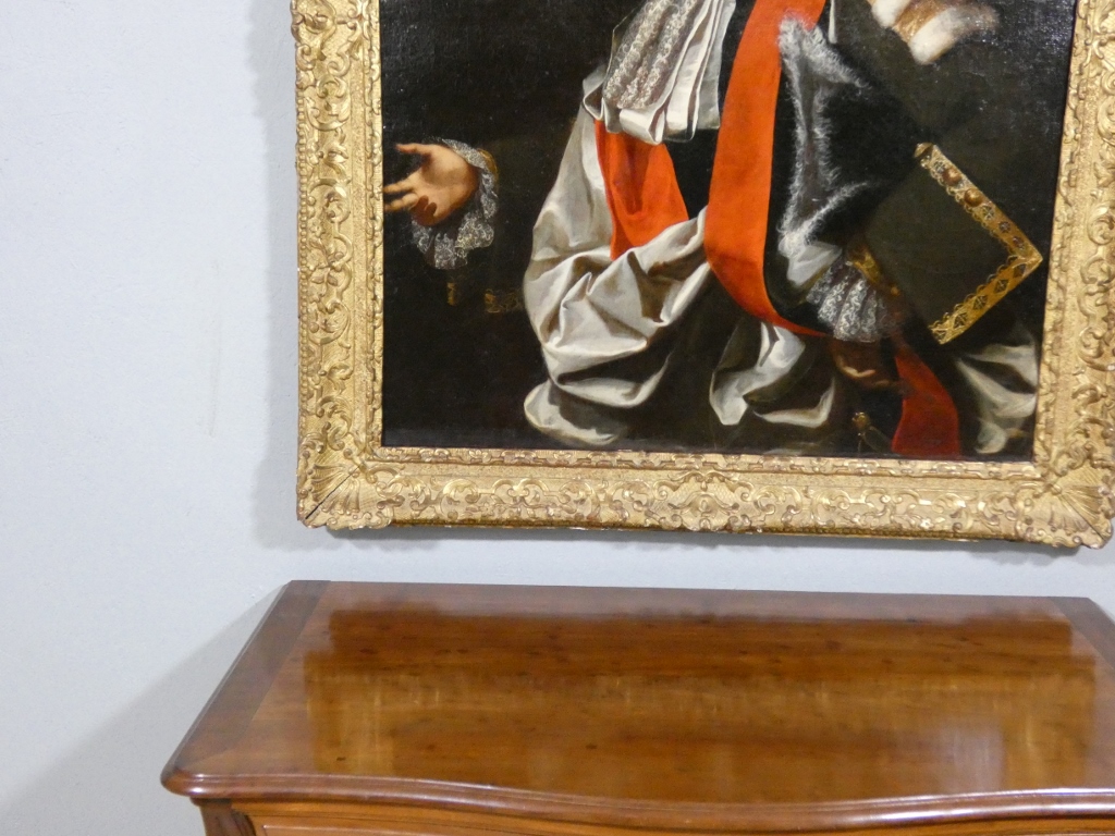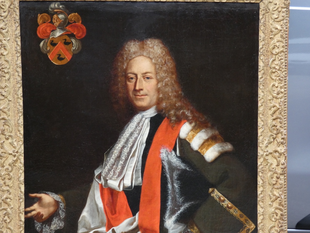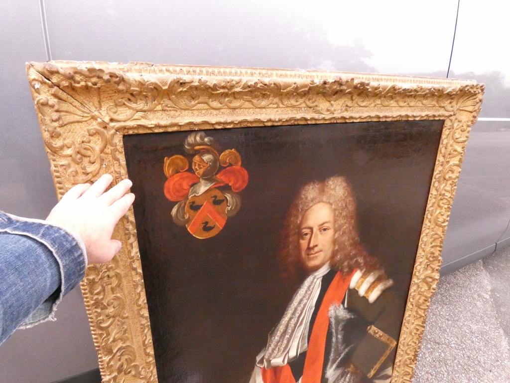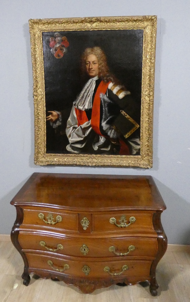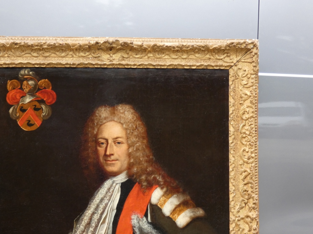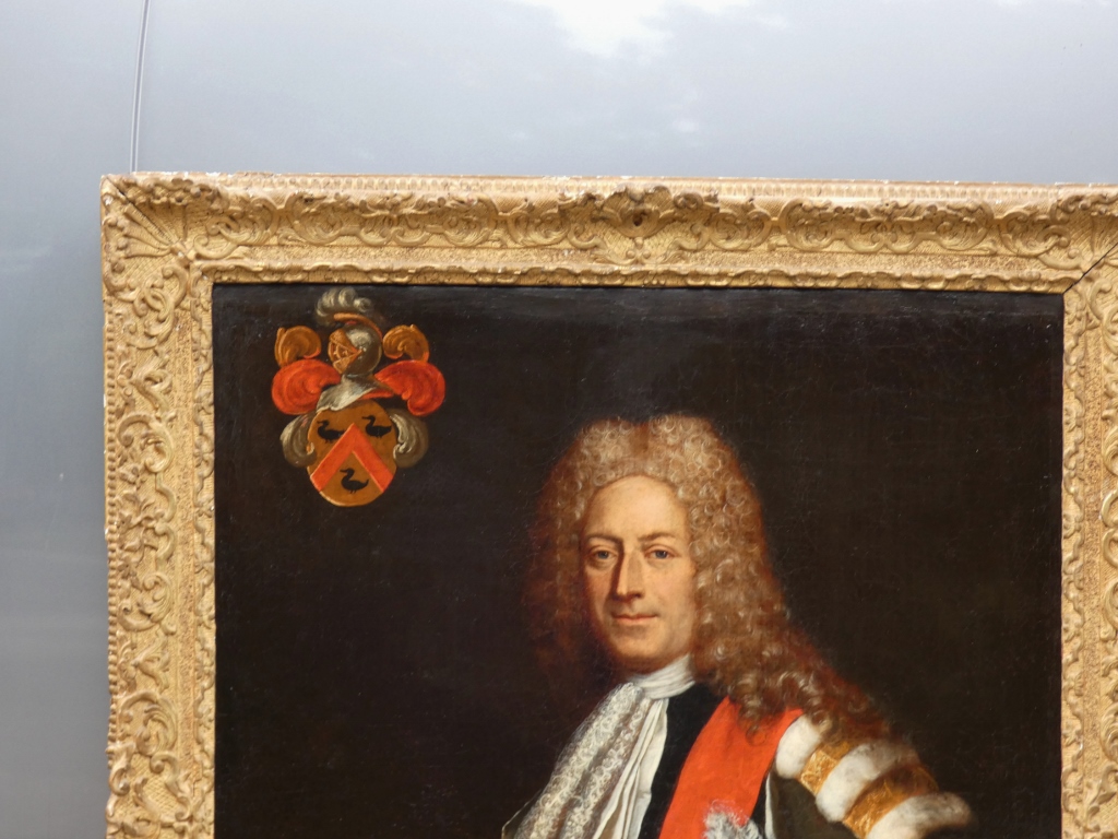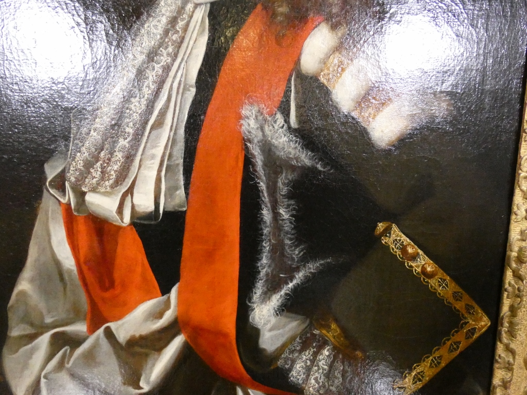 Il s’agit du portrait d’un homme d’âge mûr, perruque longue, habit de magistrat avec rabat de dentelle blanche et écharpe rouge. Huile sur toile sans signature.