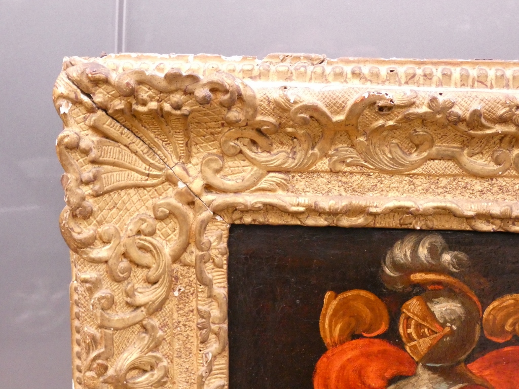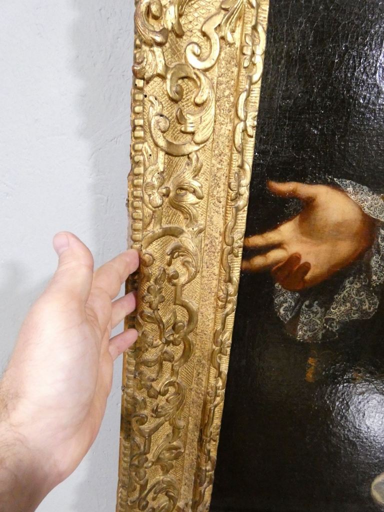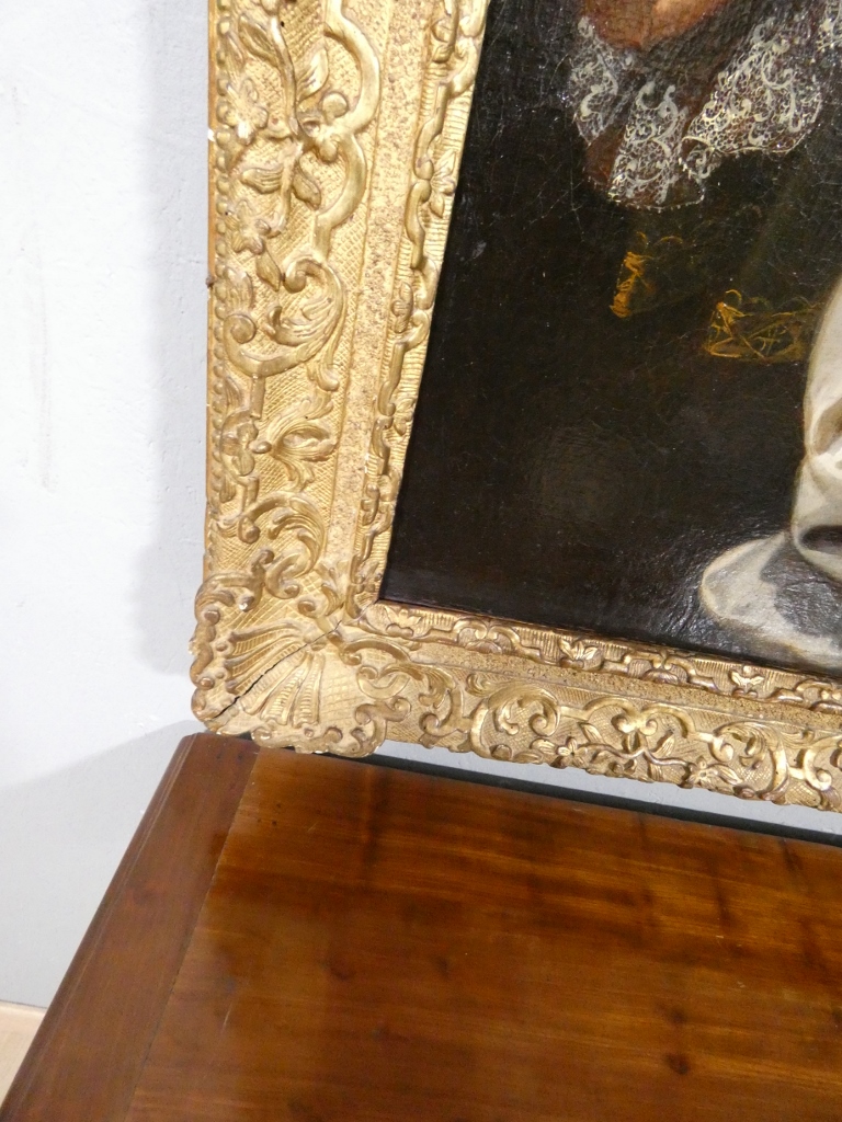 Le cadre d’époque est en bois sculpté et doré, il présente des accidents sur les tranches ainsi que quelques anciennes consolidations.