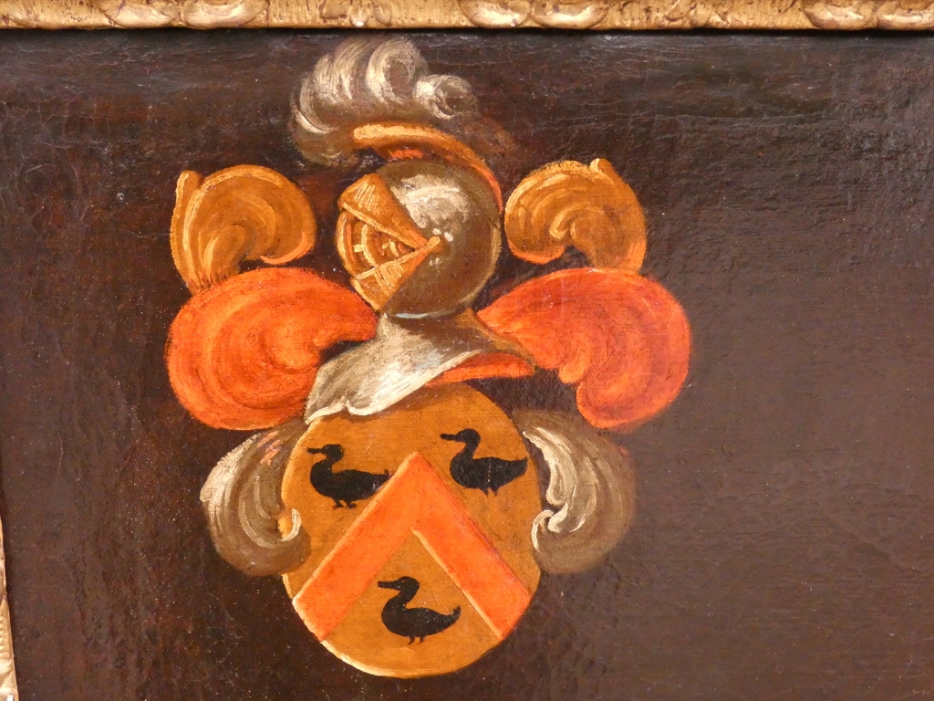 En effet, les armoiries sont : D’or au chevron de gueules, accompagné de trois canettes de sable (champ doré, chevron rouge, trois canettes noires) Cimier: heaume de profil avec lambrequin rouges et or.