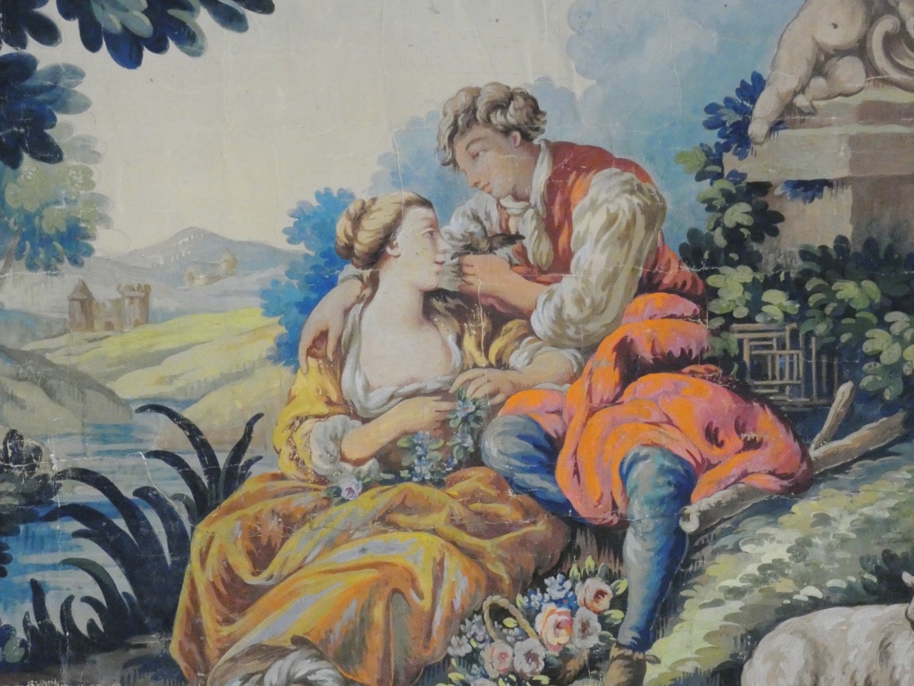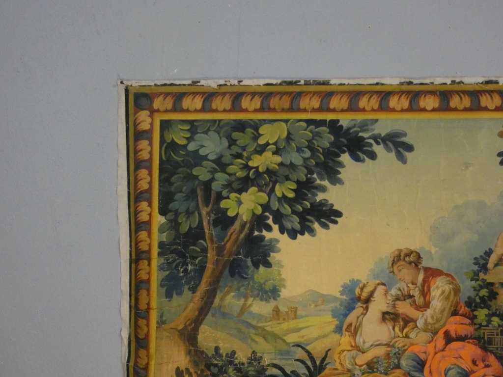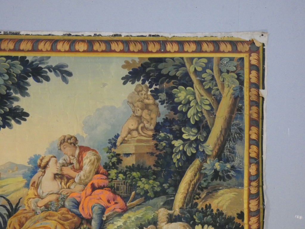 Grand carton d’Aubusson peint à la gouache et tempera sur papier, représentant une scène galante pastorale ou bucolique dans le goût des créations de François Boucher.