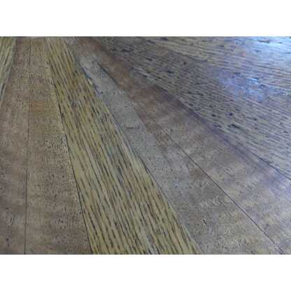 Le plateau du bas reçoit un placage noyer et le plateau du haut une marqueterie rayonnant en frisage de divers bois dans des fils de coupe différents.
