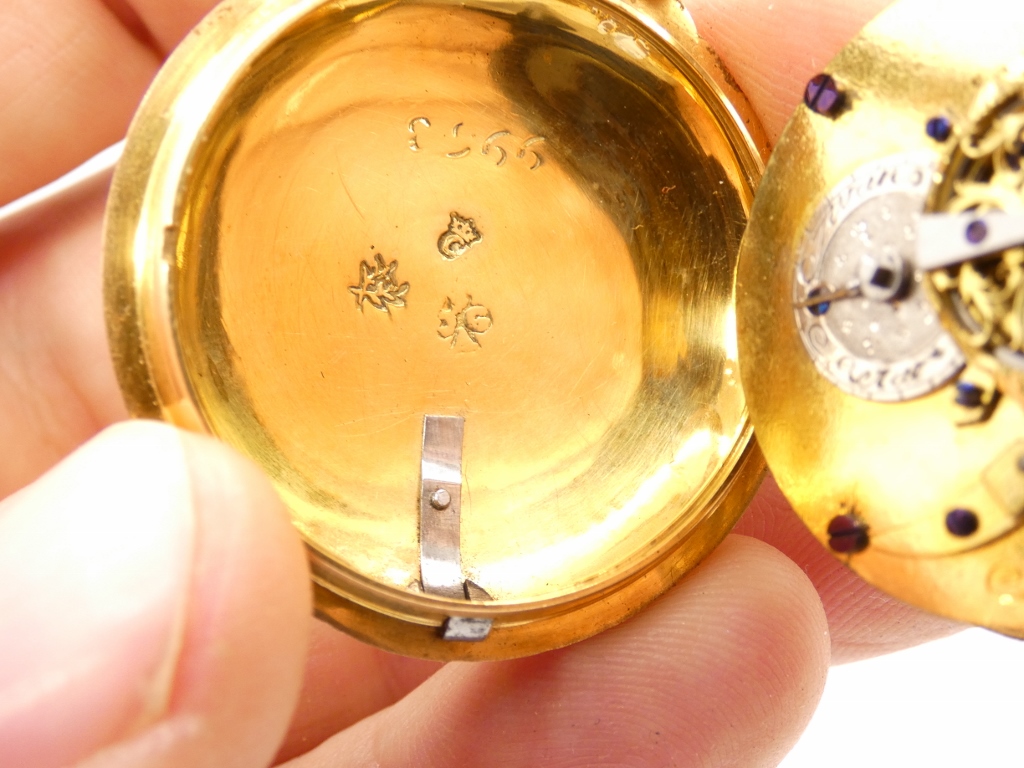 Le fond est poinçonné de poinçons d’orfèvre, et le très rare C couronné, qui atteste que cette montre a été produite entre 1745 et 1749.