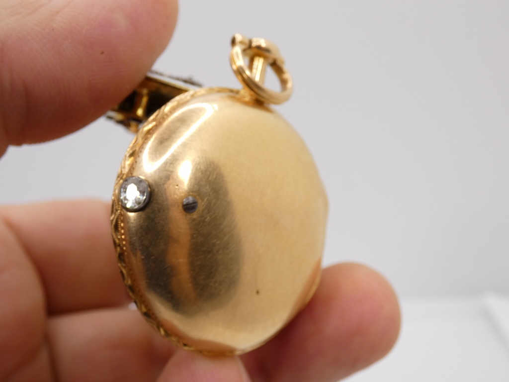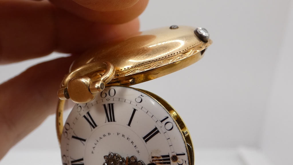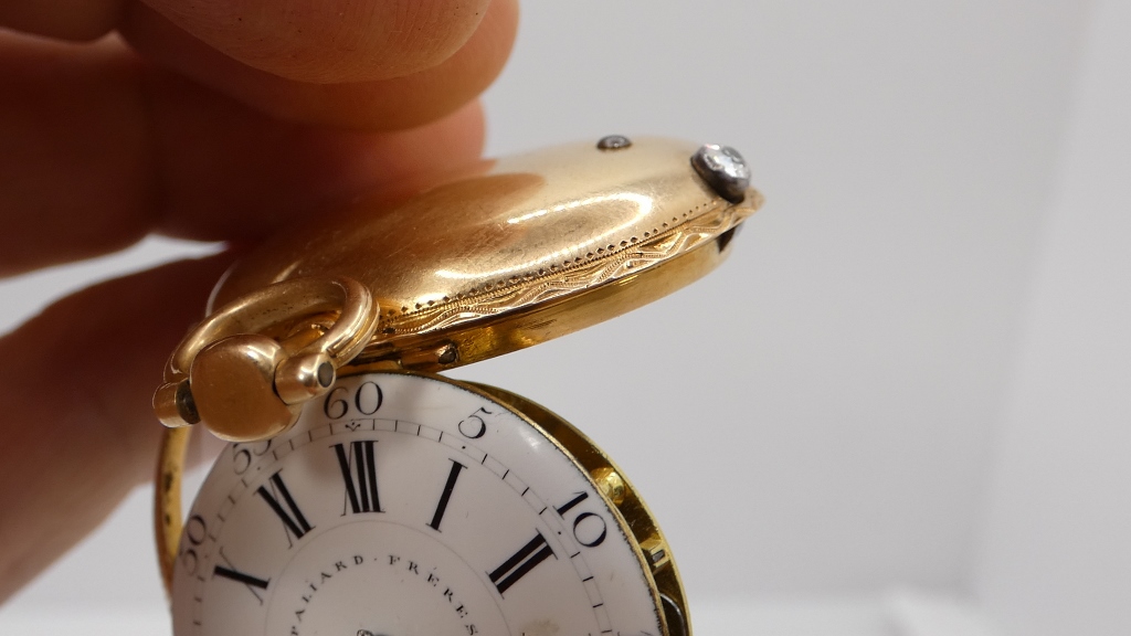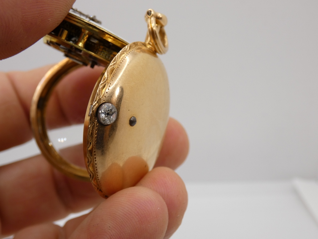 Boîtier en or massif très simple avec guillochage sur le couvercle, pierre du Rhin en bouton poussoir pour ouvrir et encore pierres du Rhin en ornement sur les aiguilles.