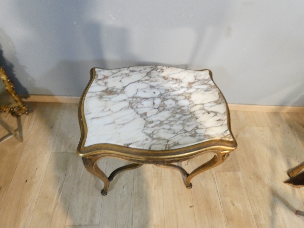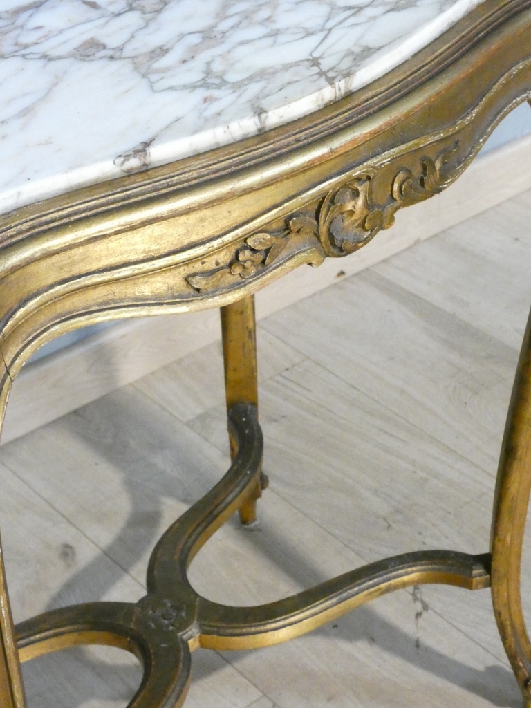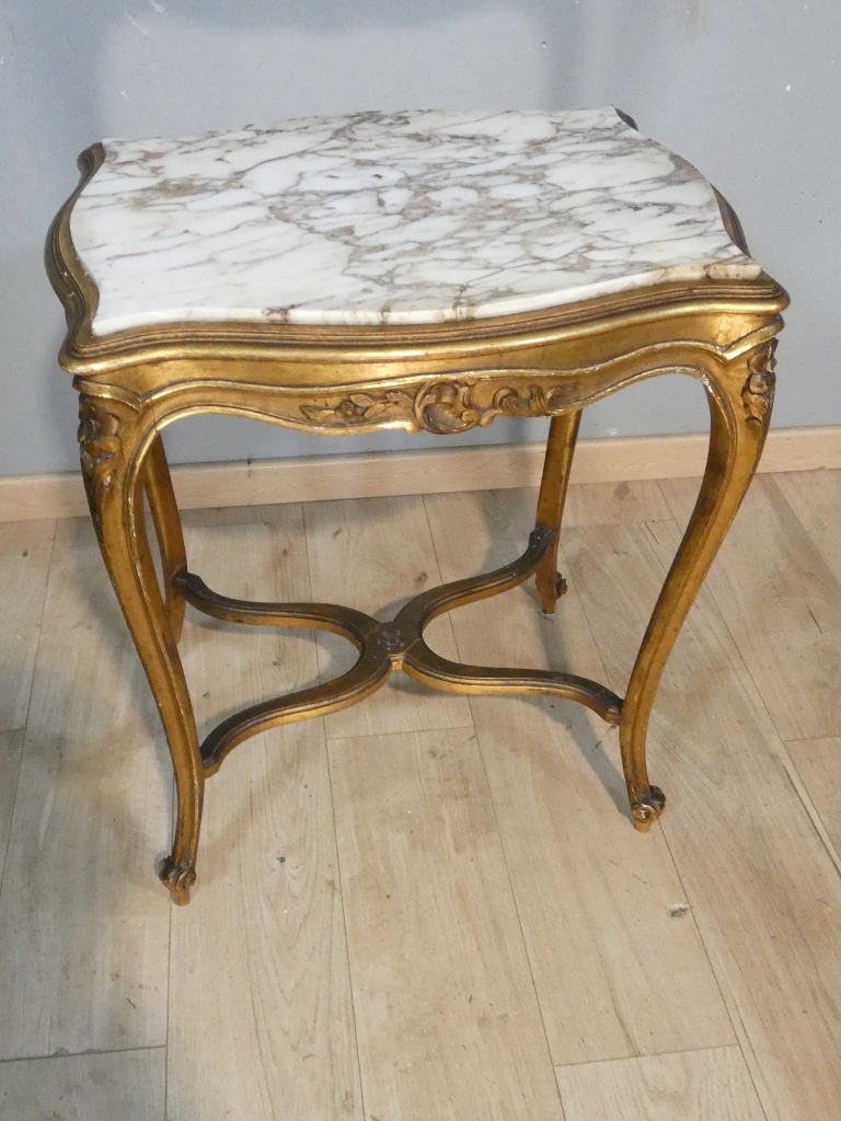 Petite table de milieu de style Louis XV en bois à patine dorée et dessus de marbre.