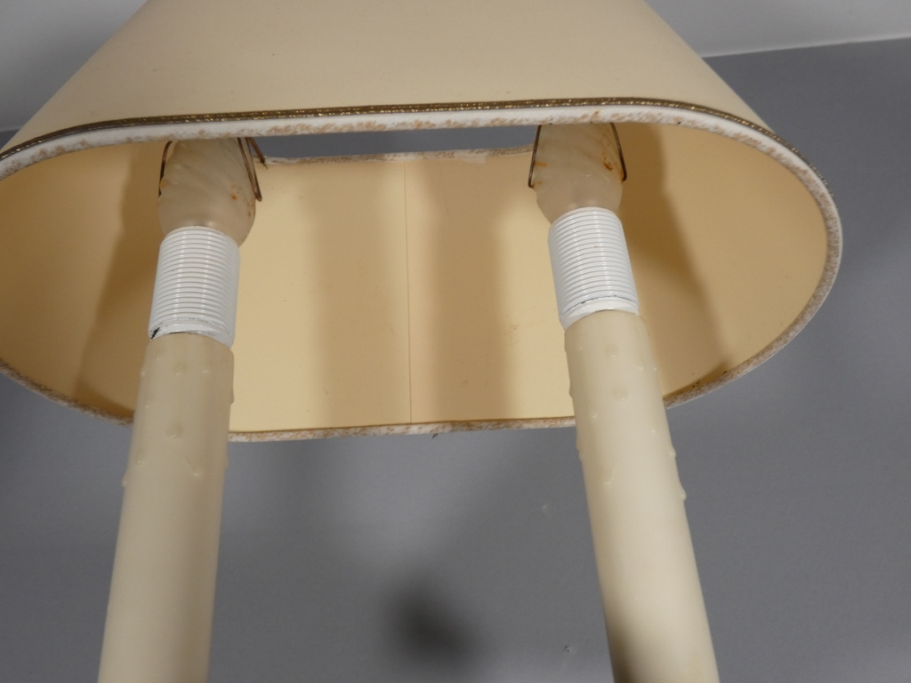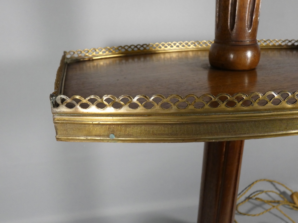 Repose sur un piétement tripode. Une première étagère permet de poser des objets ou livres, et le second étage porte deux lumières.