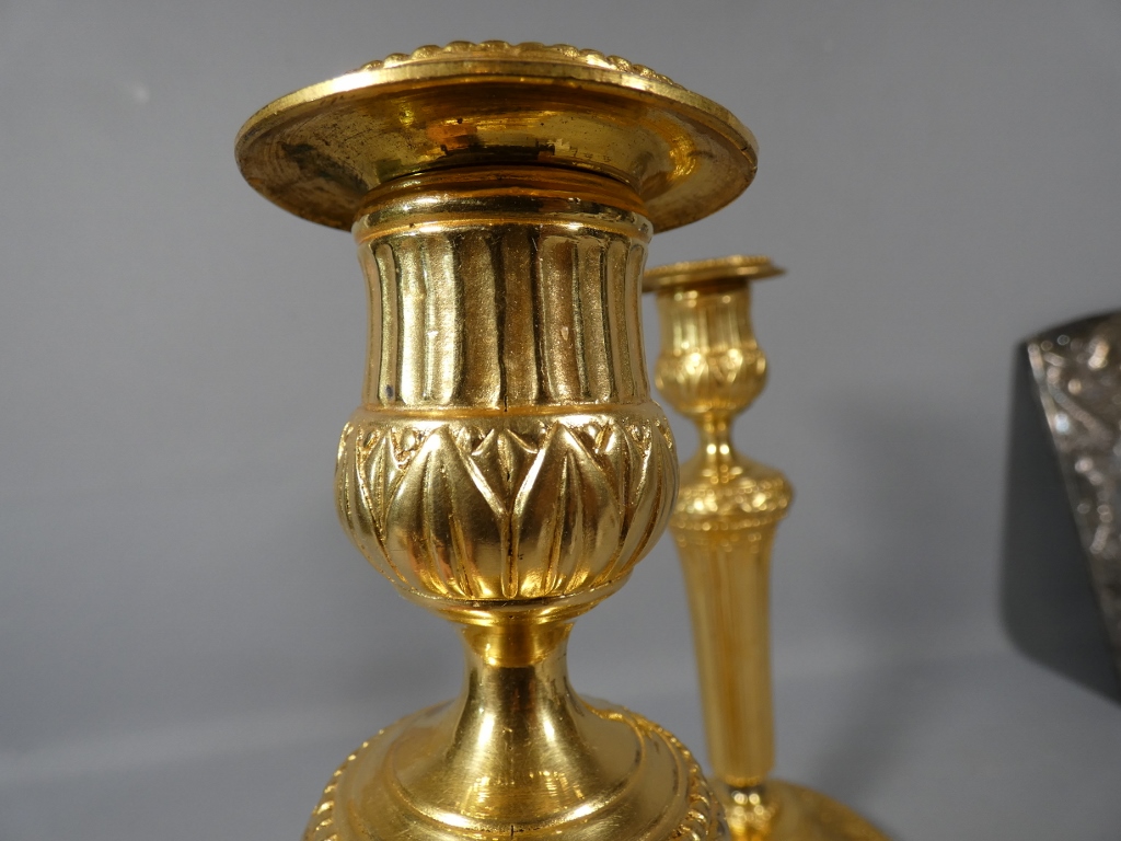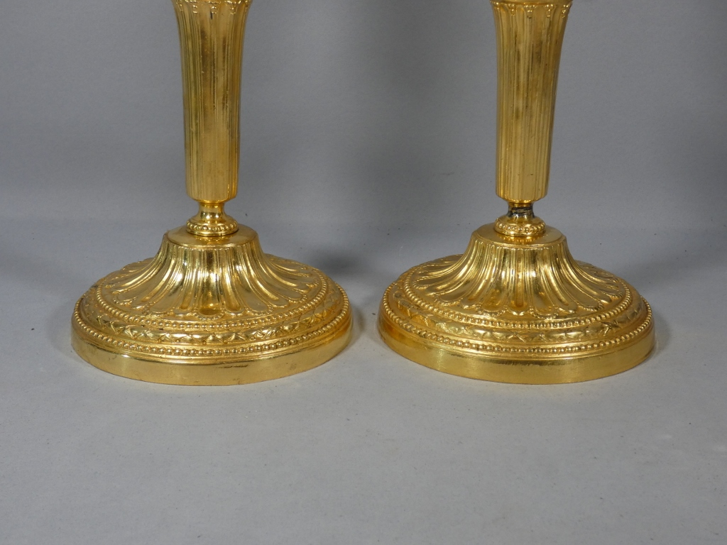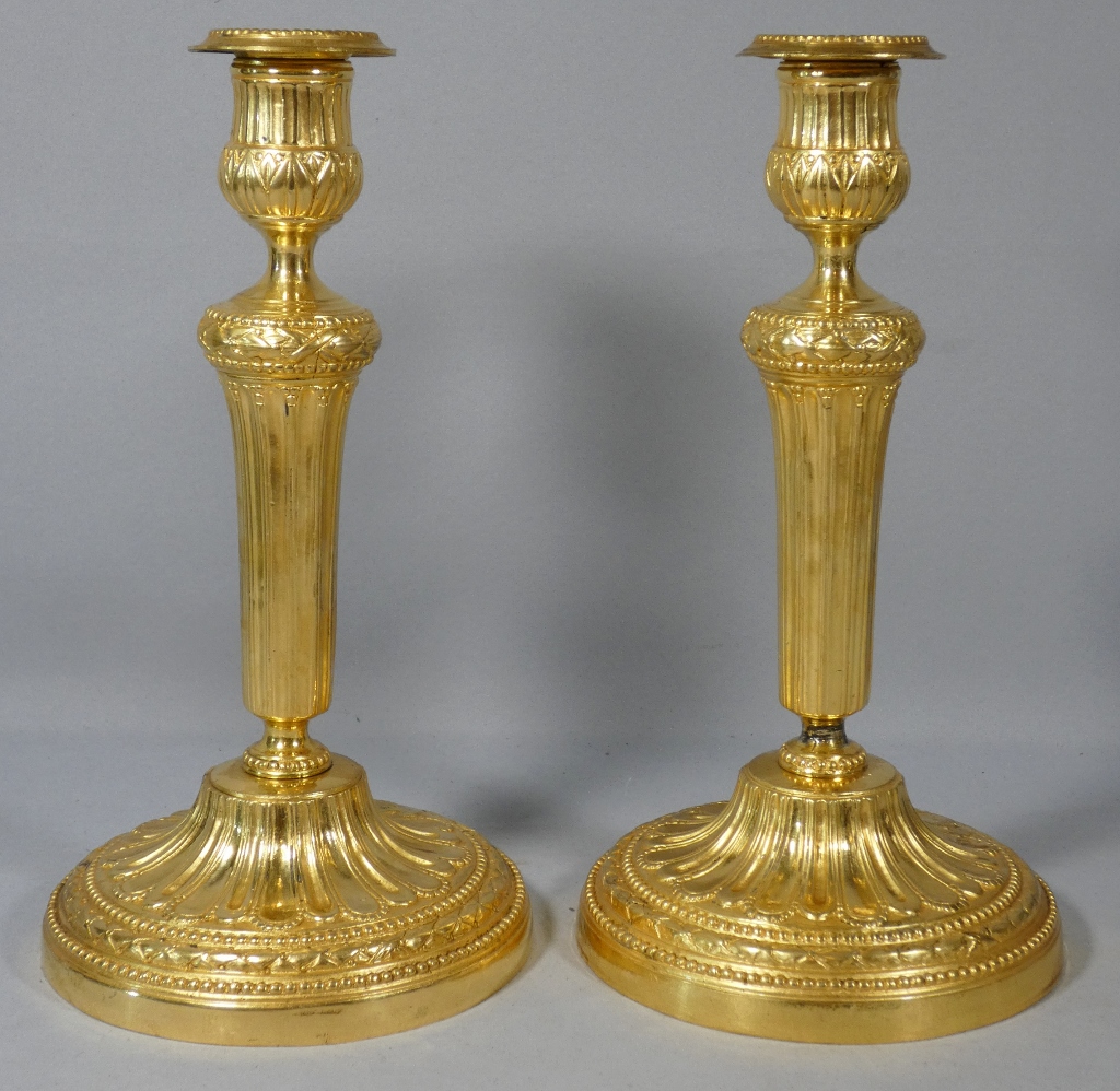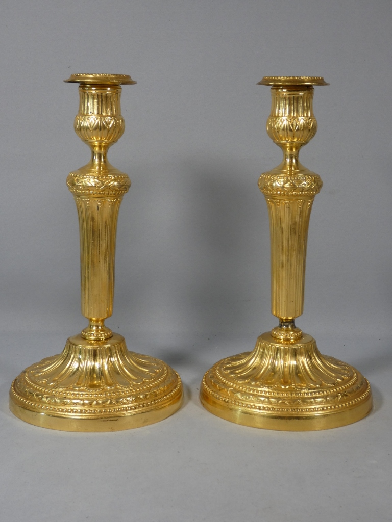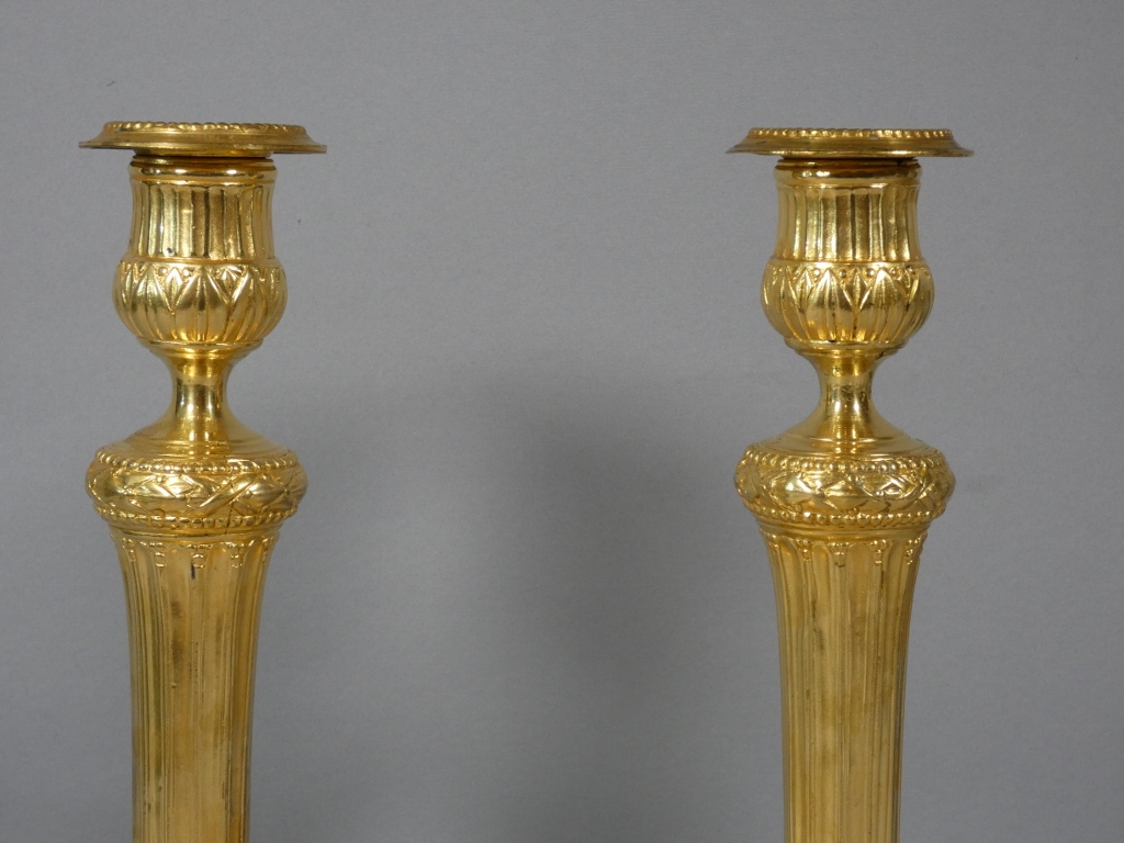 Paire de bougeoirs ou flambeaux d’époque Louis XVI en bronze doré.