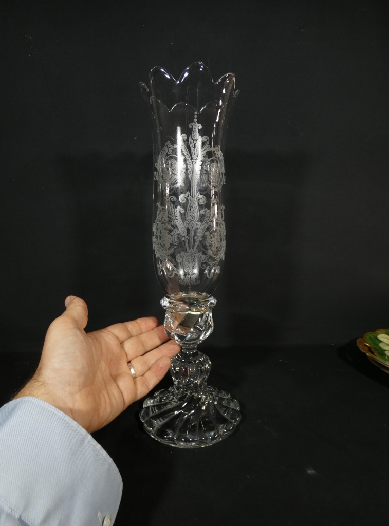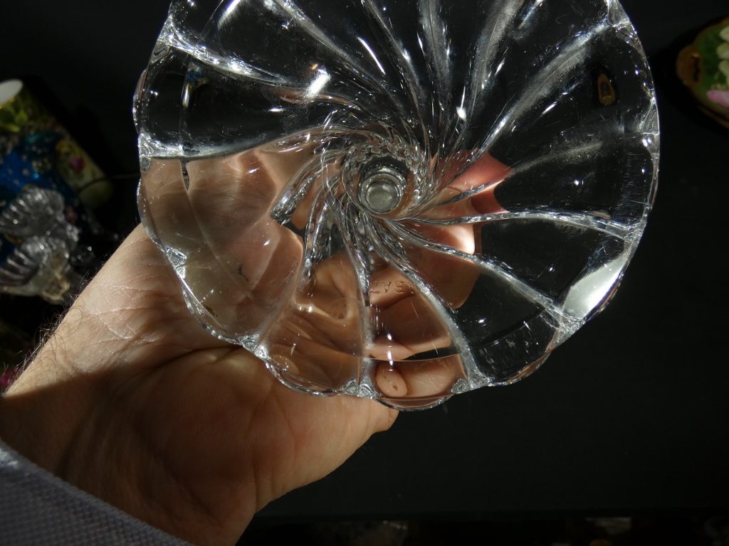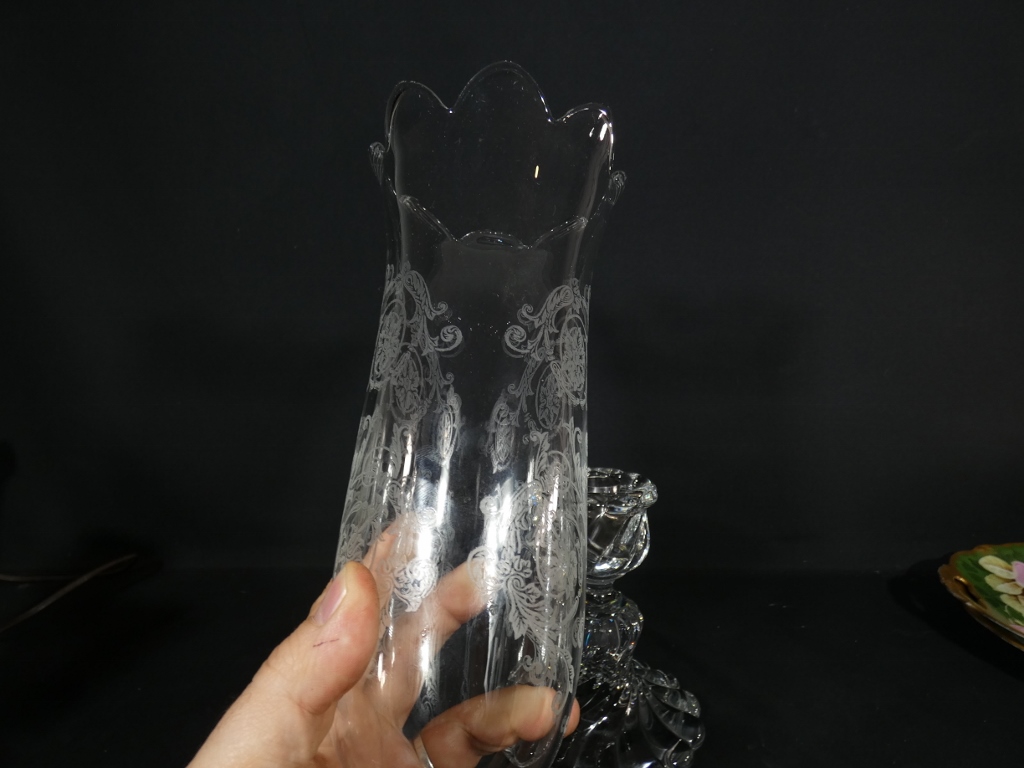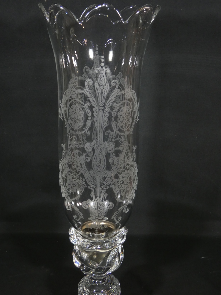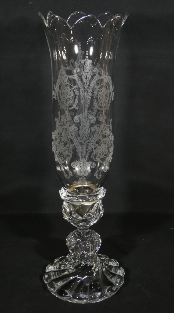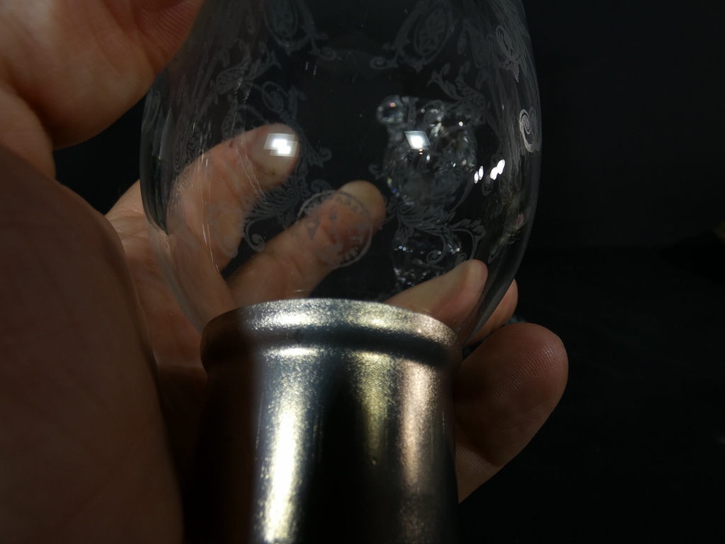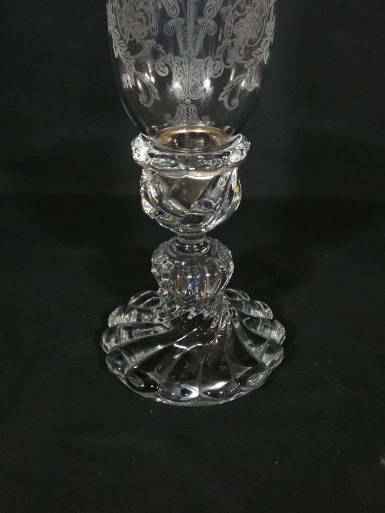 Piétement en cristal moulé et verrine en cristal gravé venant se poser dessus.