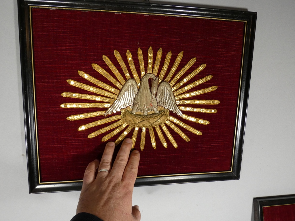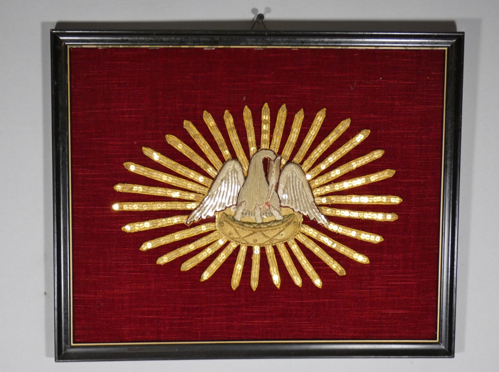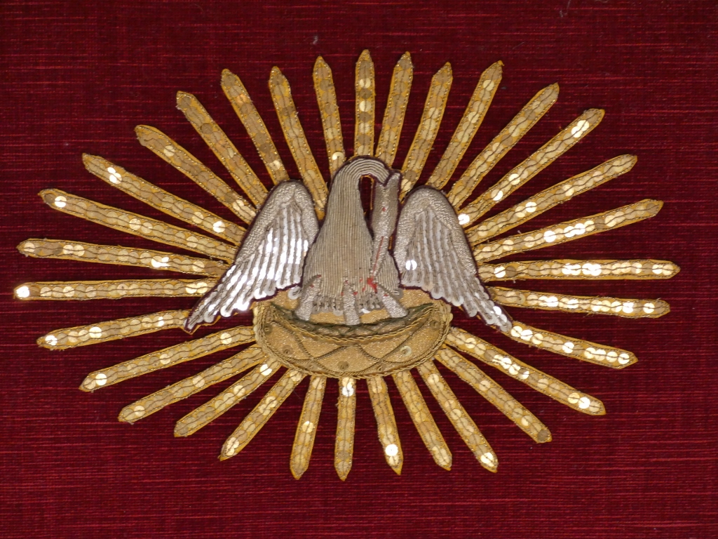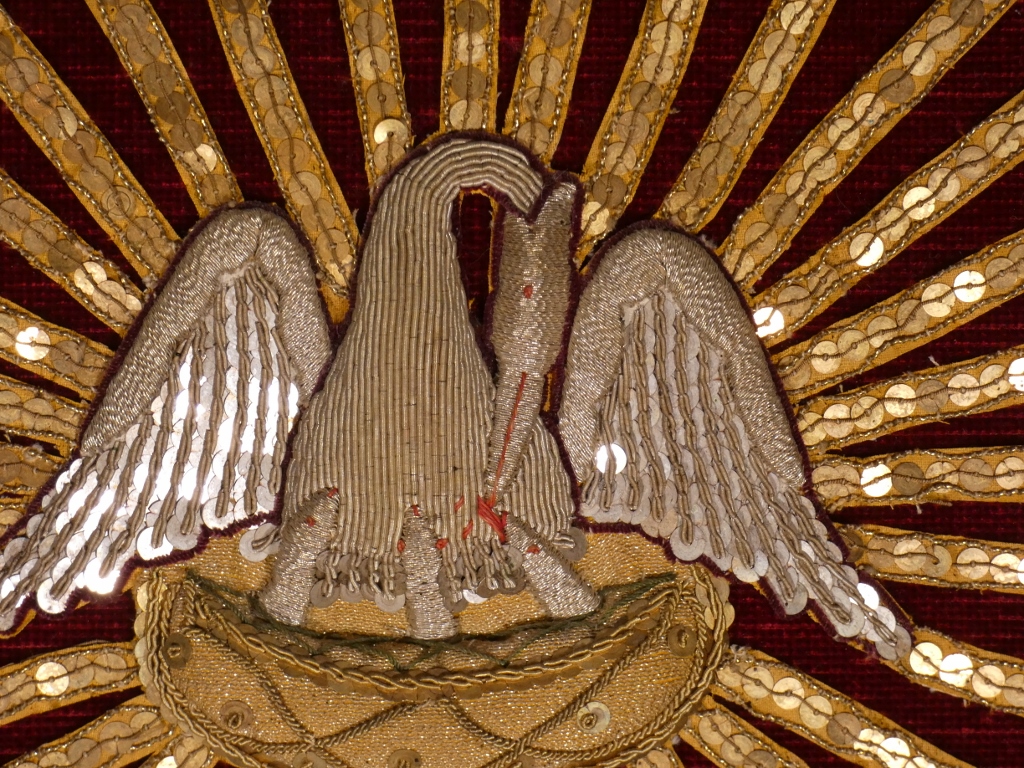 Broderie religieuse en perles plates dorées et argentés représentant un pélican donnant à manger à ses petits dans un rayonnement.