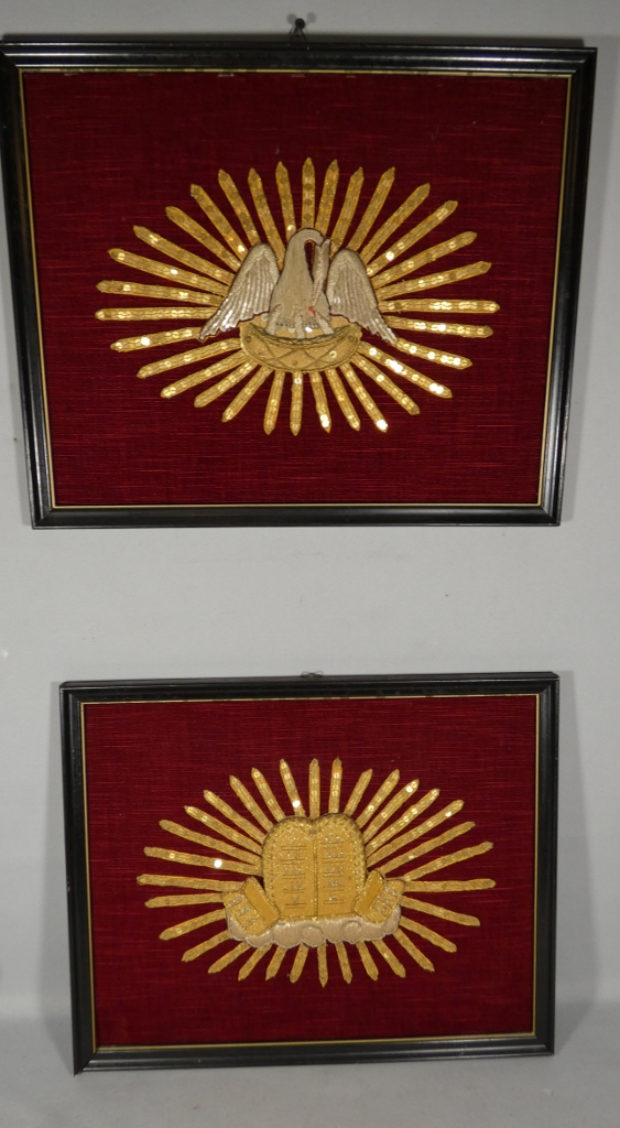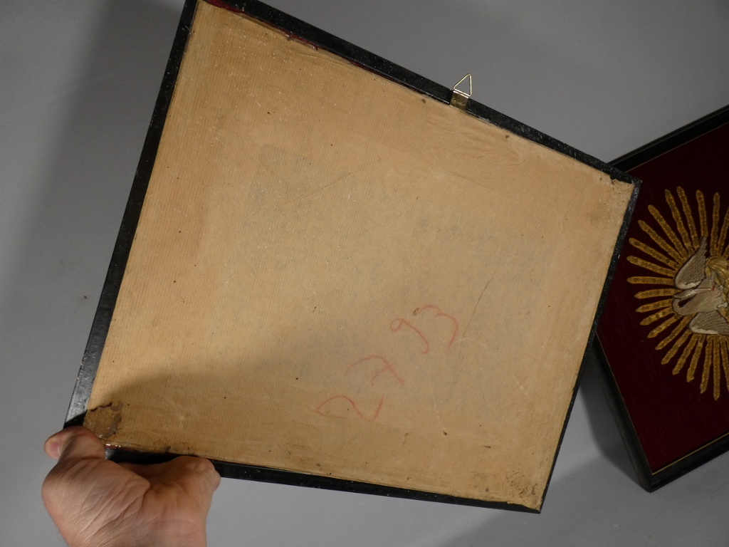 Broderie religieuse au pélican monté en cadre, époque XIX ème