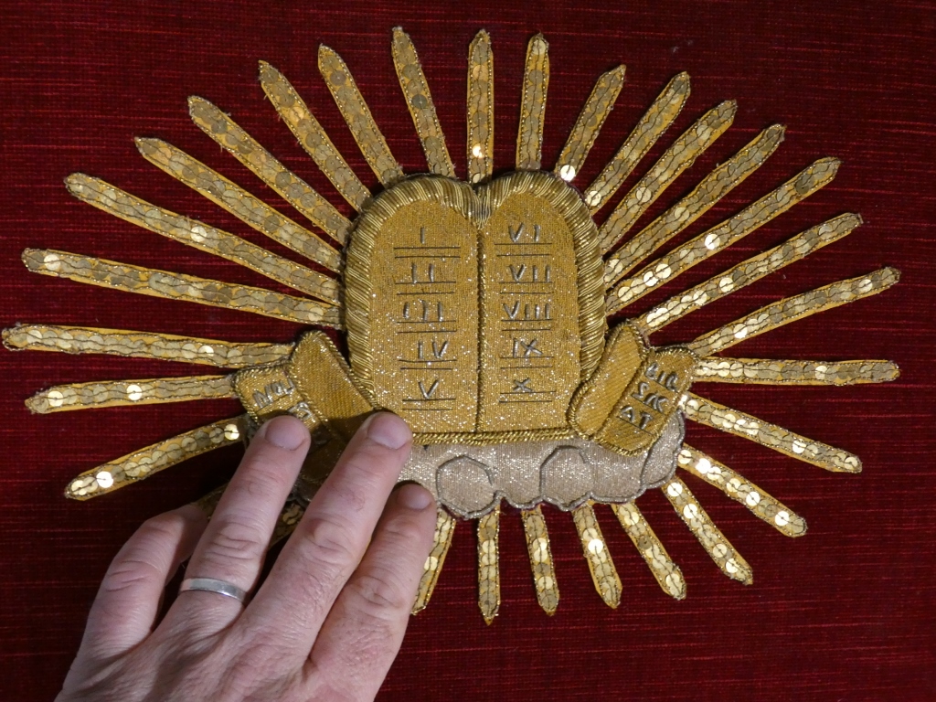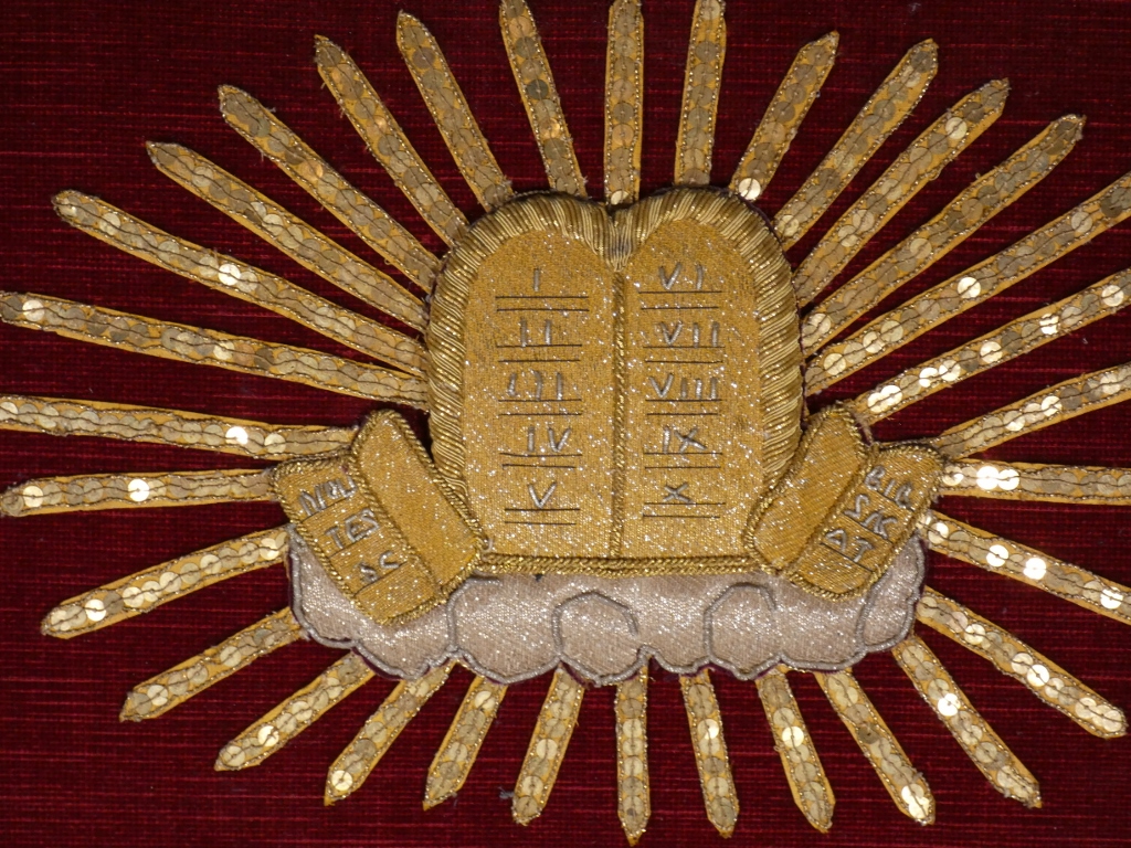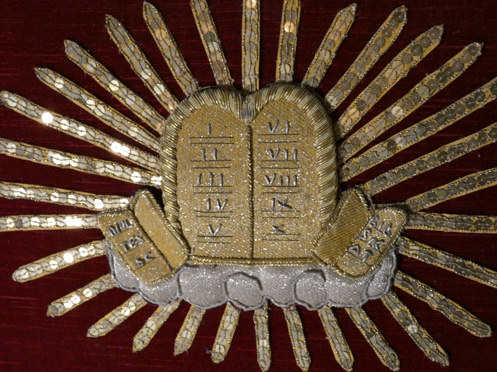 Broderie religieuse en perles plates dorées et argentés représentant les dix commandements.