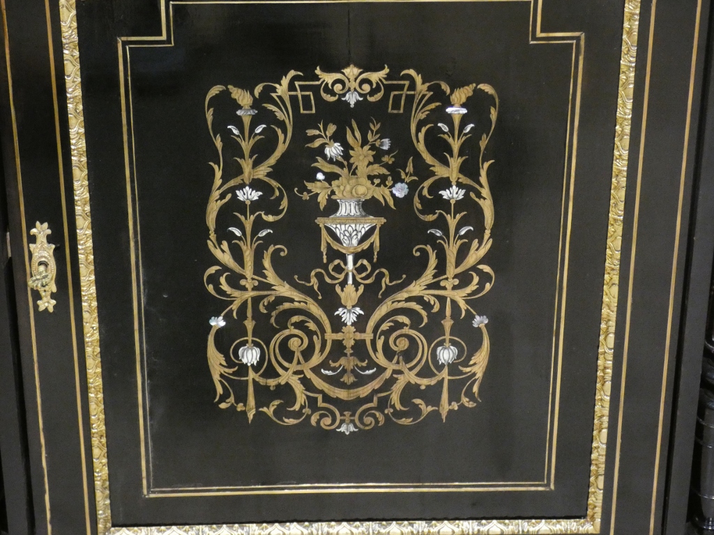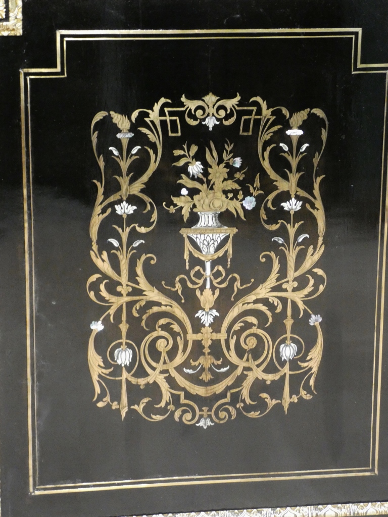 Bois noirci et riche ornementation avec une marqueterie de style Louis XVI en laiton, nacre et os.