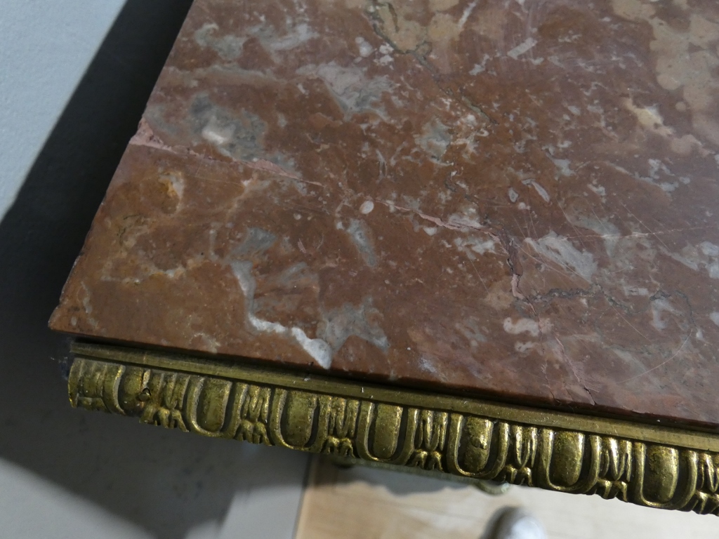 Dessus de marbre rouge brun veiné (une ancienne casse recollée dans un coin).