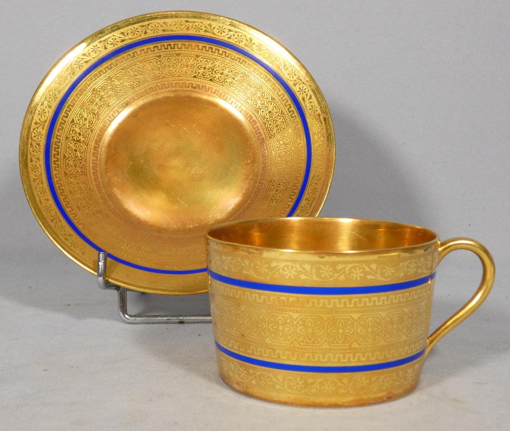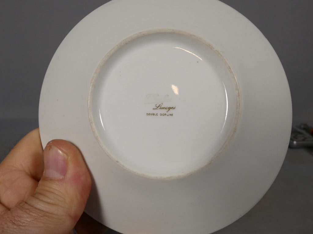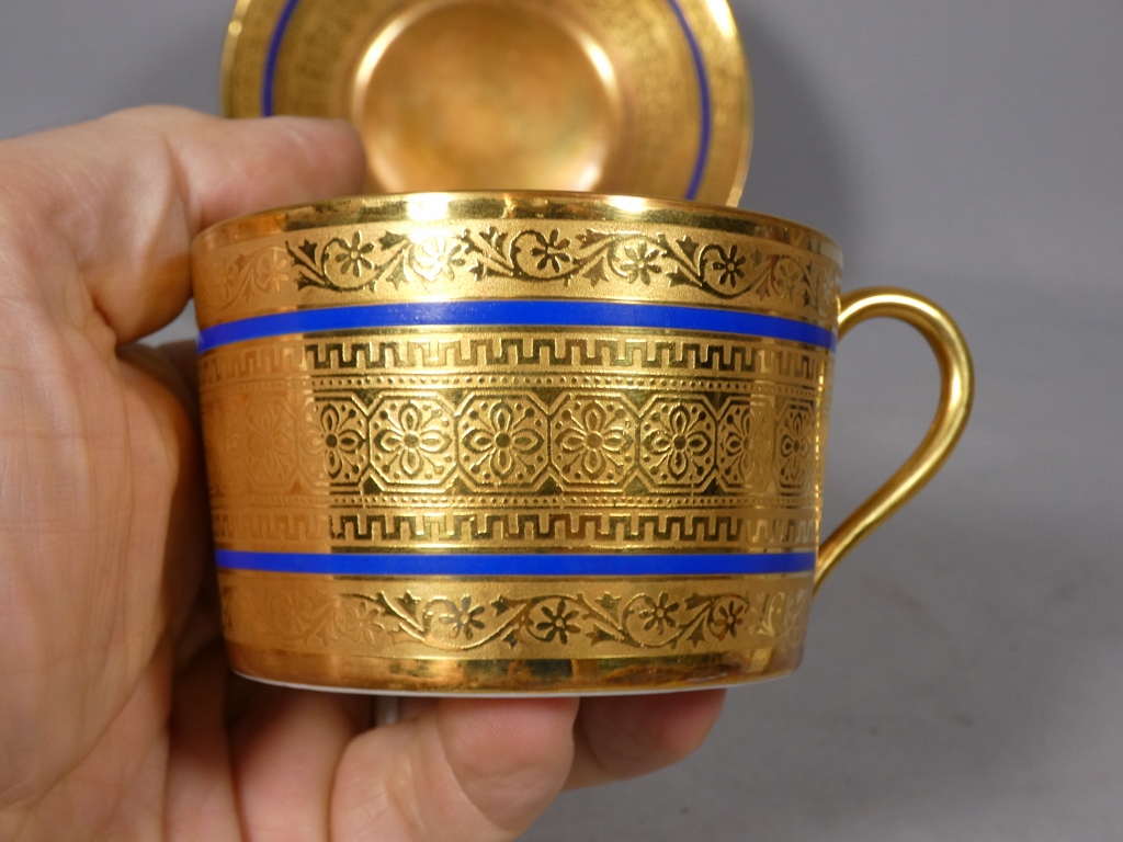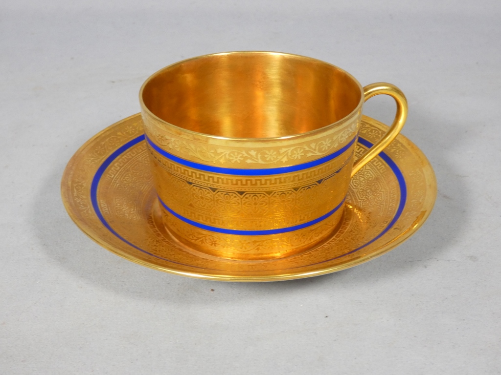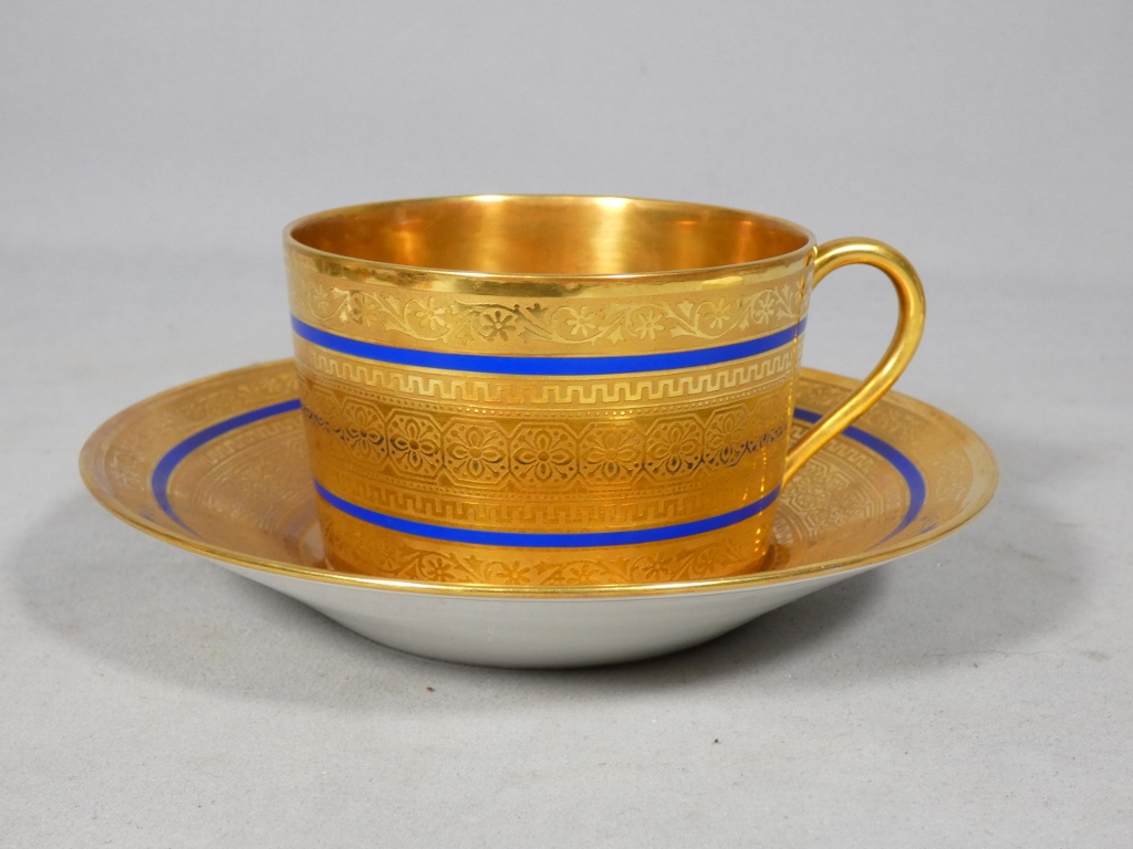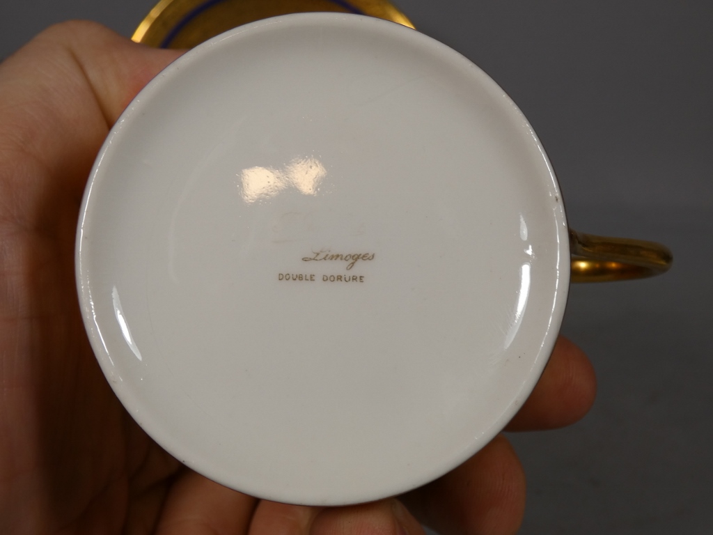 Incroyable incrustation d’or double couche pour cette tasse et sous tasse en porcelaine de Limoges.