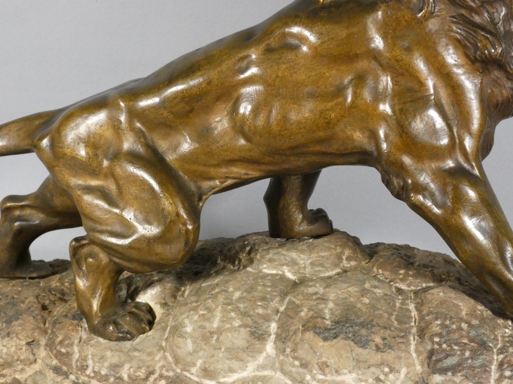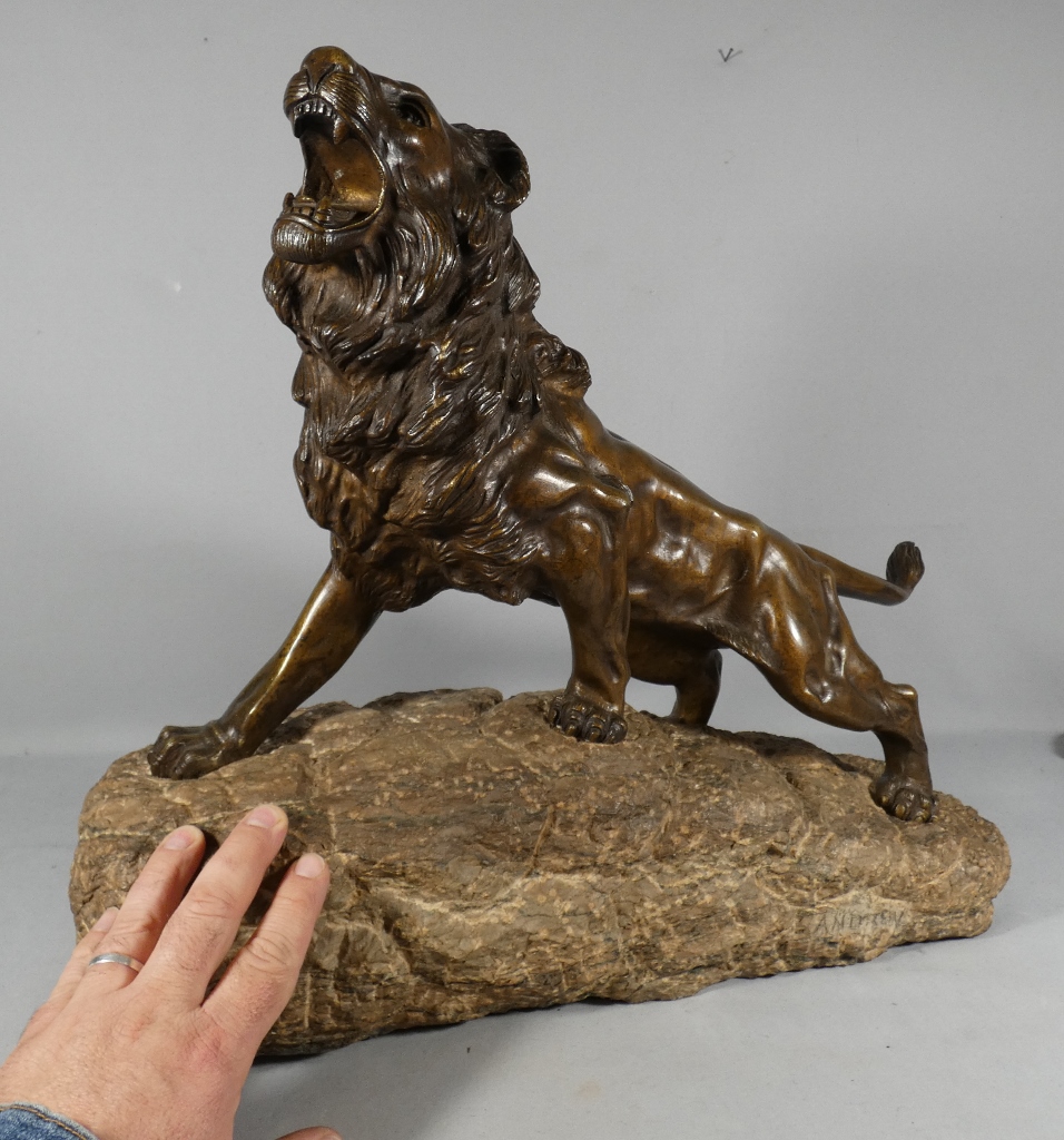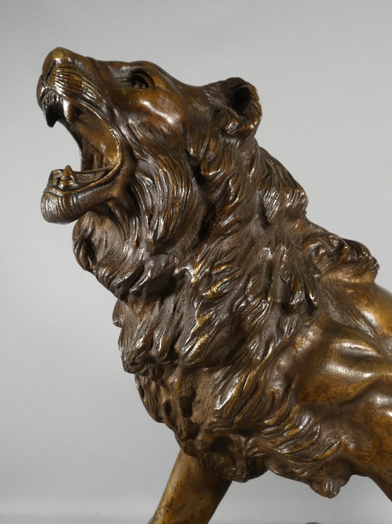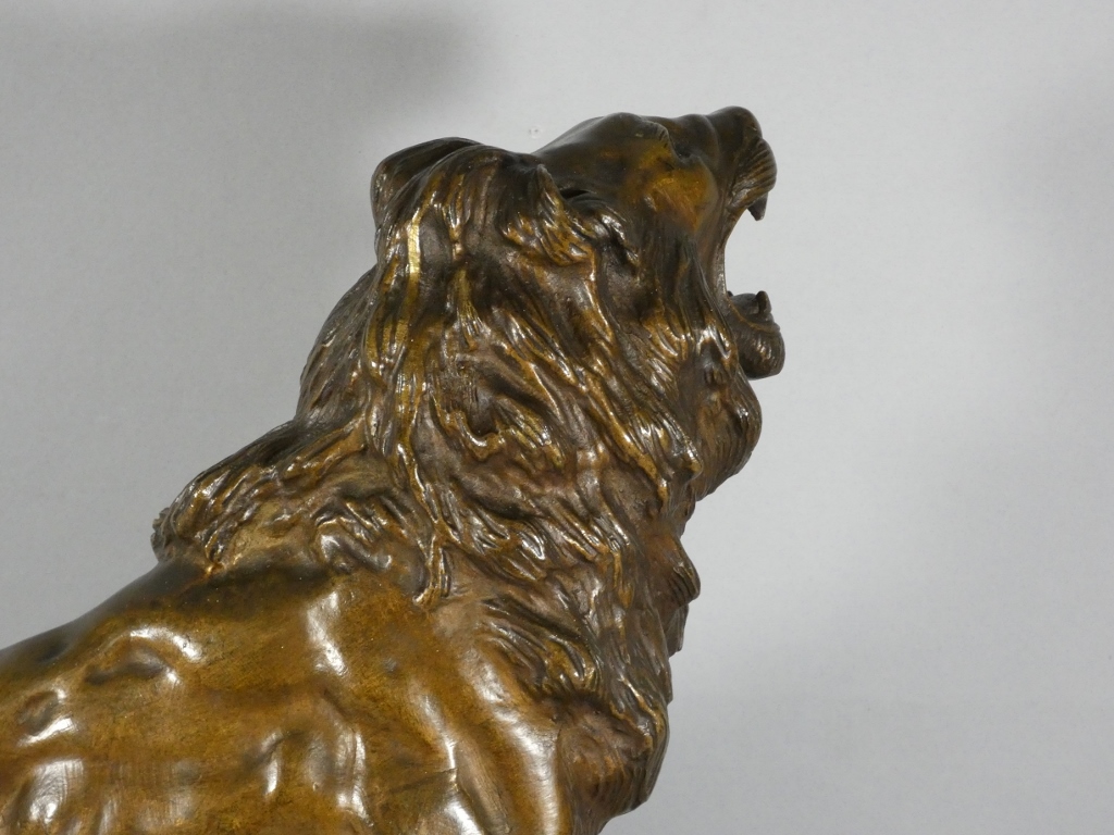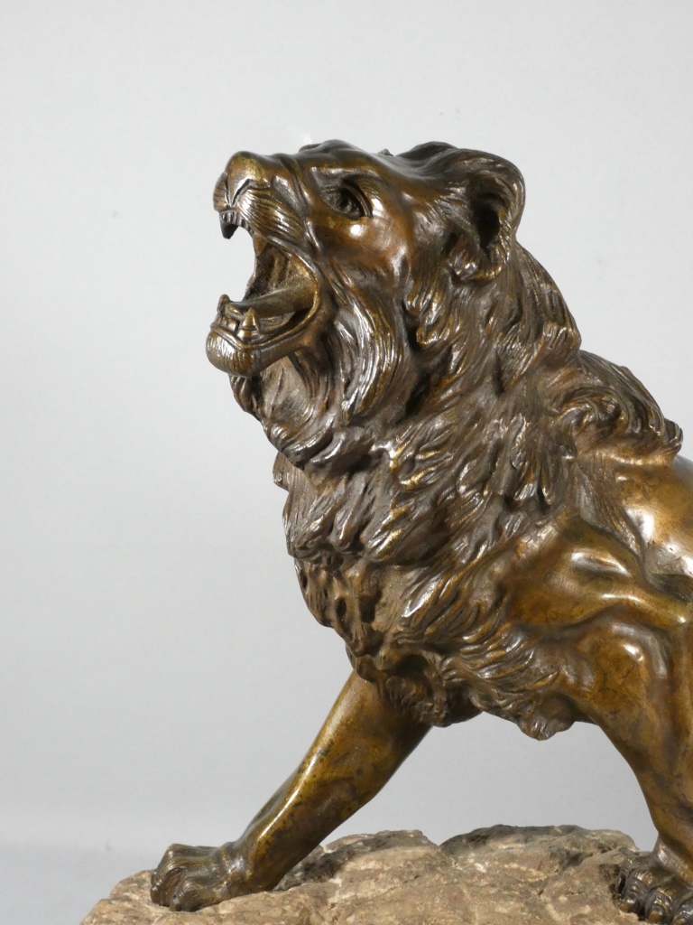 Lion rugissant, sculpture animalière en bronze et marbre des Pyrénées, par James Andrey