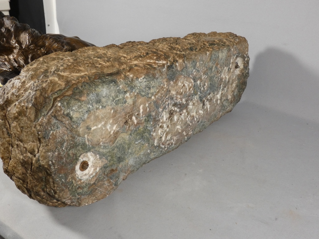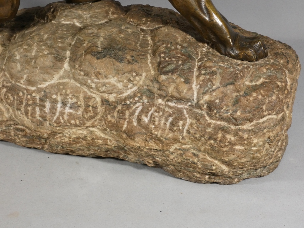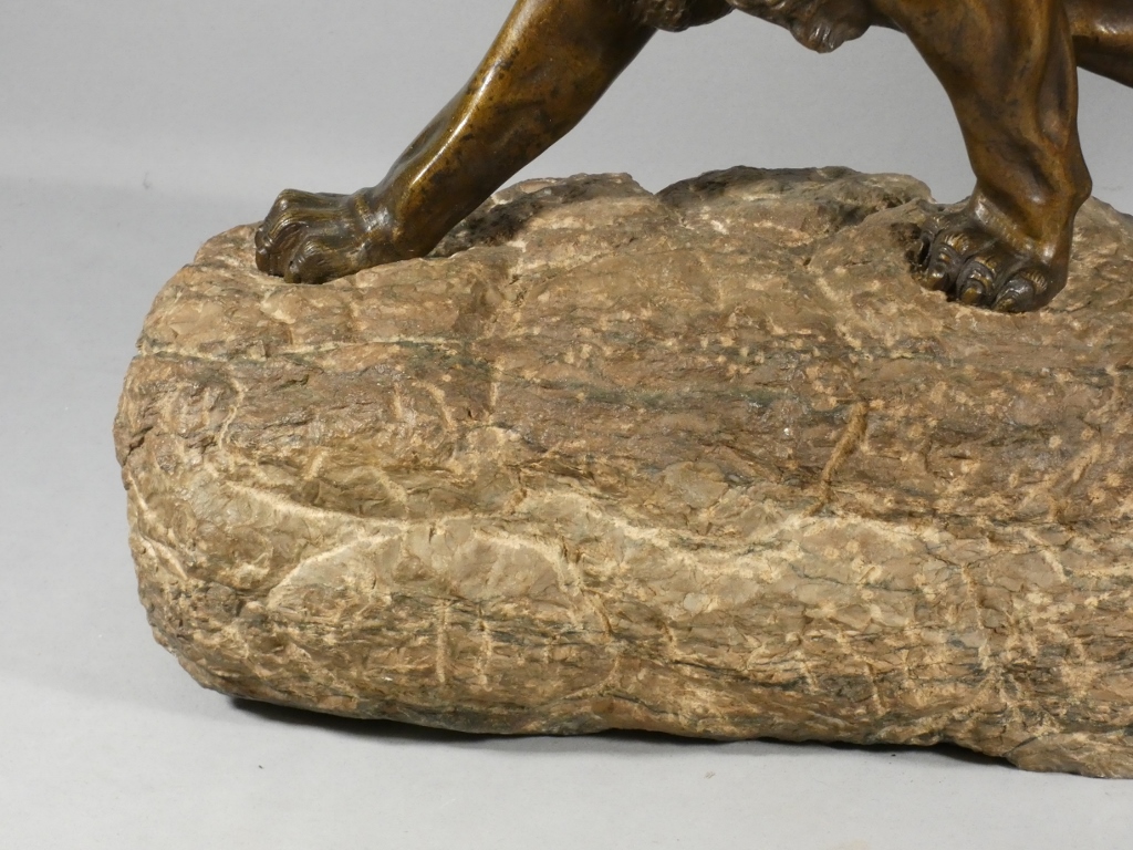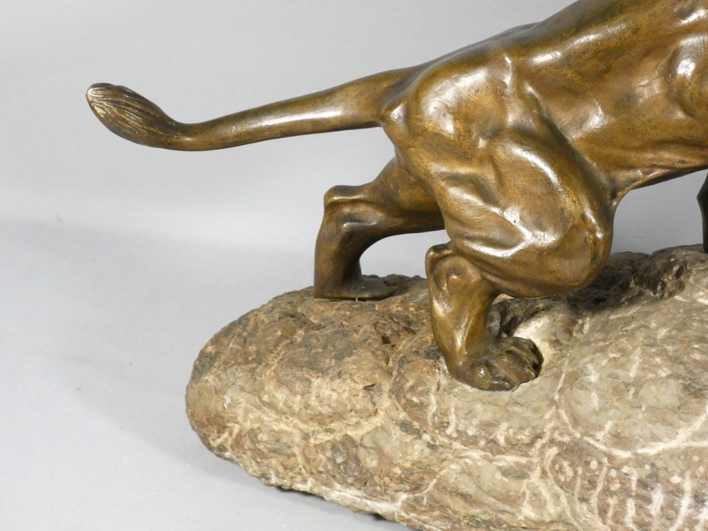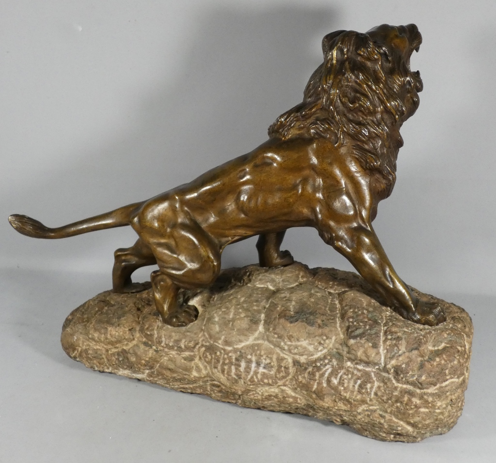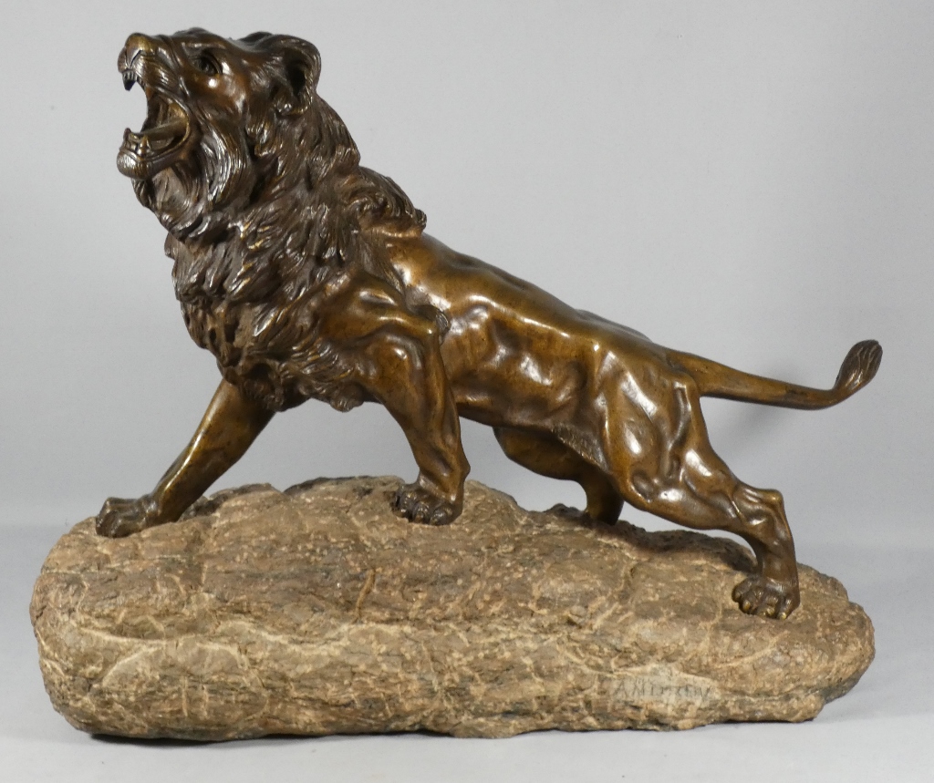 Lion rugissant, sculpture animalière en bronze et marbre des Pyrénées, par James Andrey