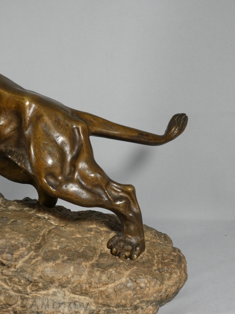 Le fauve est représenté avec toute sa force et prestance, avec des muscles tendus et saillants.