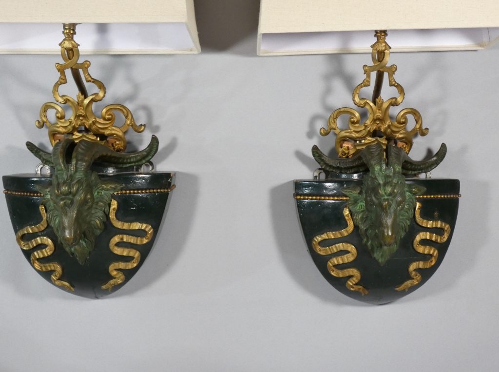 Paire d’appliques aux béliers de style Napoléon III en bois et bronze