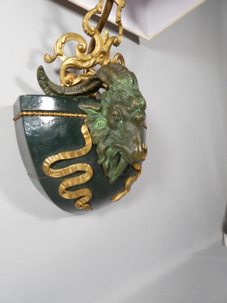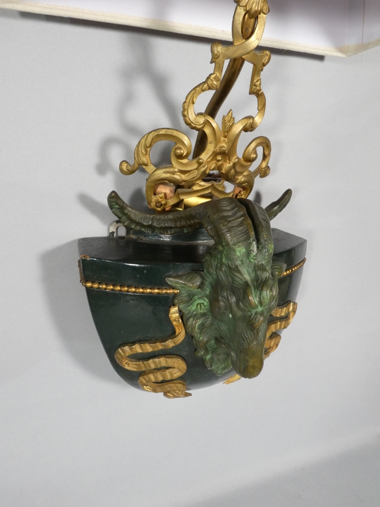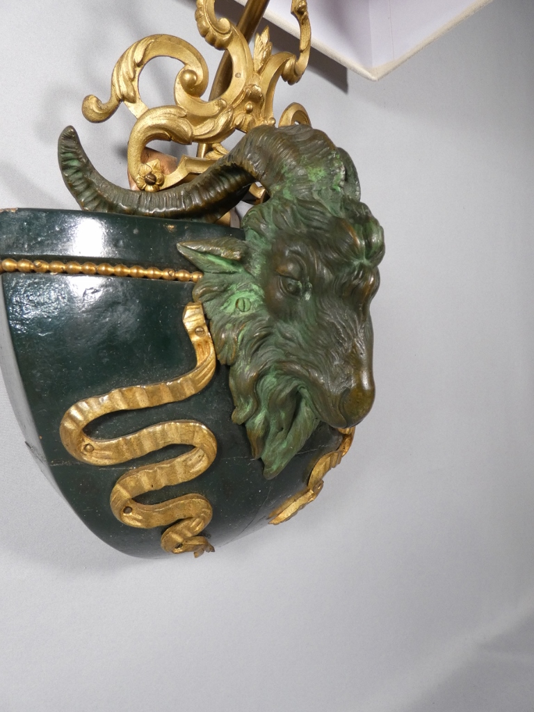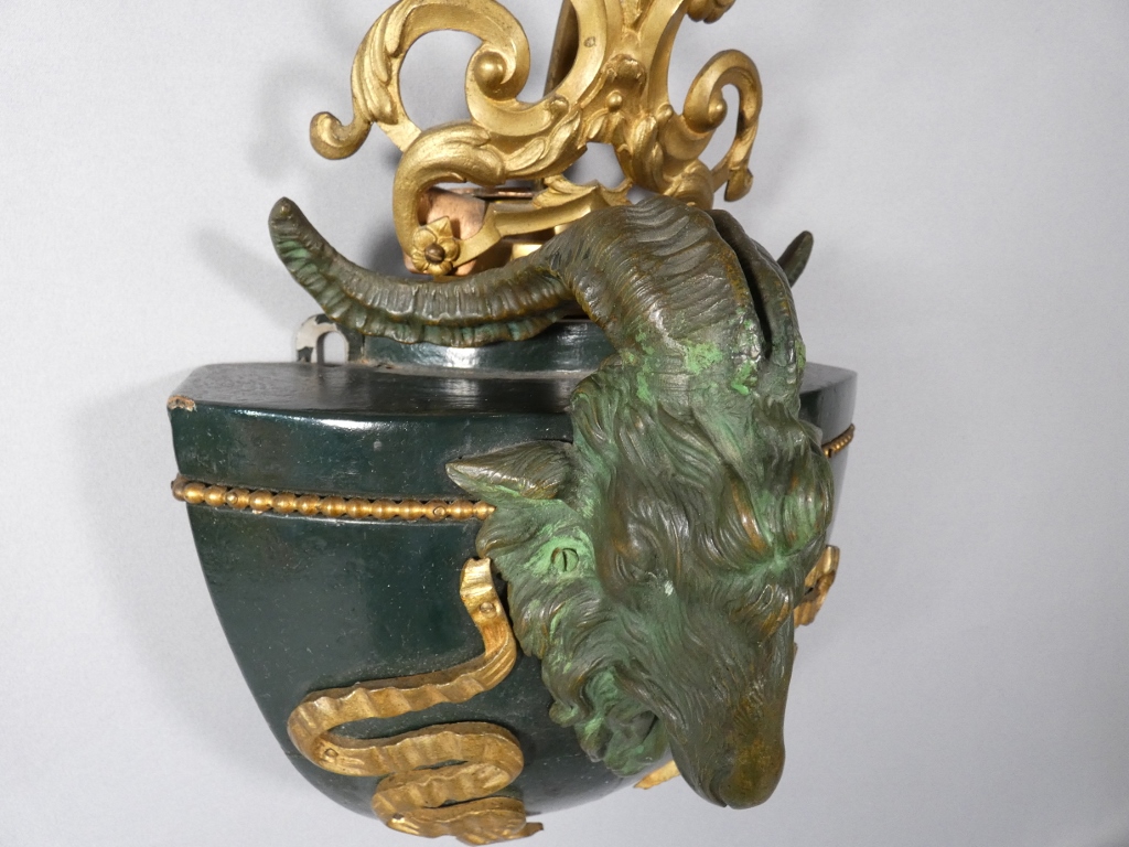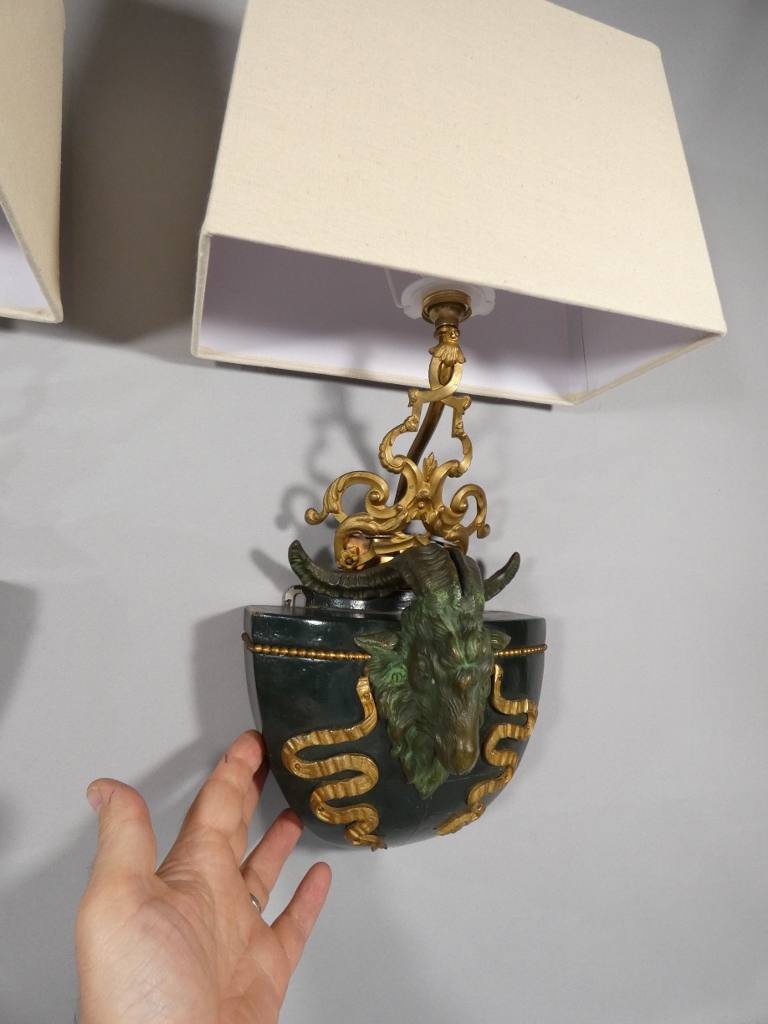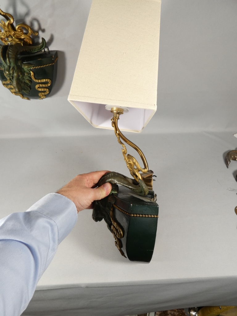 Sur une console en demi lune en bois peint en vert, une imposante tête de bélier en bronze patiné orne ces appliques.