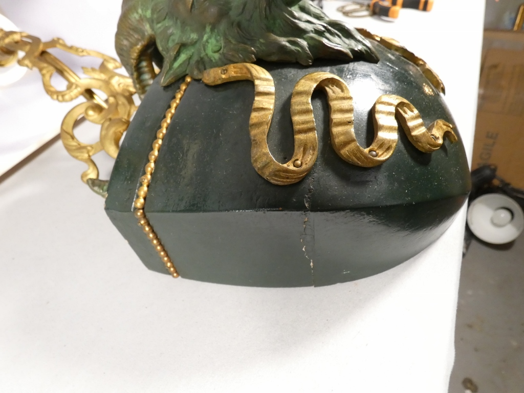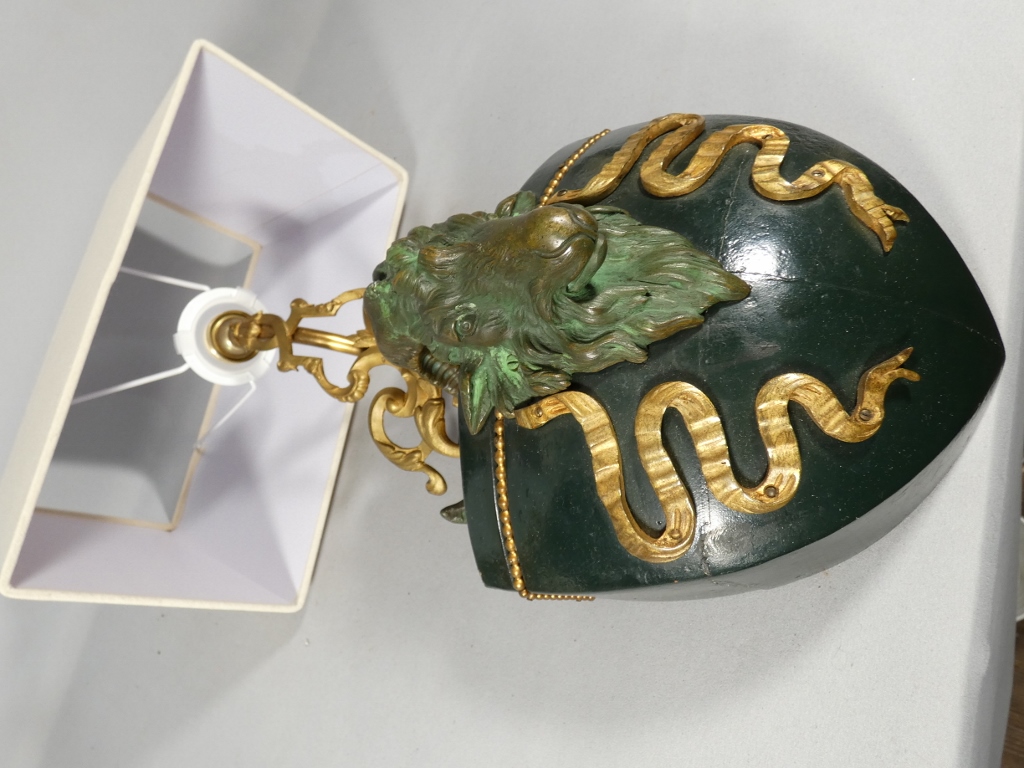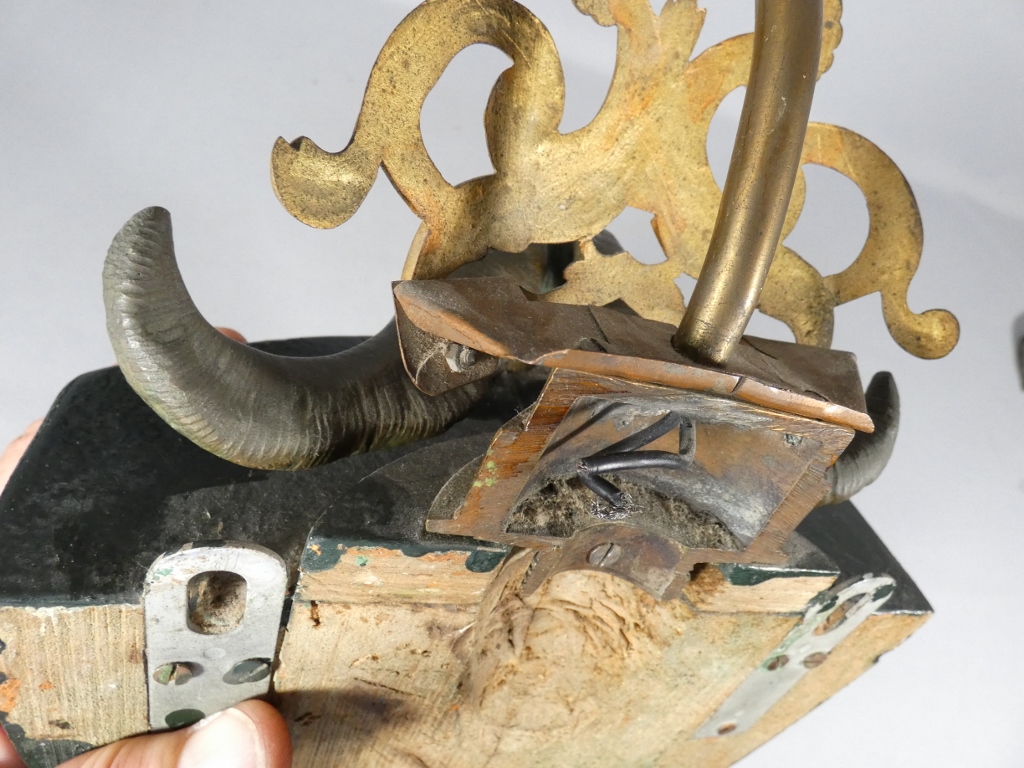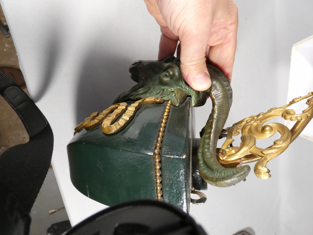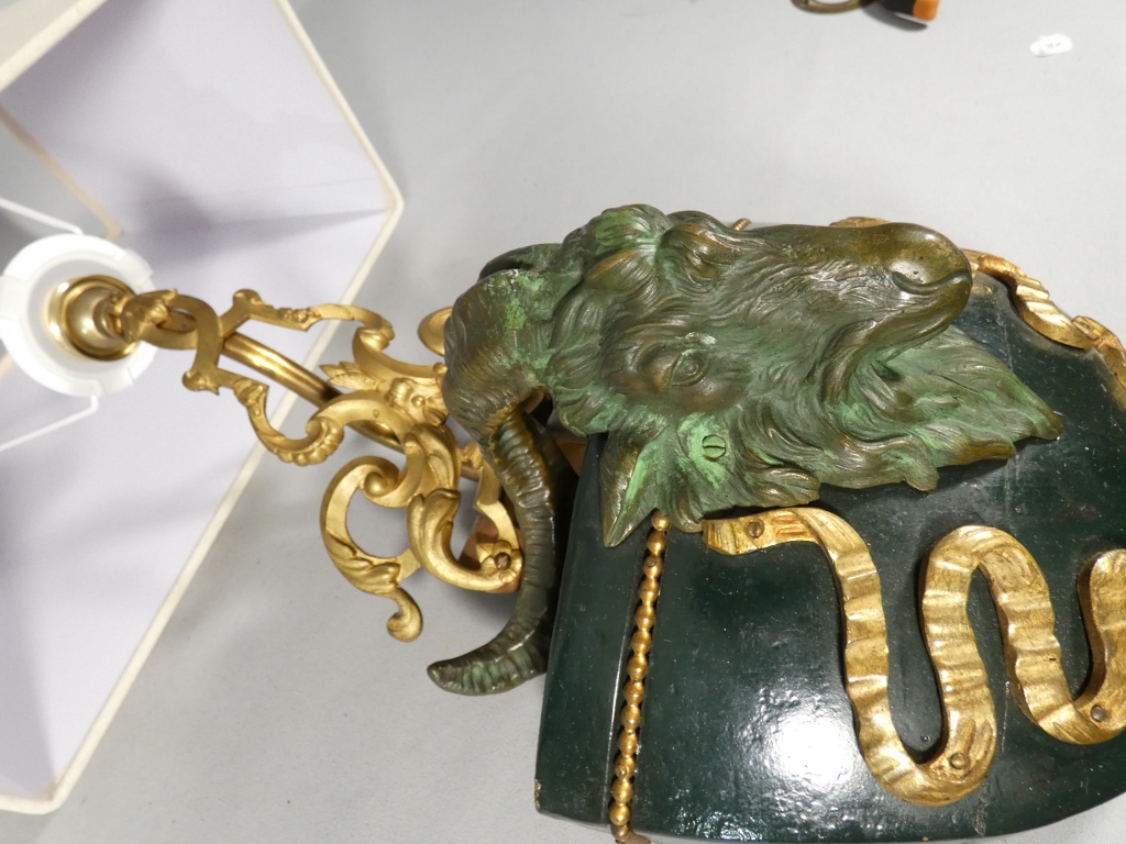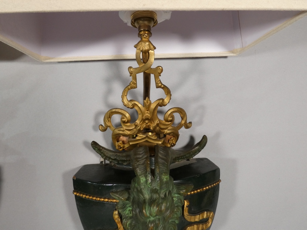 Sur une console en demi lune en bois peint en vert, une imposante tête de bélier en bronze patiné orne ces appliques.