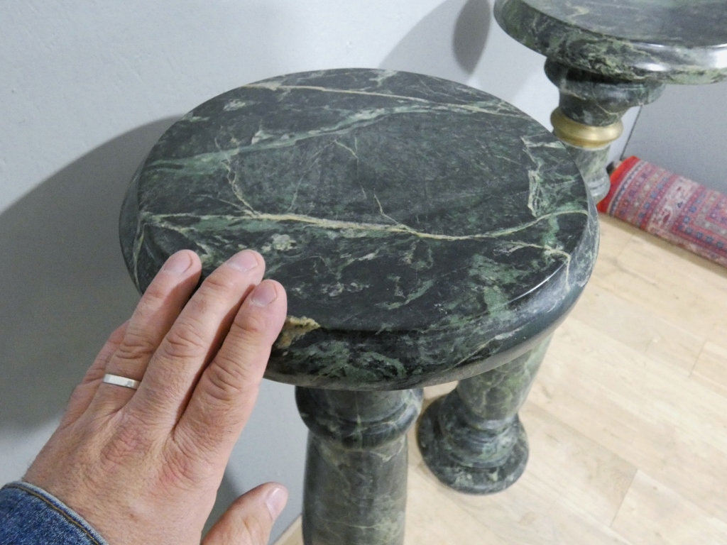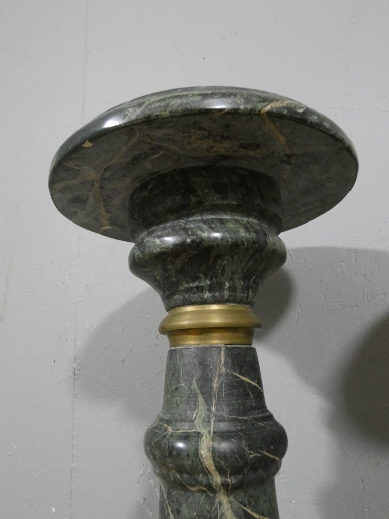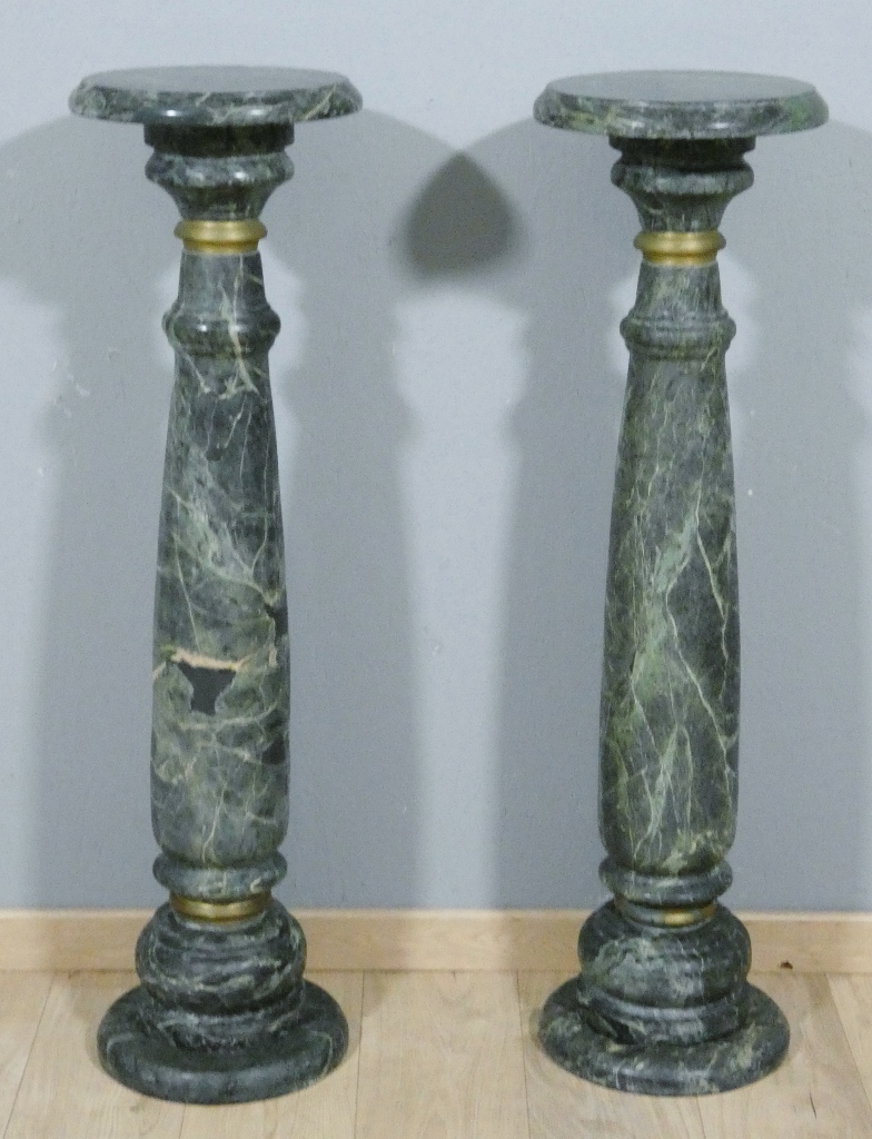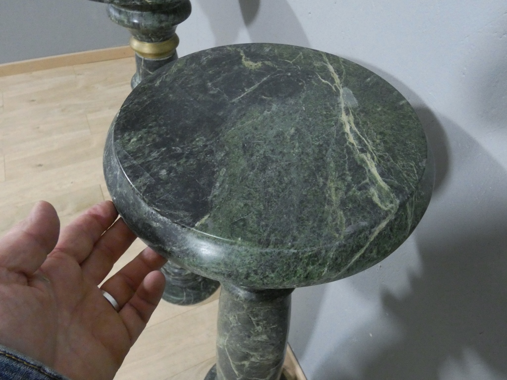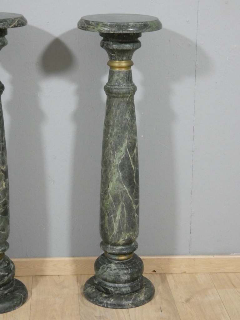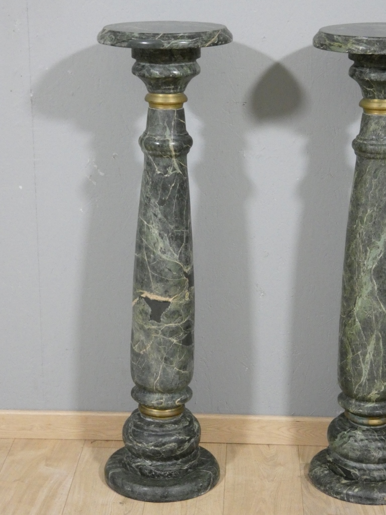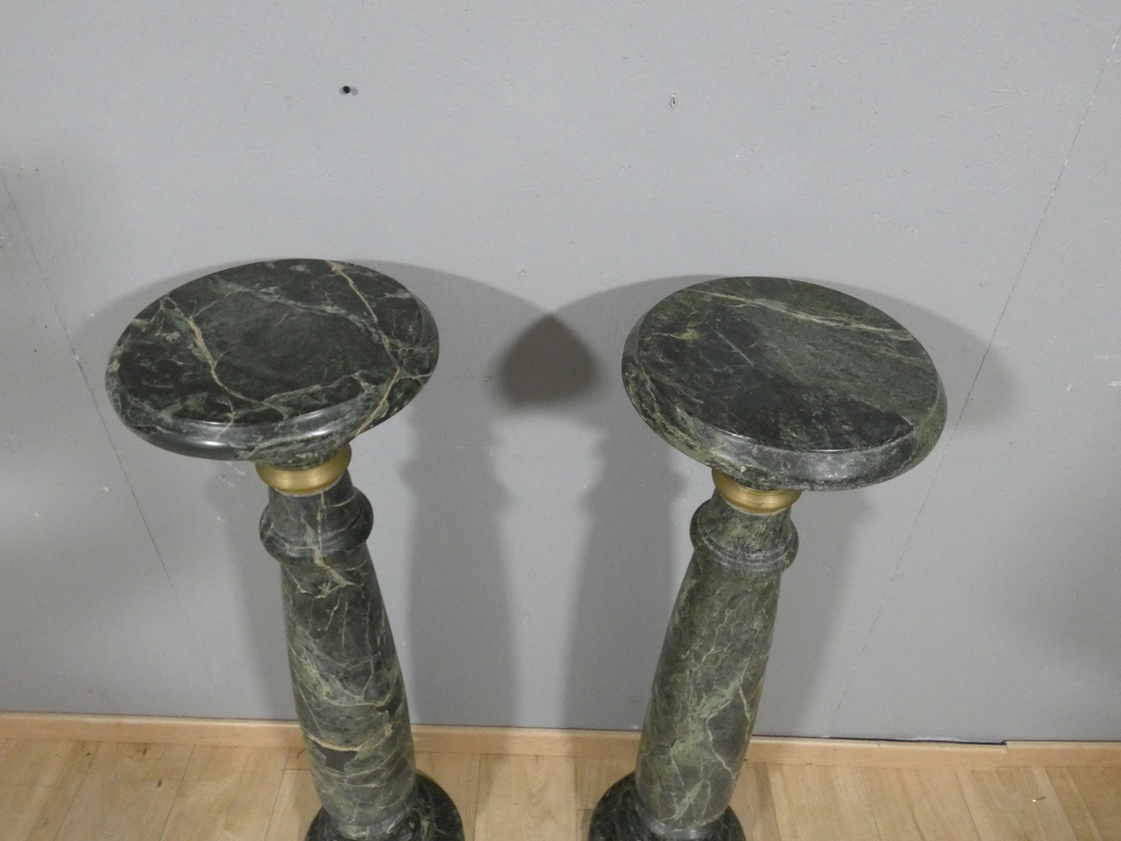 Paire de colonnes de présentation en marbre vert et laiton, époque milieu XX ème